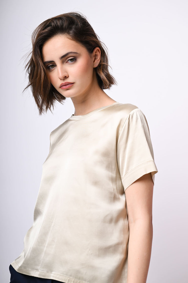 T-shirt regular-fit in raso di viscosa stretch beige con scollo tondo e orlo dritto.