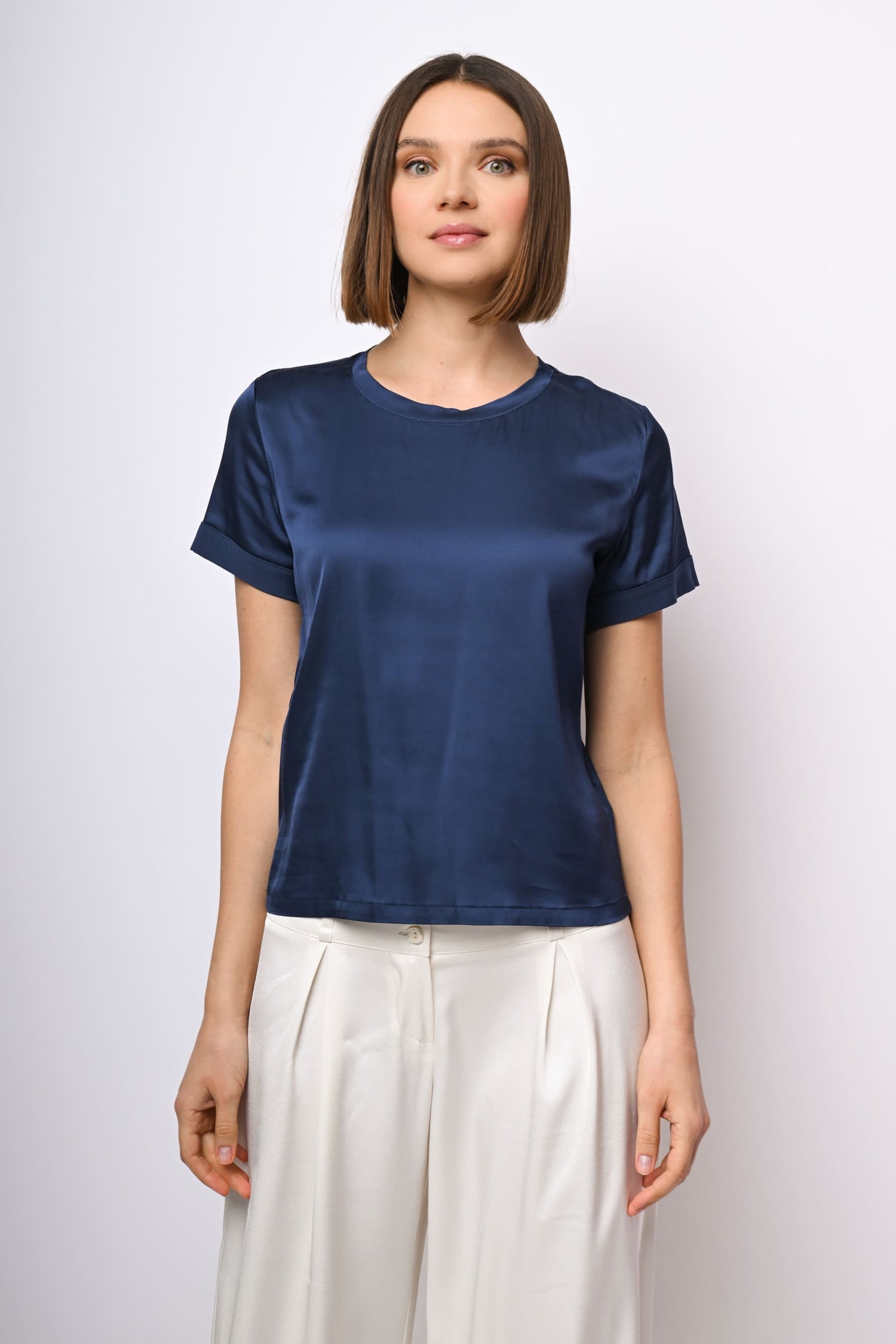 T-shirt regular-fit in raso di viscosa stretch blu navy con scollo tondo e orlo dritto.