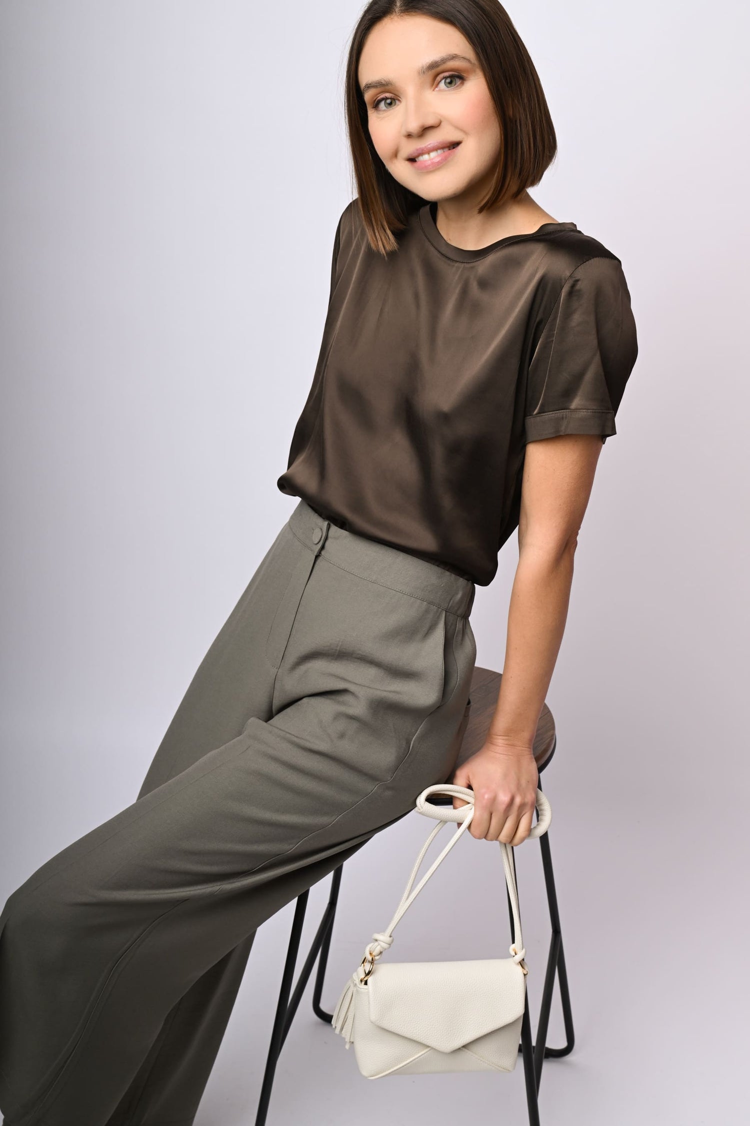 T-shirt regular-fit in raso di viscosa stretch color ebano con scollo tondo e orlo dritto.