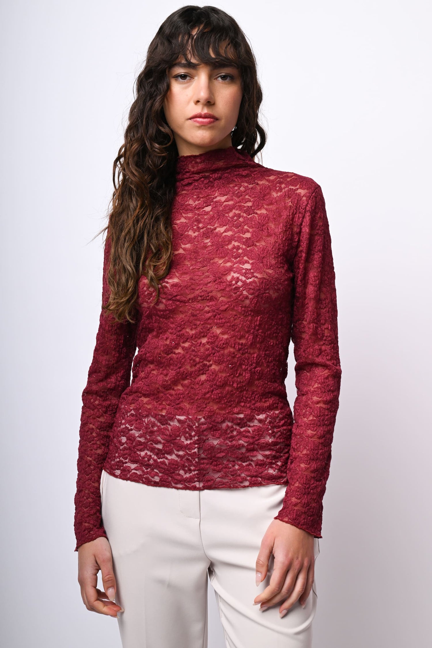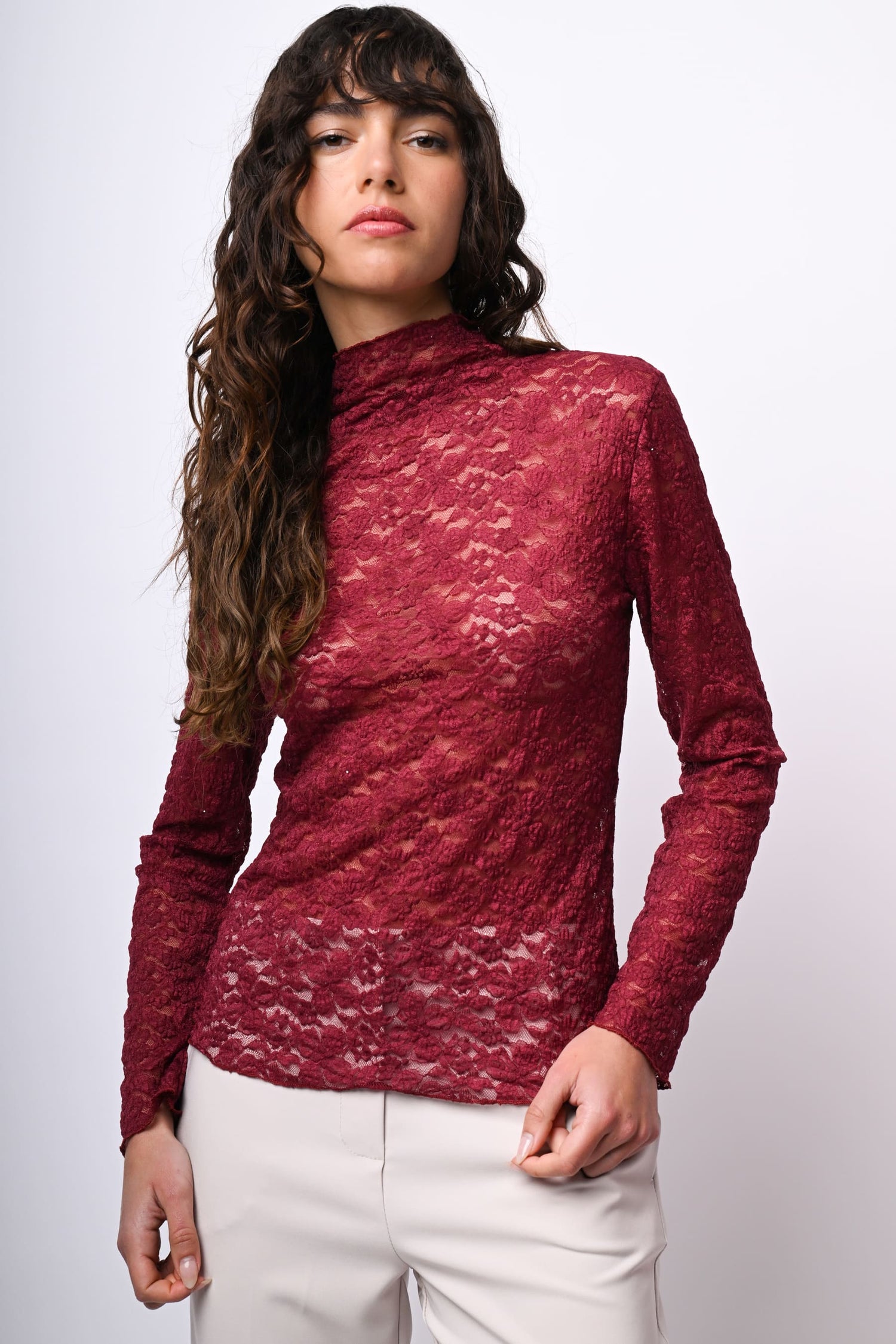 Top a maniche lunghe in pizzo floreale bordeaux leggermente trasparente con scollo a cratere e silhouette aderente.