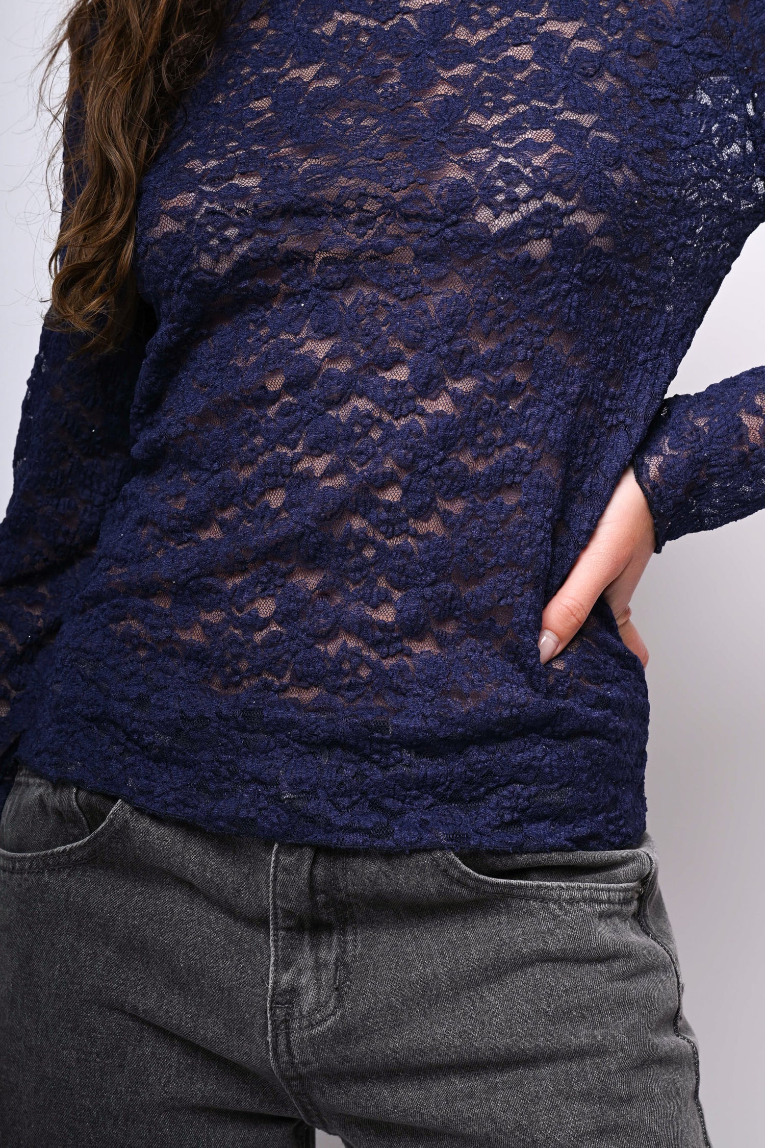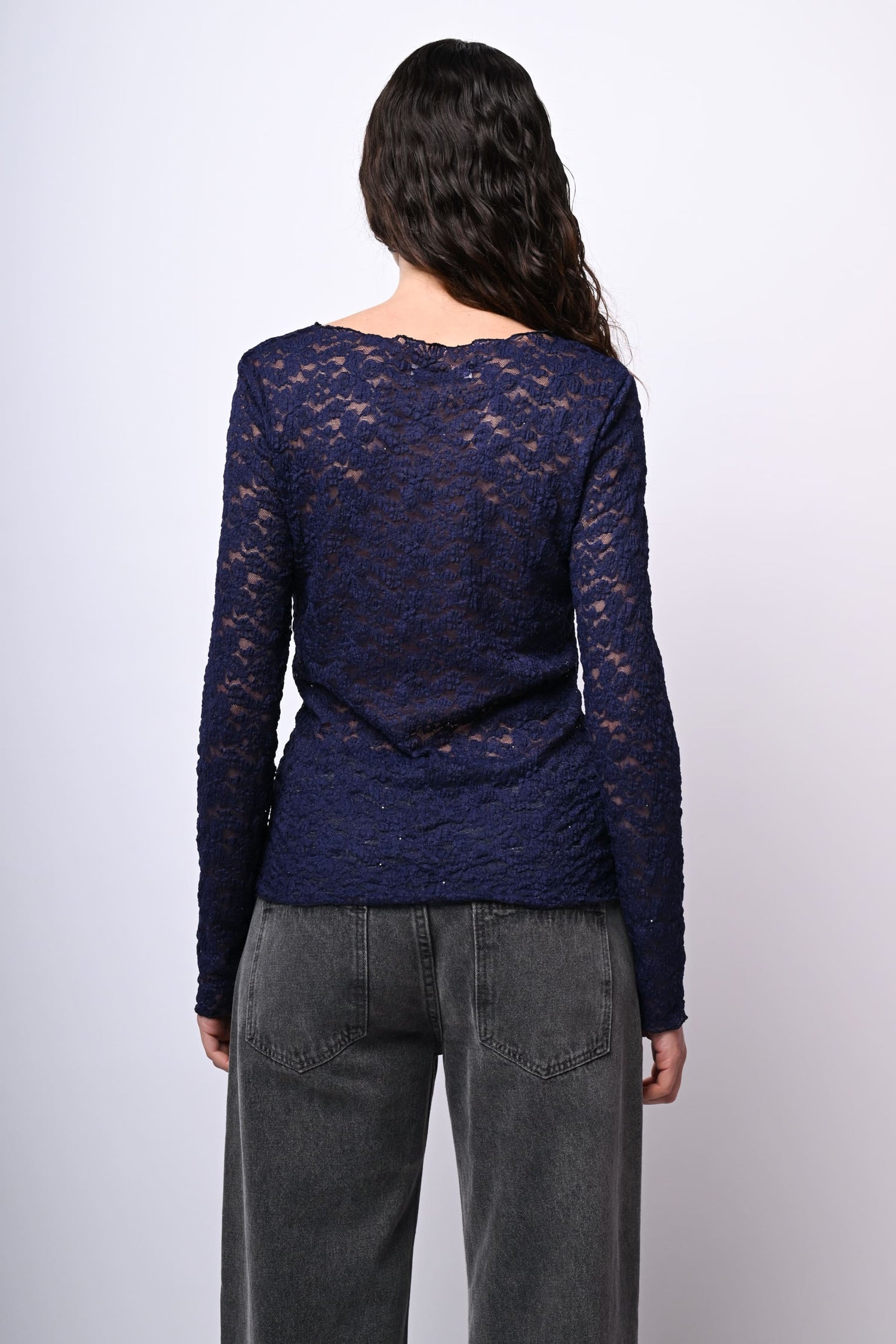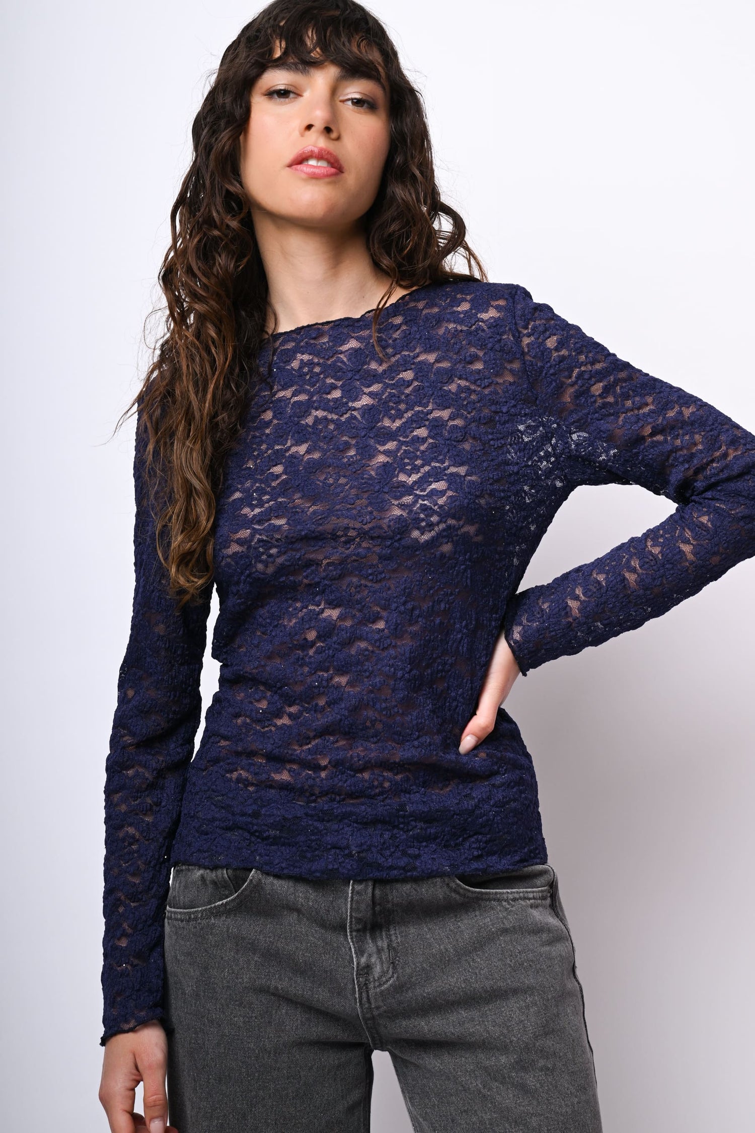 Top a maniche lunghe in pizzo floreale blu leggermente trasparente con scollo a barchetta e silhouette aderente.