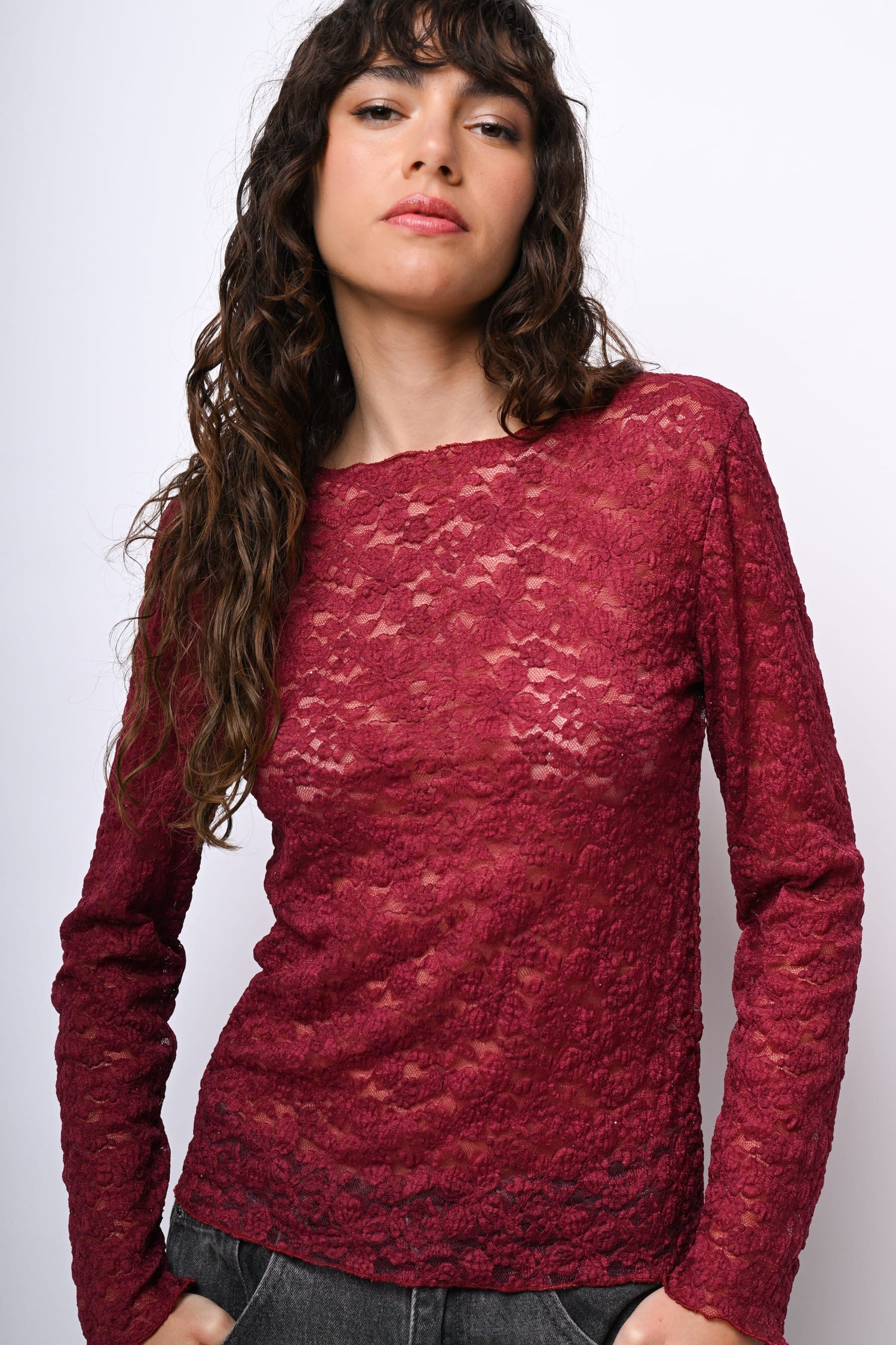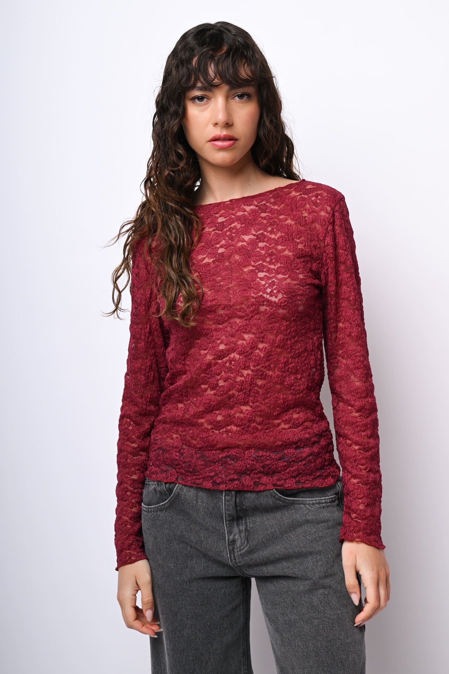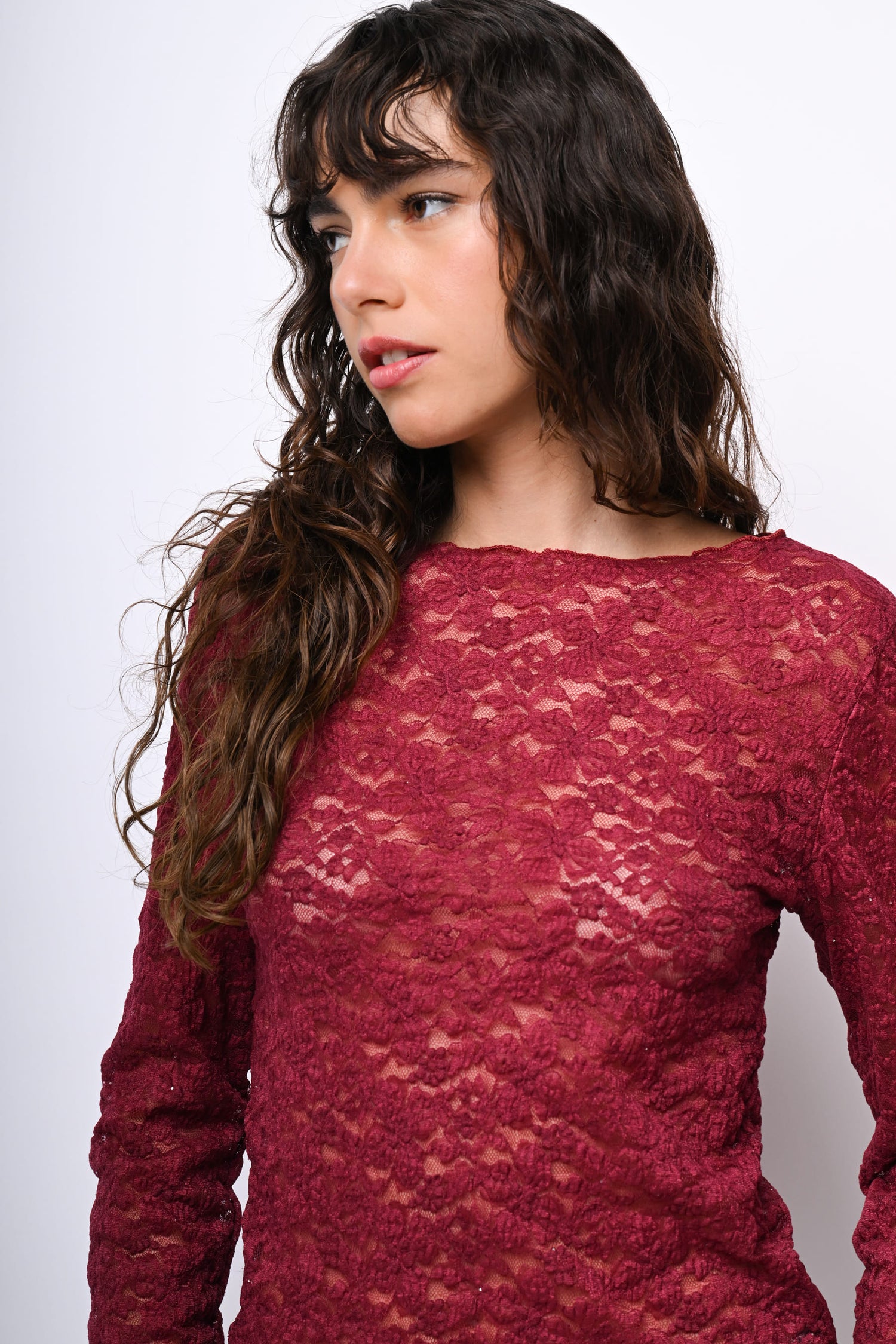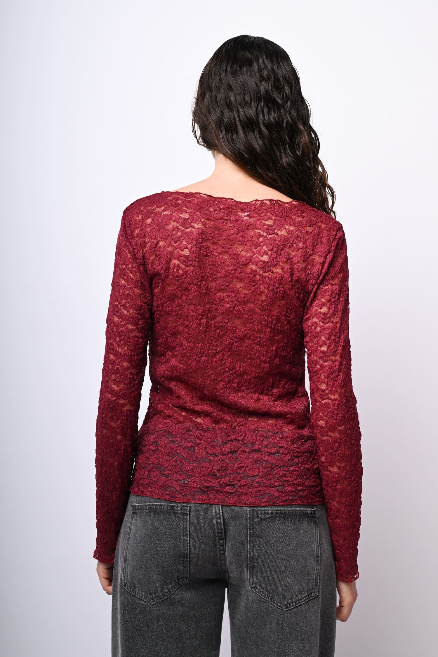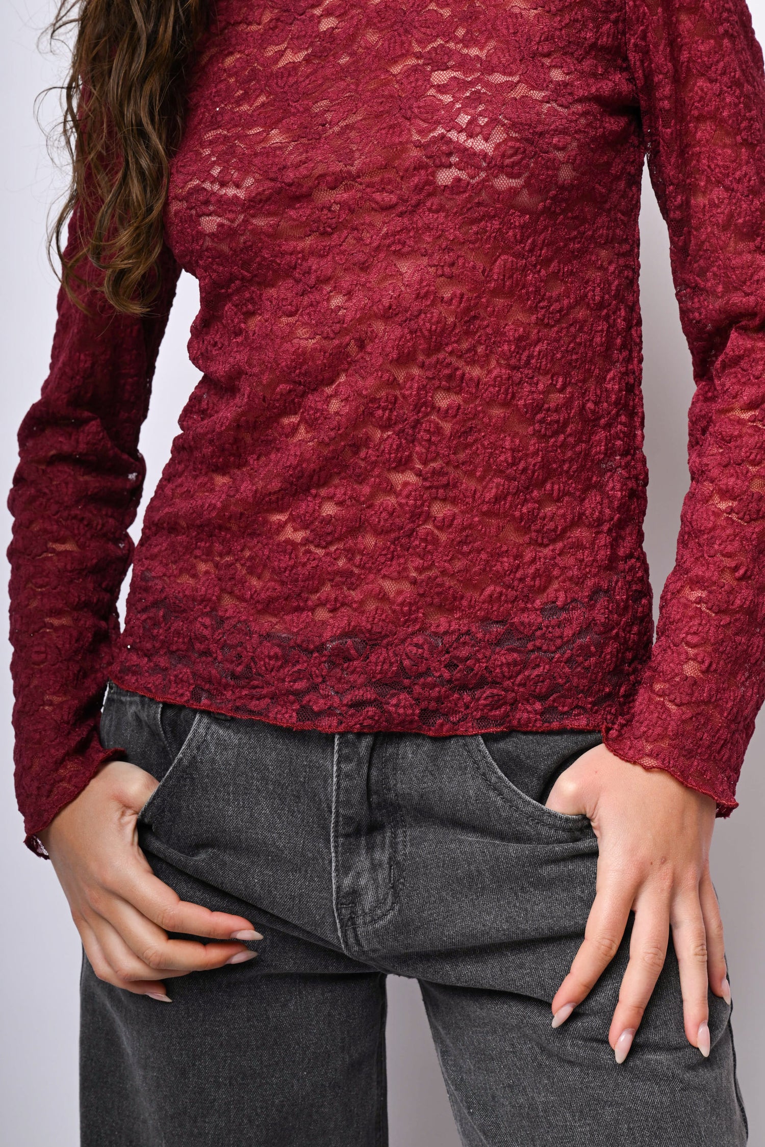 Top a maniche lunghe in pizzo floreale bordeaux leggermente trasparente con scollo a barchetta e silhouette aderente.