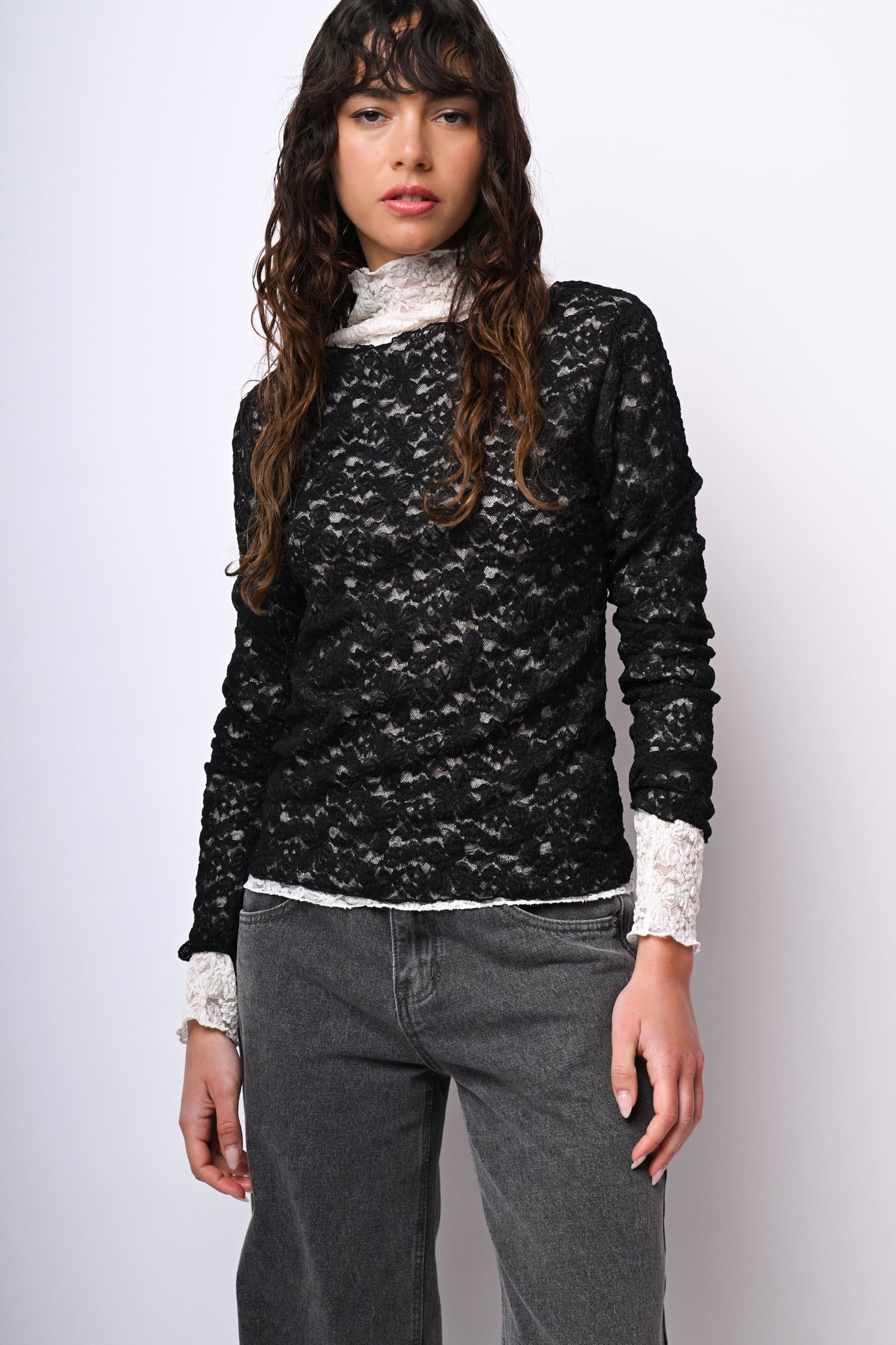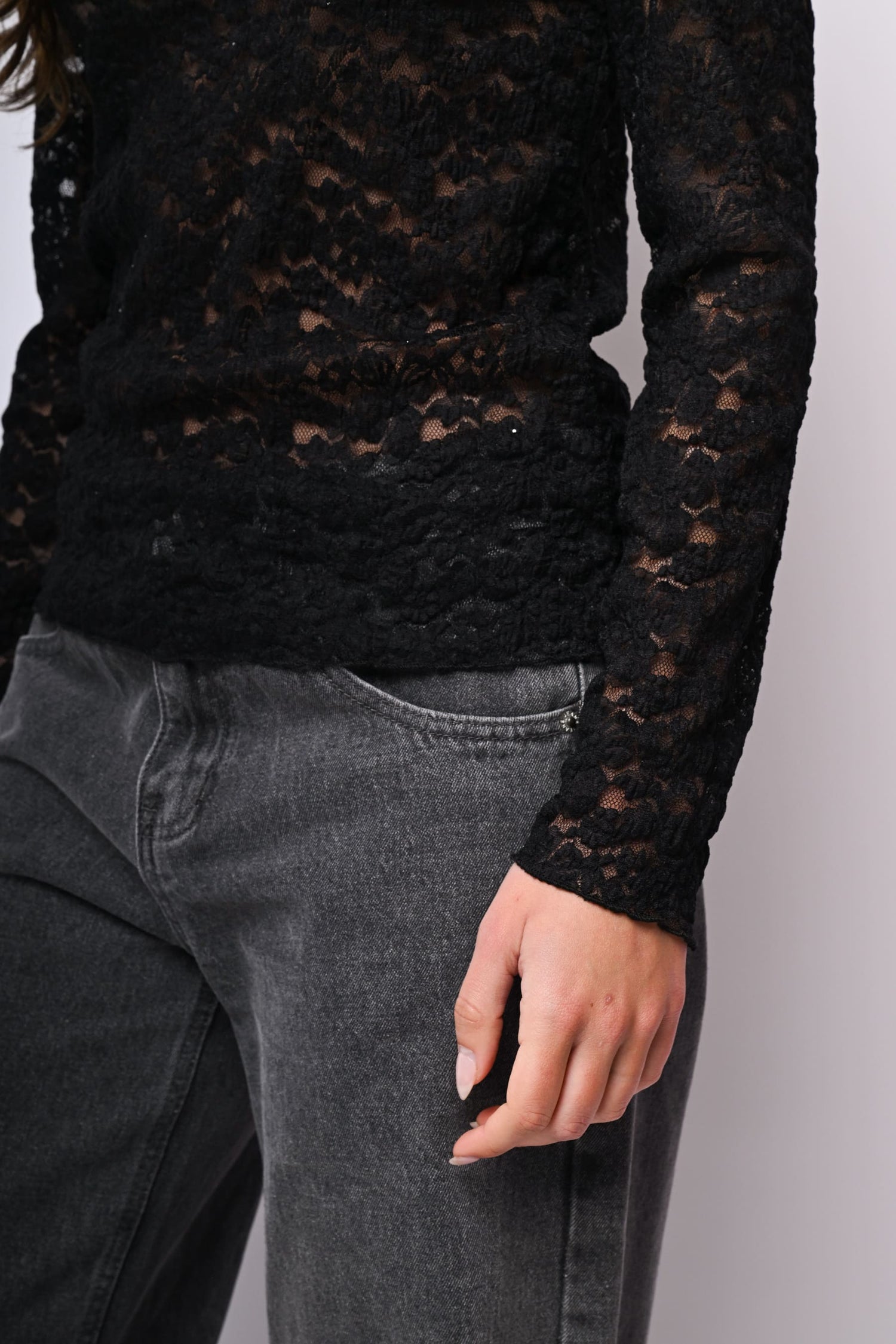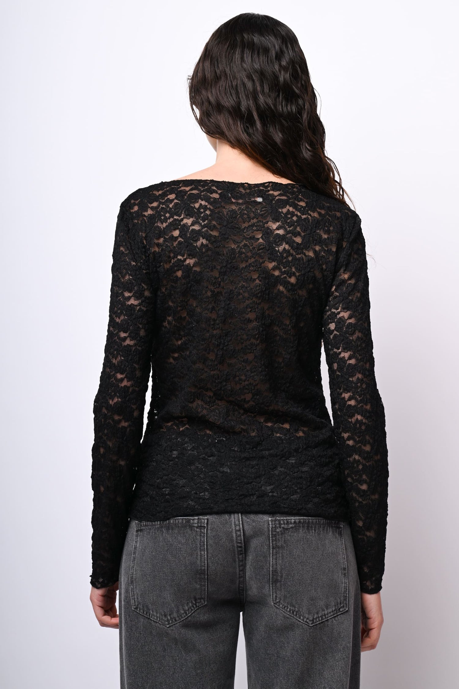 Top a maniche lunghe in pizzo floreale nero leggermente trasparente con scollo a barchetta e silhouette aderente.