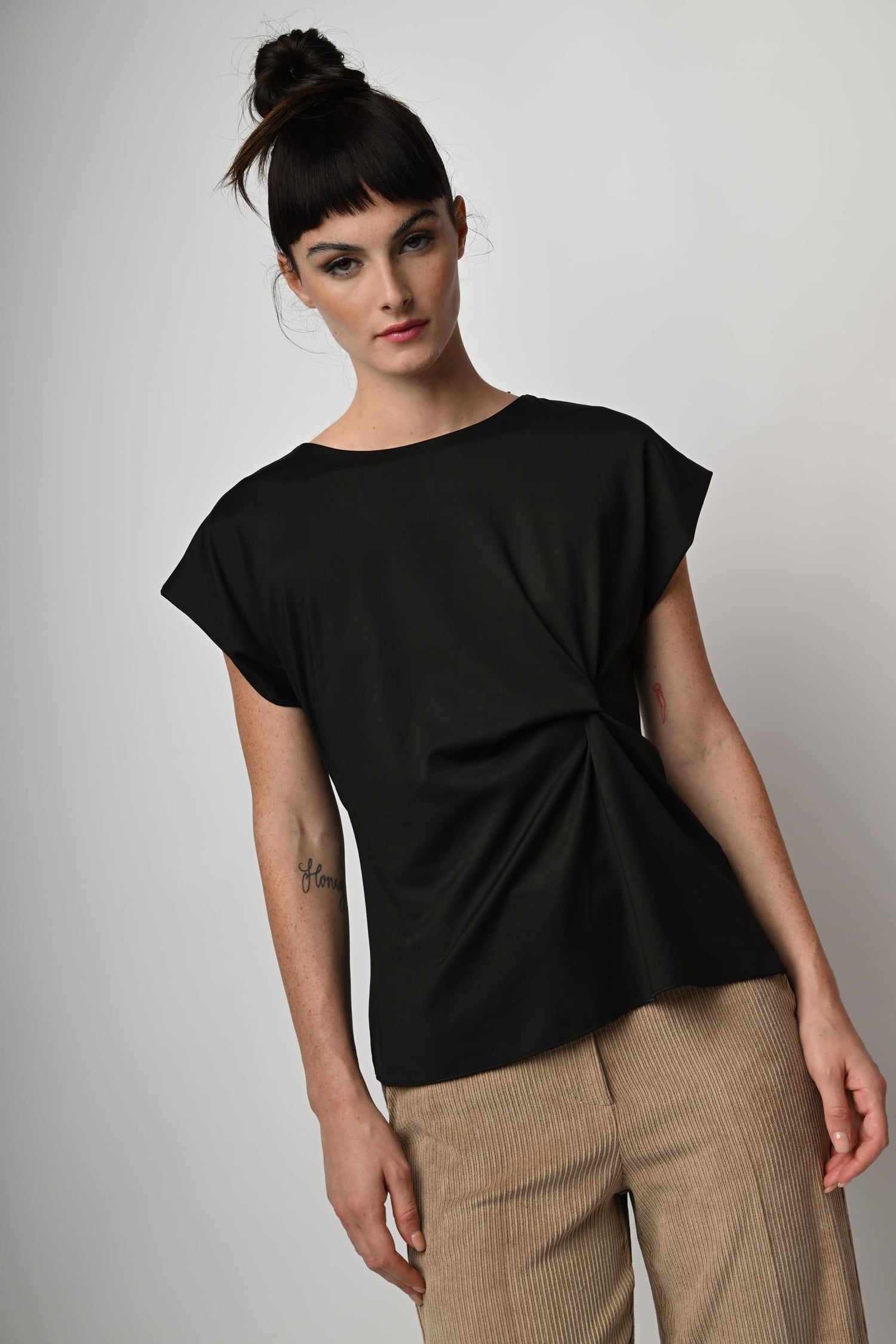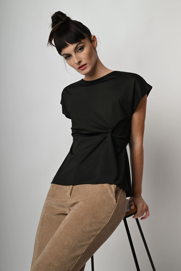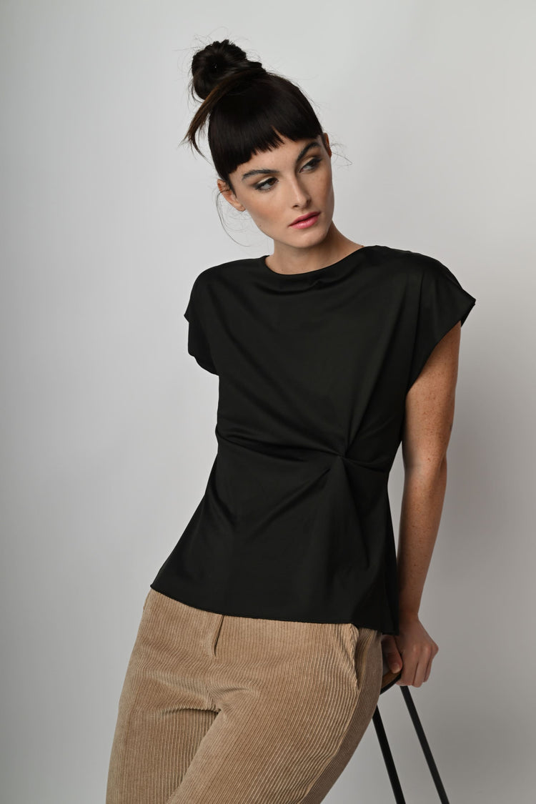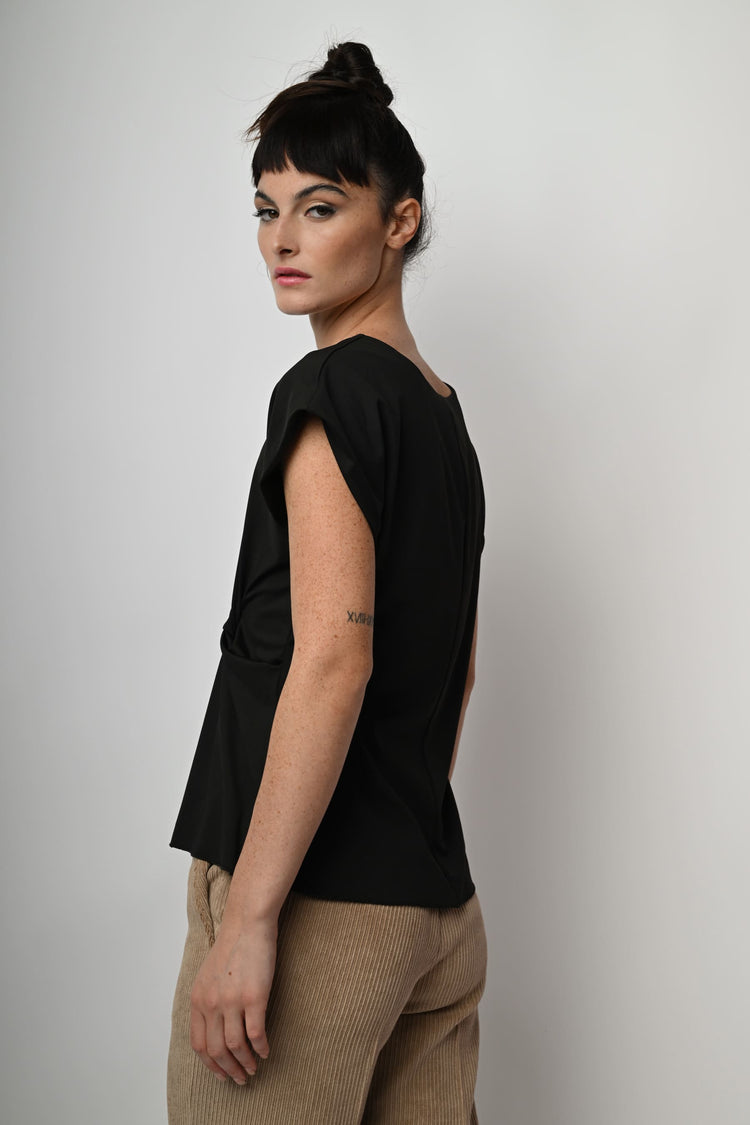 Top in tessuto stretch nero con scollo tondo, maniche ad aletta, drappeggio laterale e orlo stondato.
