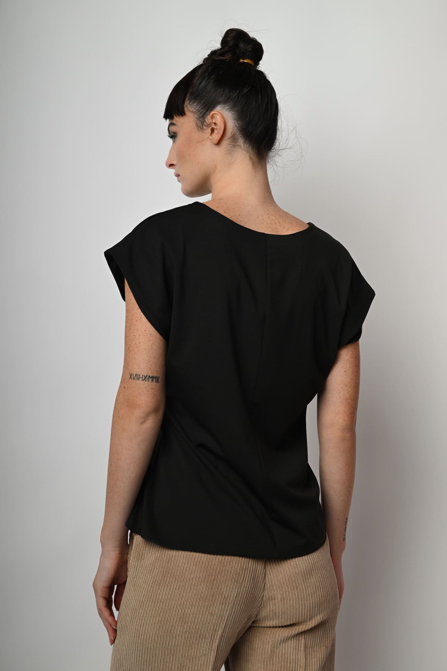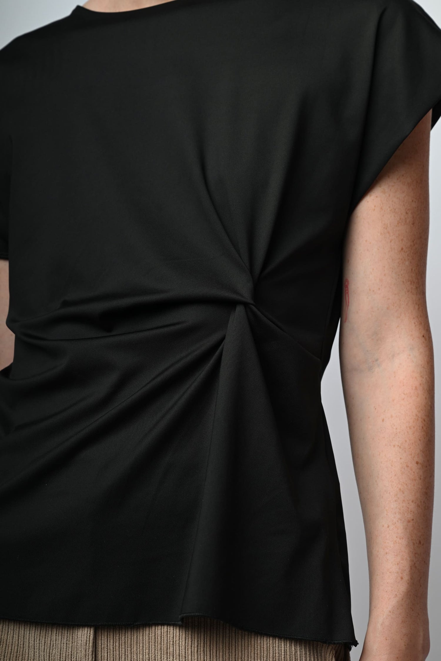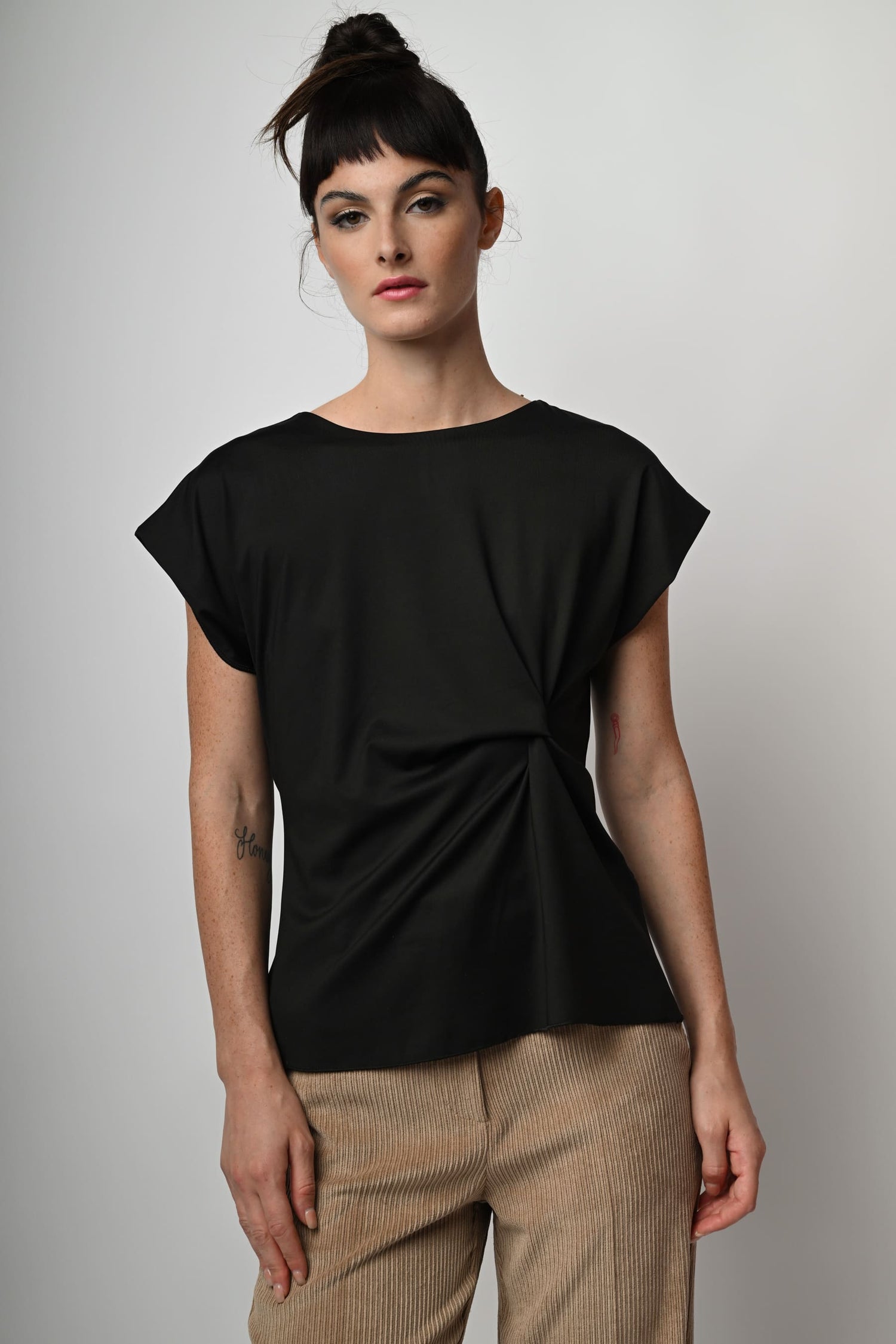 Top in tessuto stretch nero con scollo tondo, maniche ad aletta, drappeggio laterale e orlo stondato.