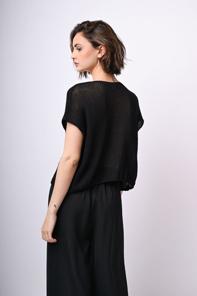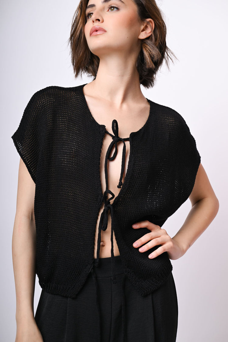 Top in maglia misto cotone nero con scollo arrotondato, maniche corte, tre laccetti da annodare sul davanti e finiture a costine.