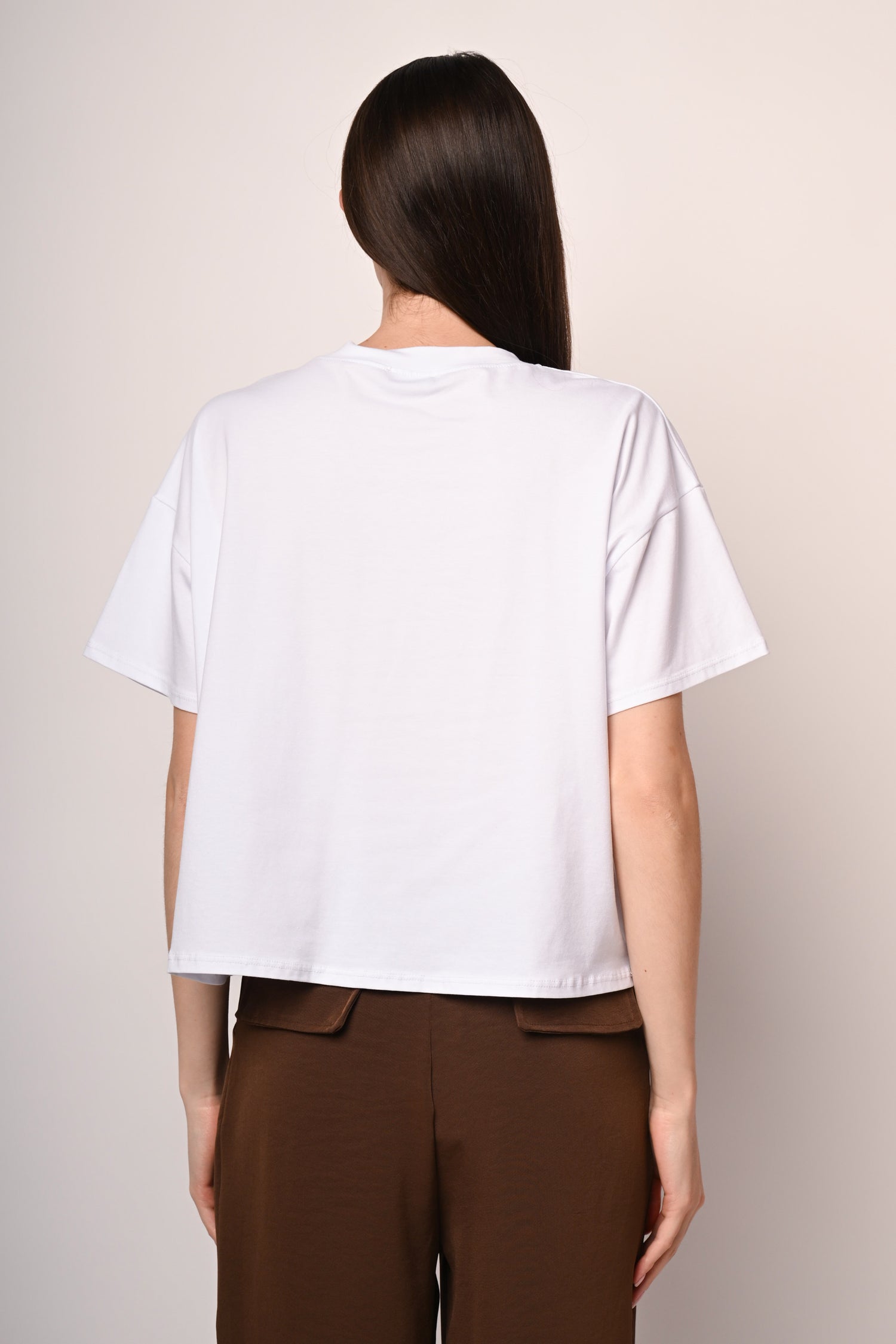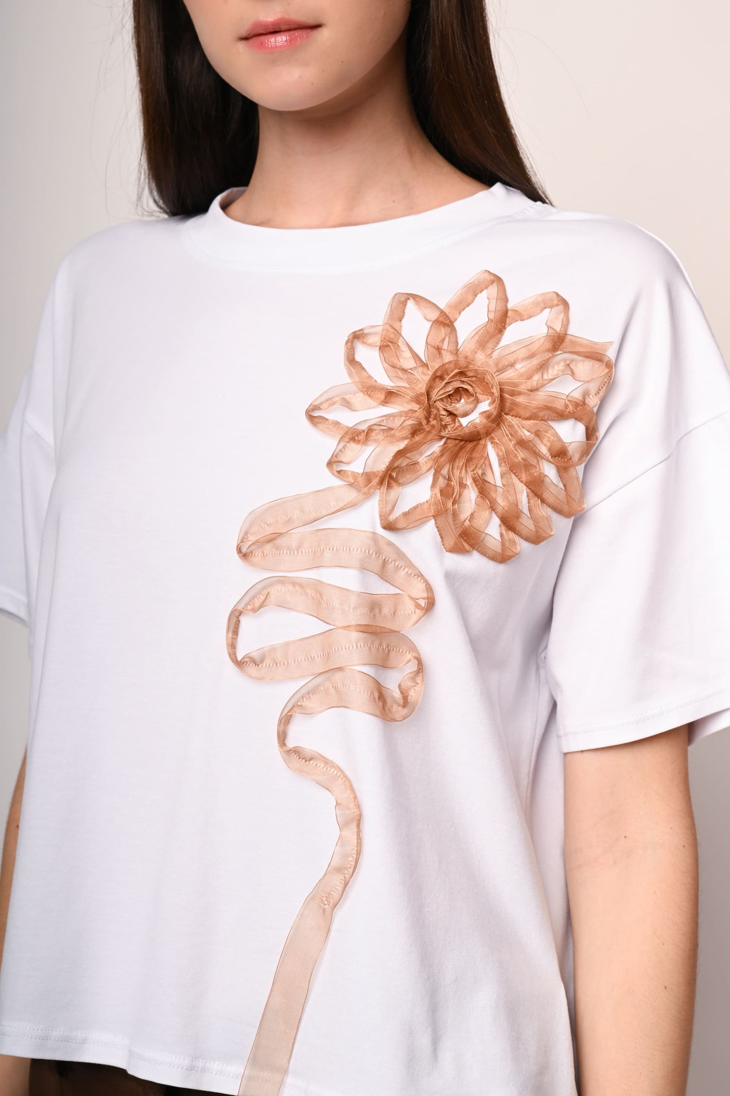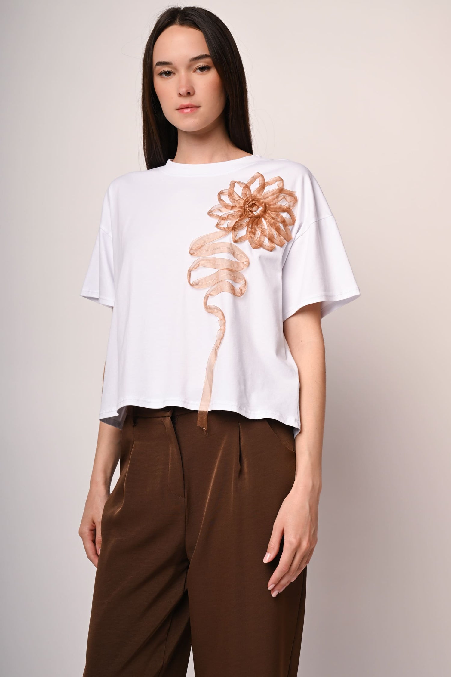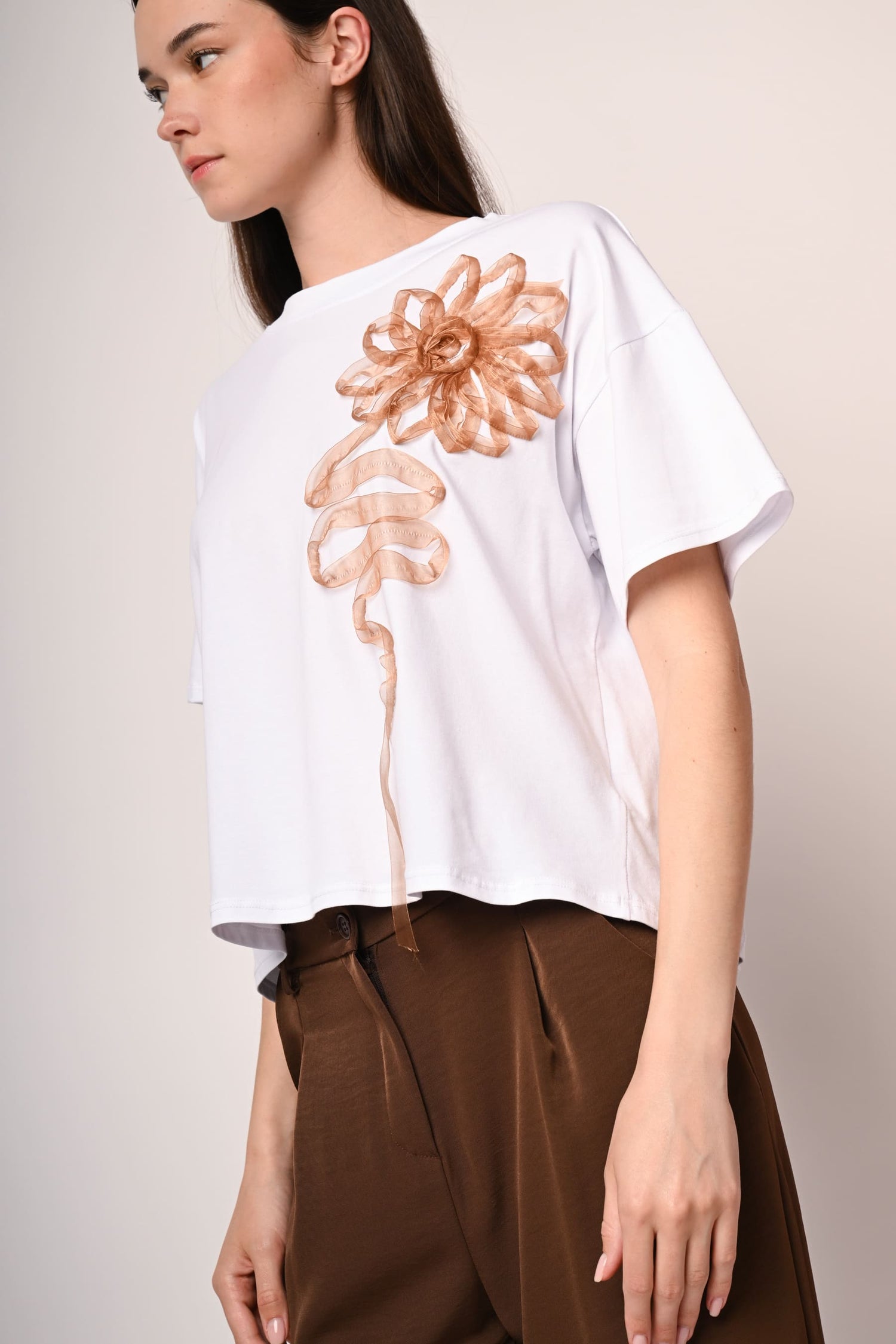 T-shirt boxy-fit in cotone stretch bianco con scollo tondo, spalle scese e applicazione floreale a nastro nuance bronzo.