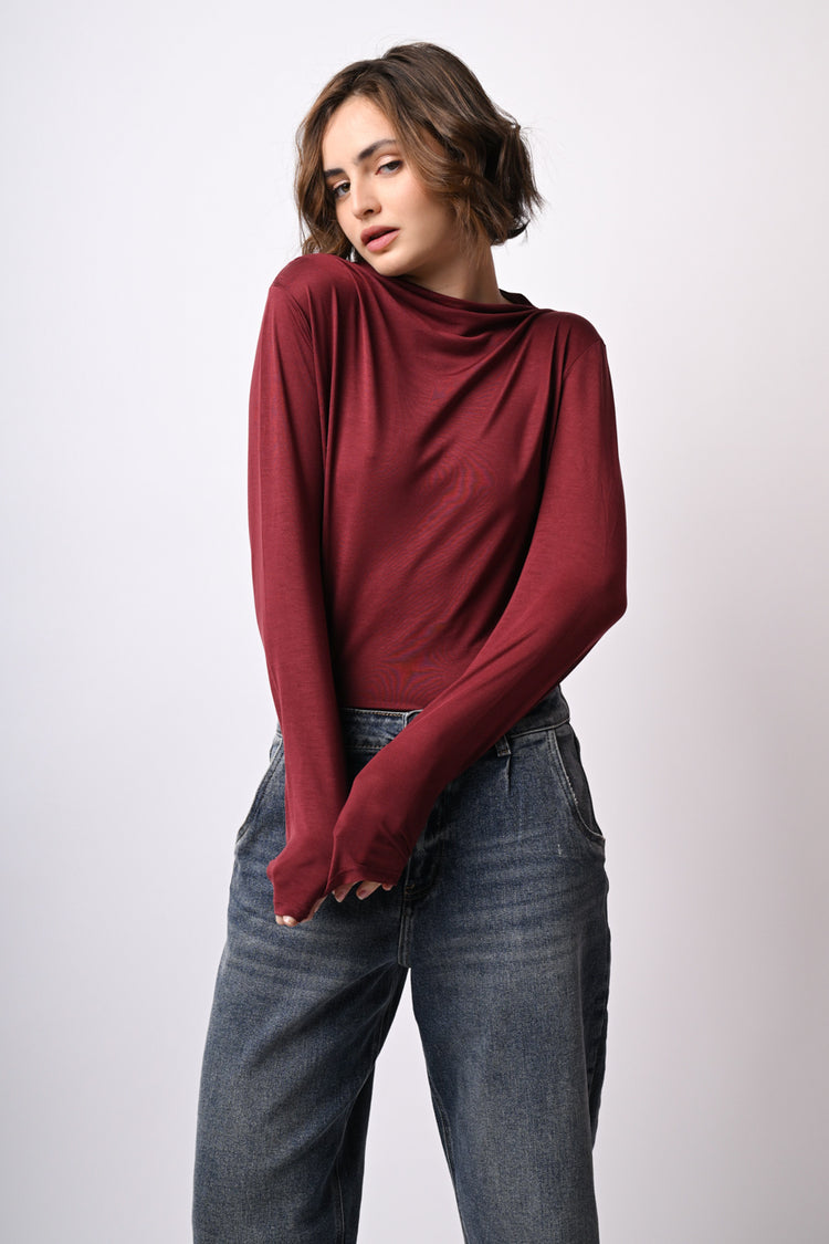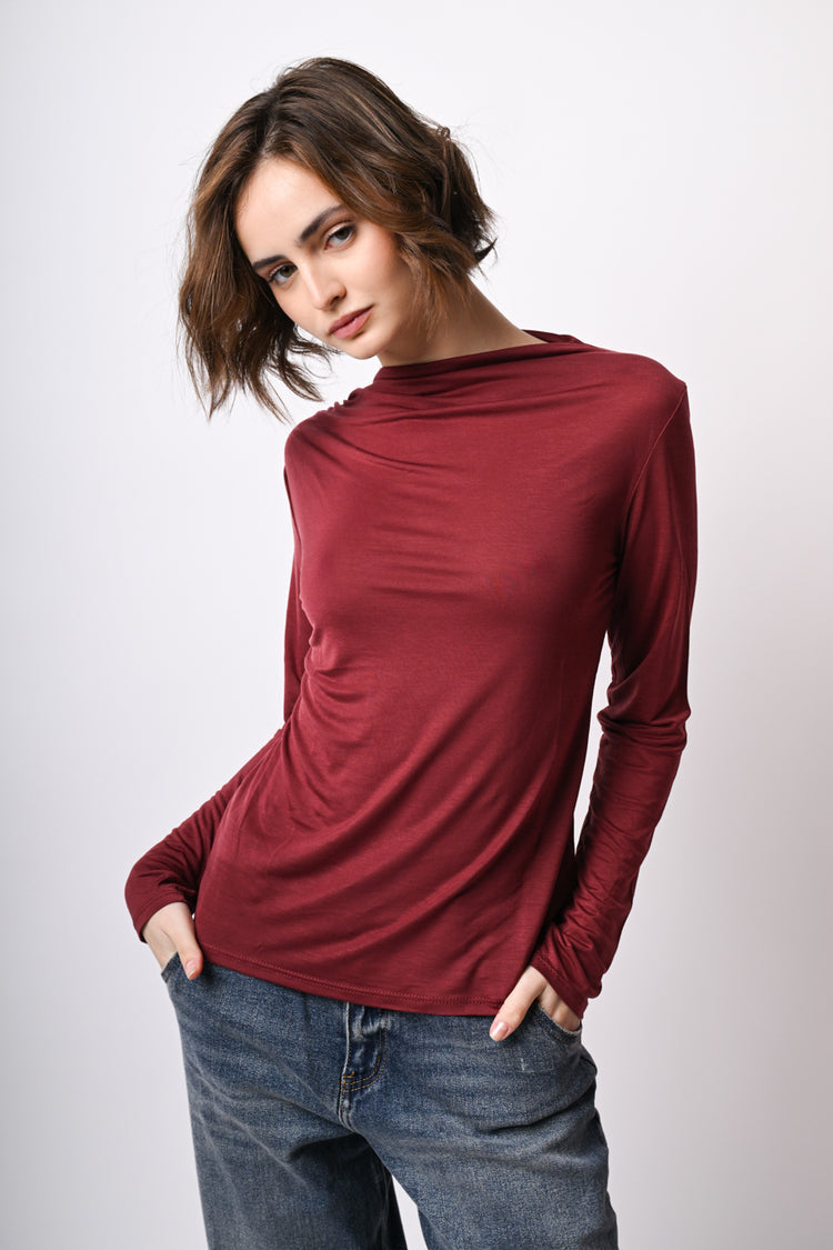 Top a maniche lunghe in lyocell bordeaux con scollo a cratere e silhouette aderente.