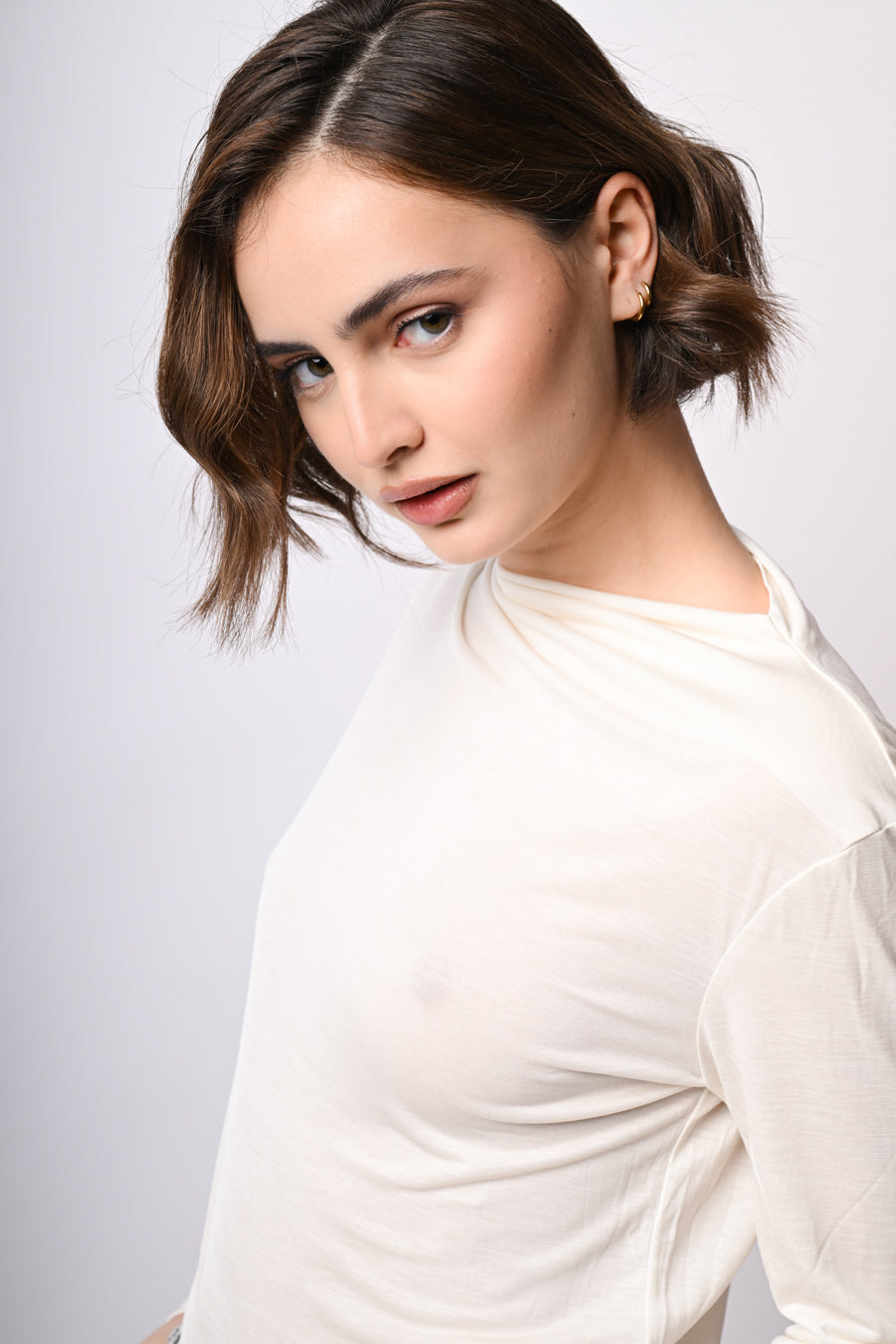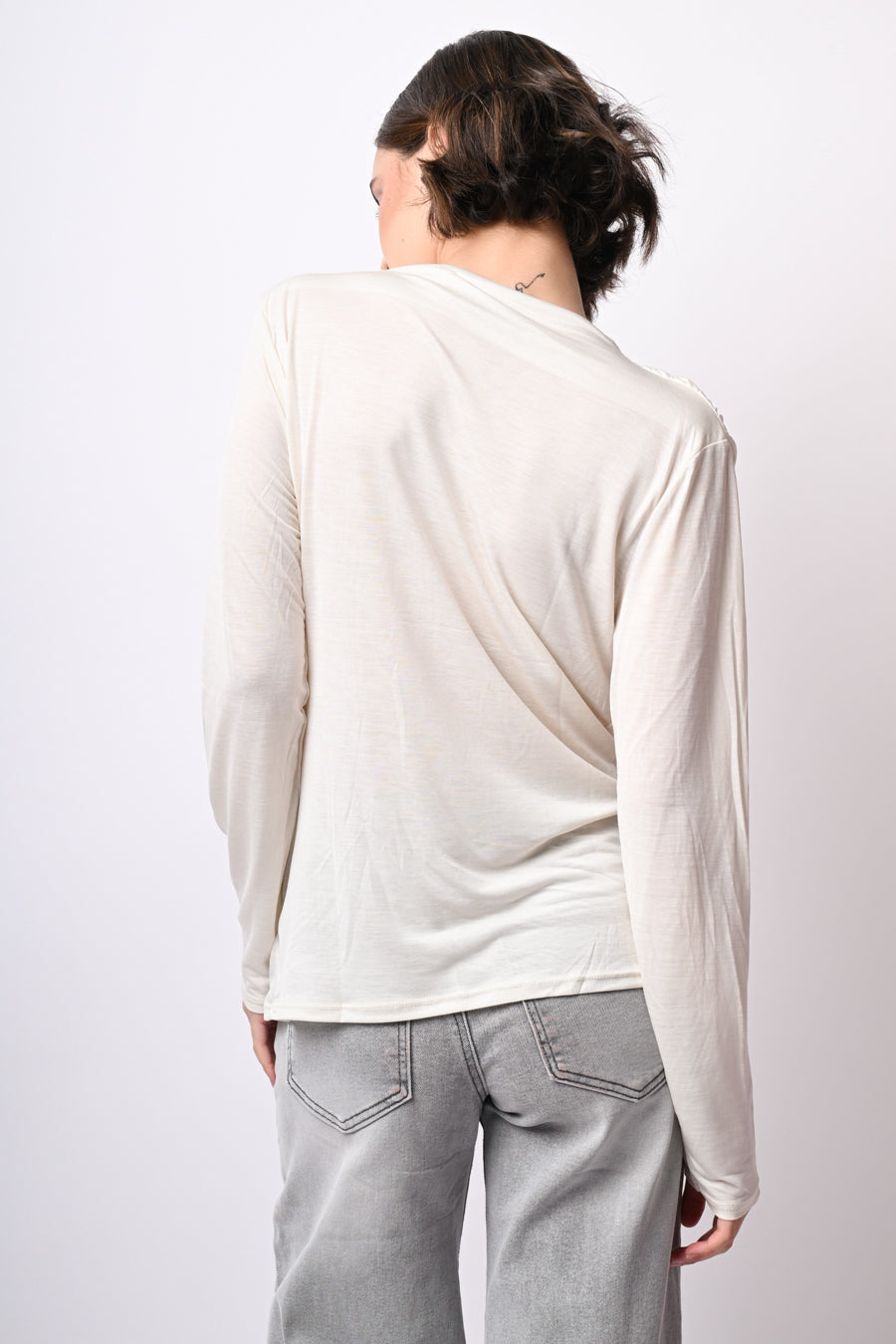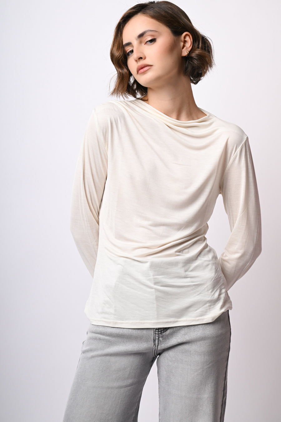 Top a maniche lunghe in lyocell bianco con scollo a cratere e silhouette aderente.