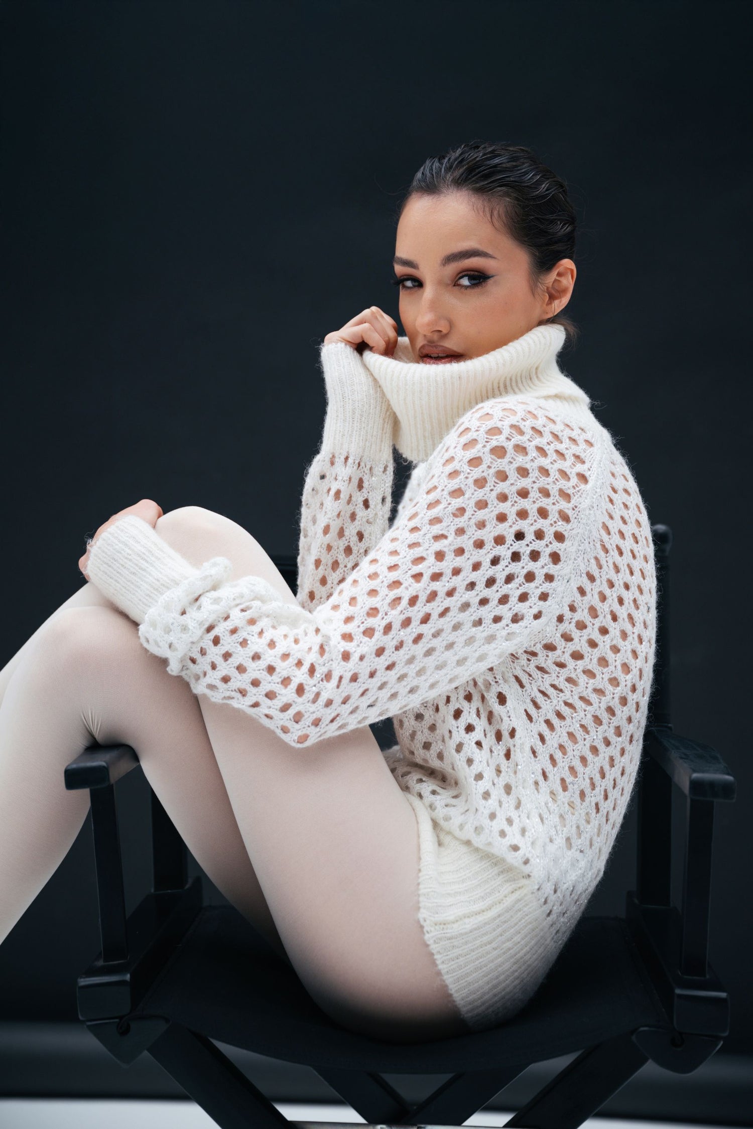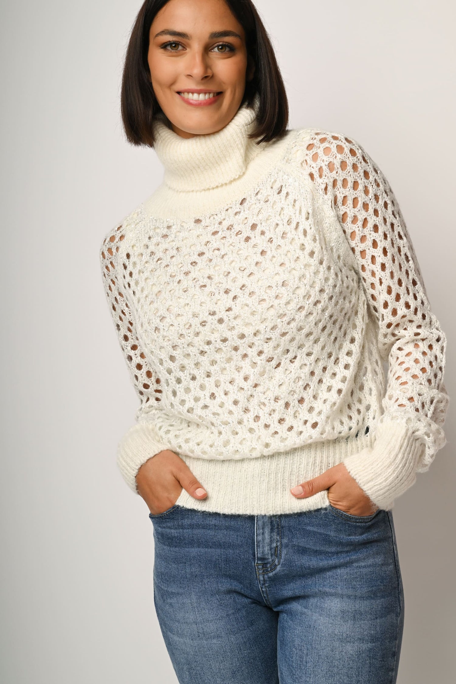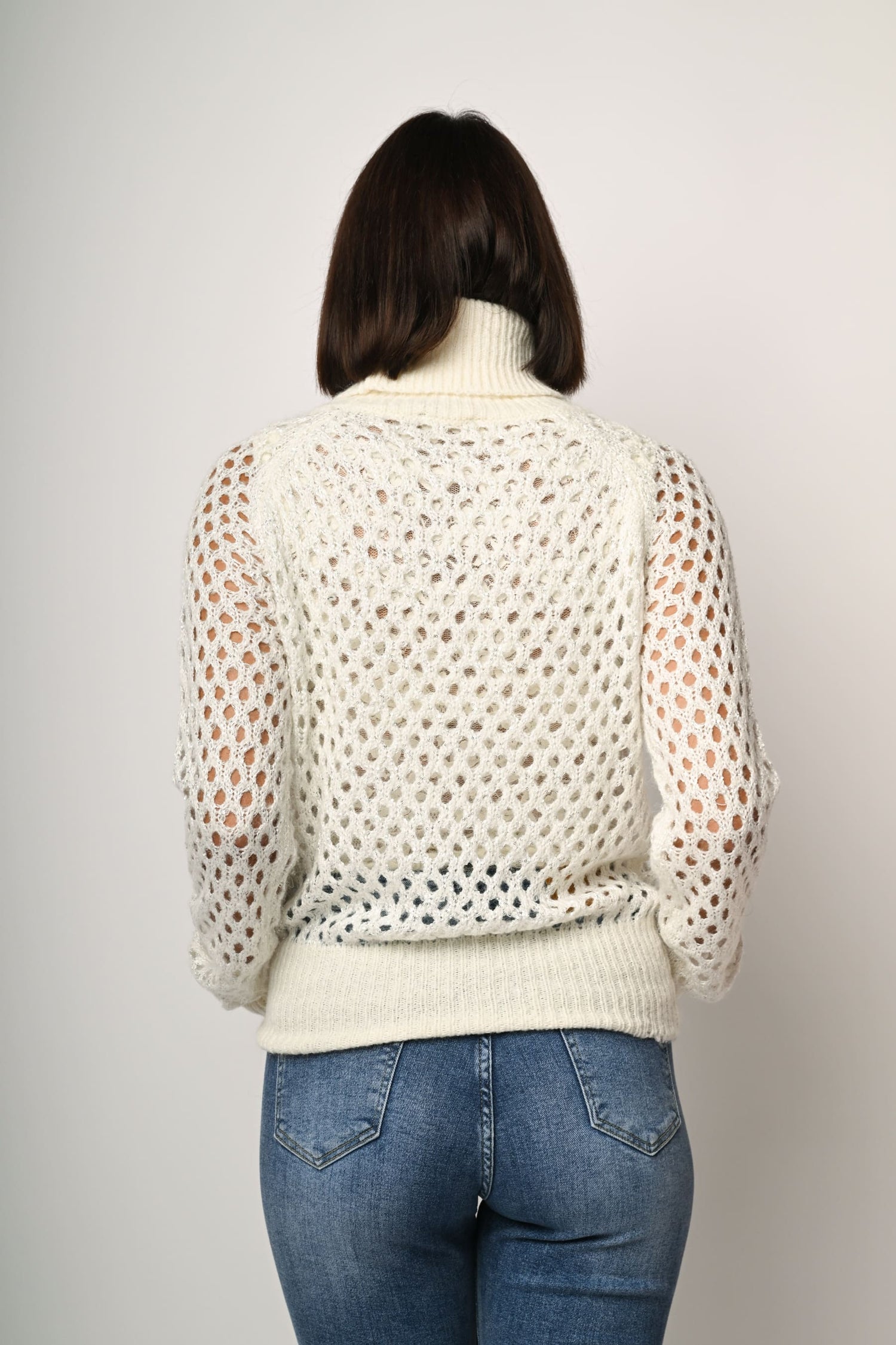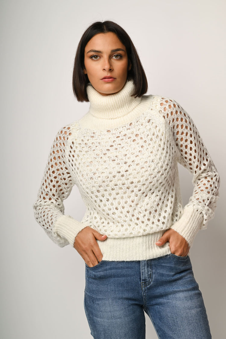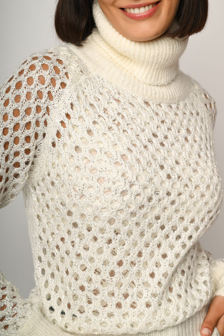 Dolcevita in maglia crochet bianca impreziosita da mini strass all-over con maniche raglan e finiture a costine.