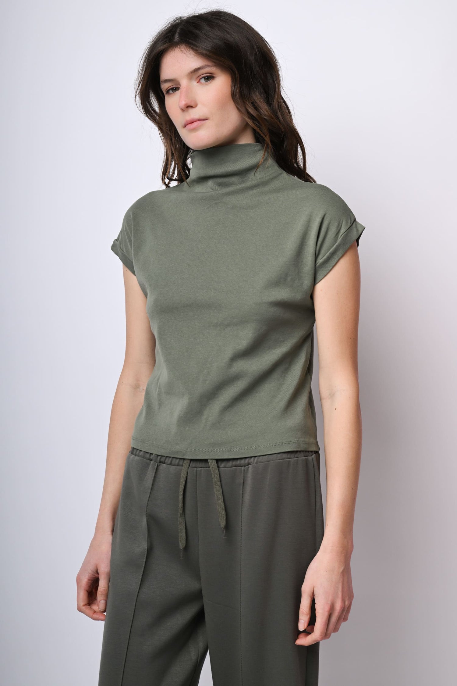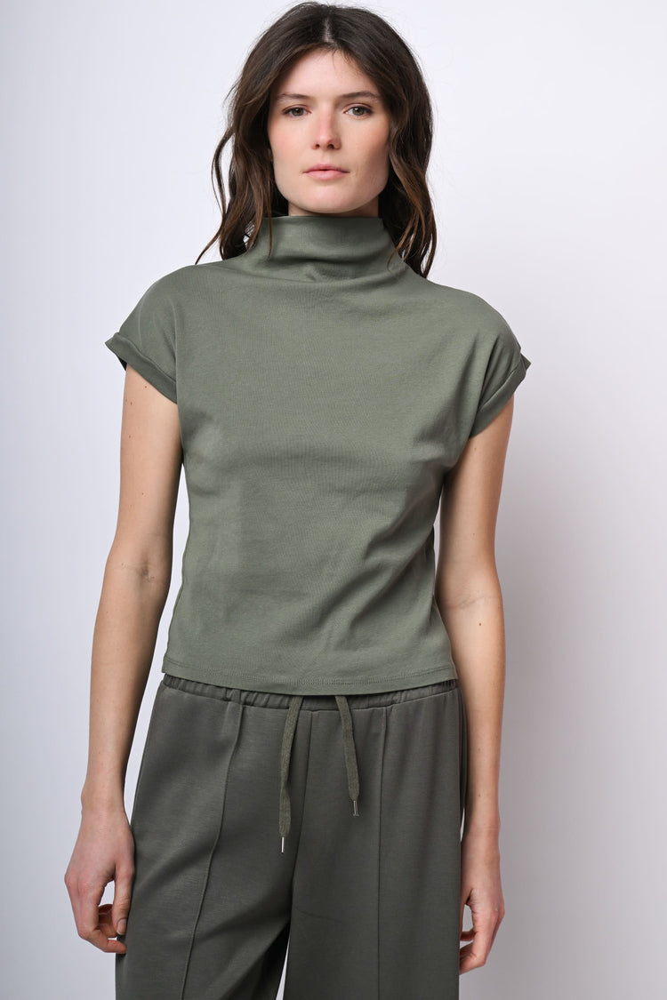 Top in cotone stretch verde oliva con collo alto e maniche ad aletta.