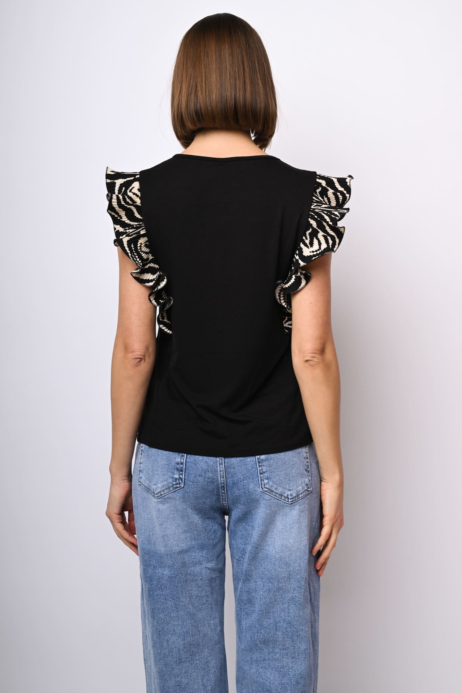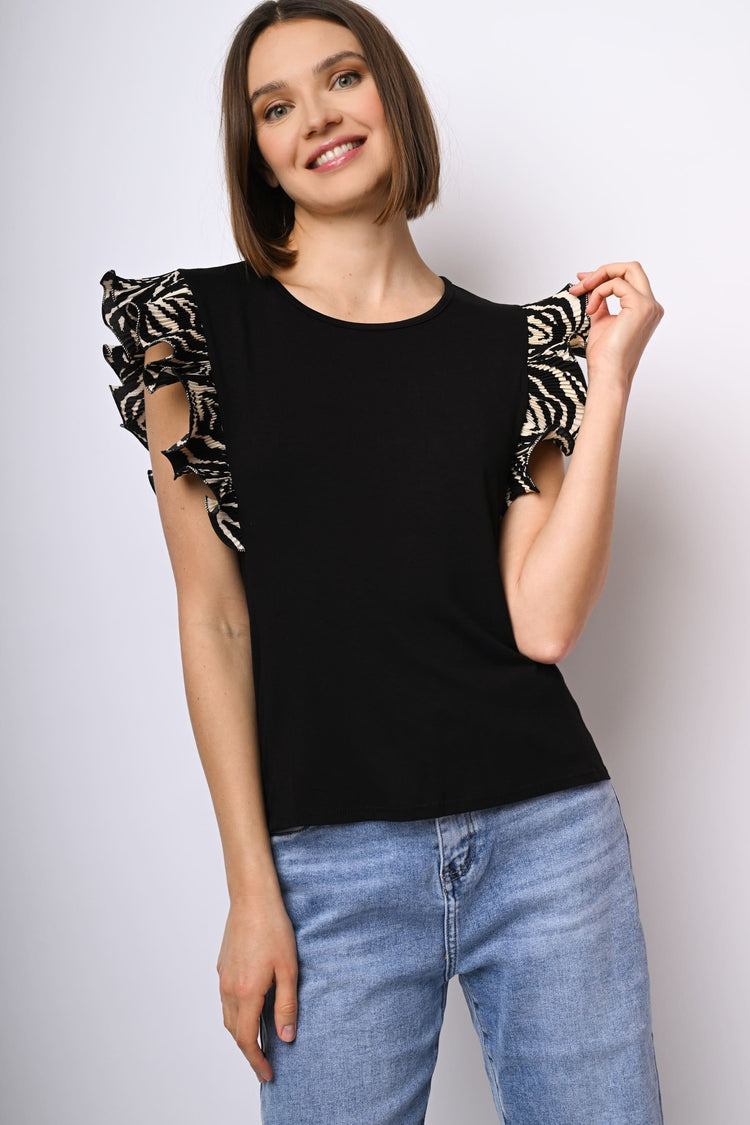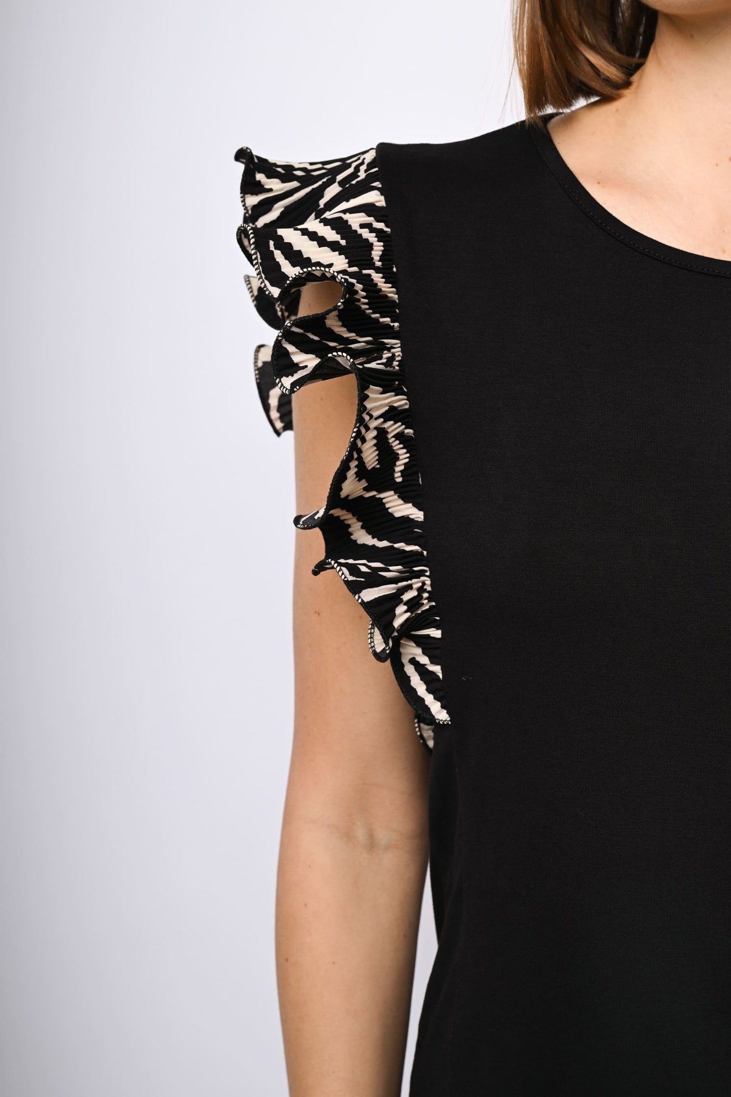 Top in viscosa stretch nero con scollo tondo e rouches decorative al giromanica in tessuto plissé a stampa zebrata bianca e nera.