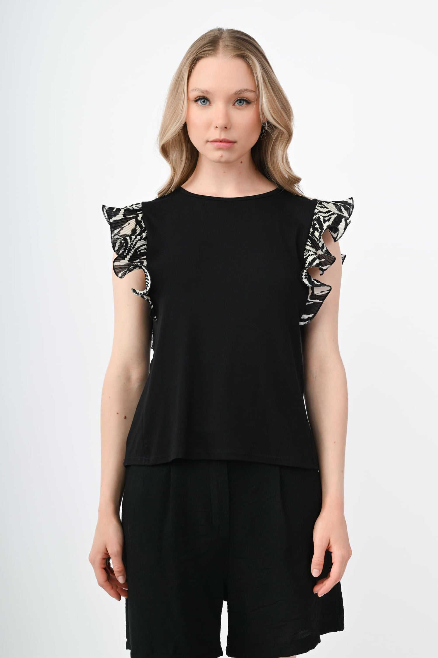 Top in viscosa stretch nera con scollo tondo, rouches plissettate al giromanica con stampa zebrata e orlo dritto.