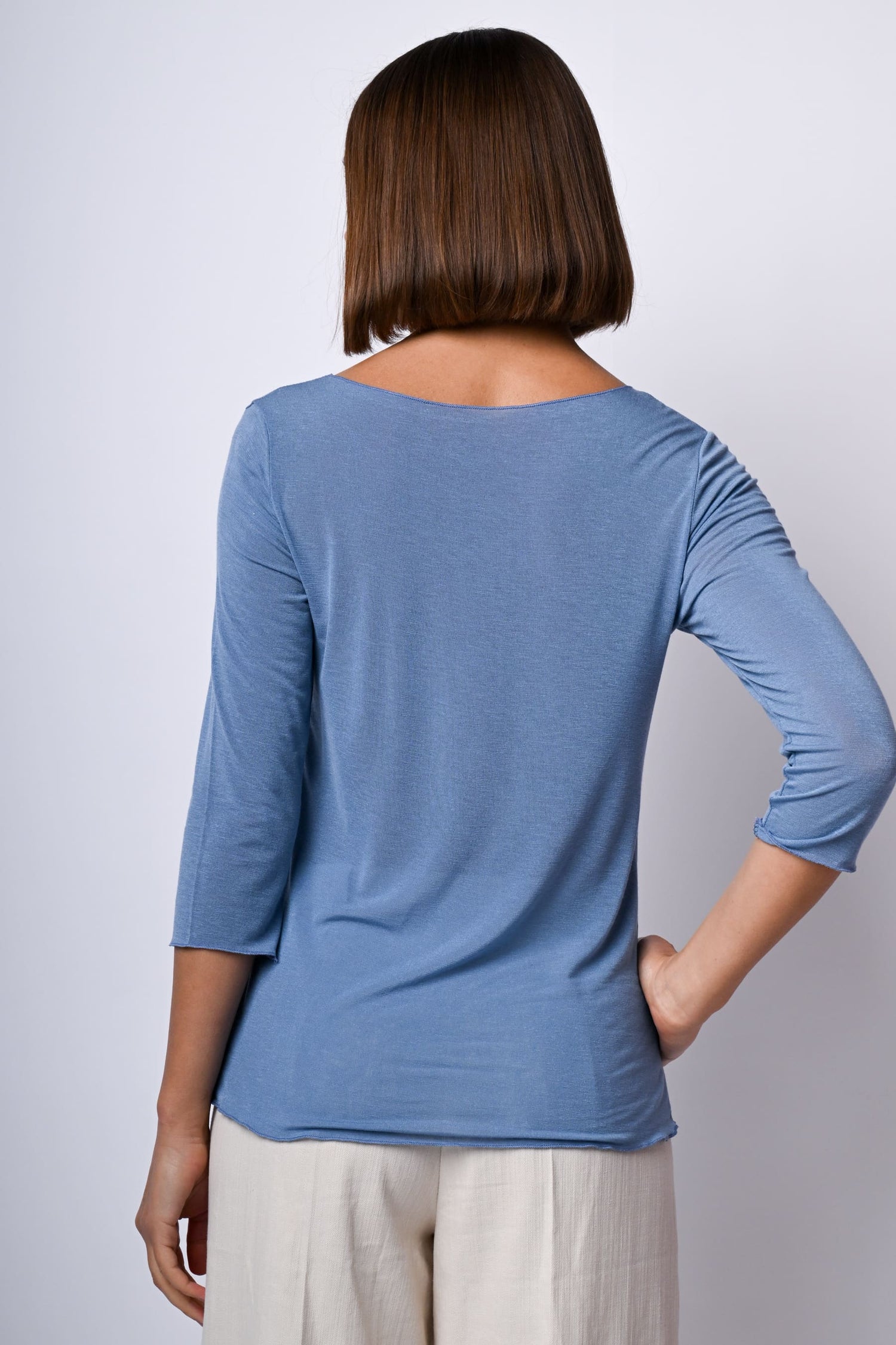 Top in maglia misto viscosa e seta stretch azzurro con scollo a barchetta e maniche tre quarti.
