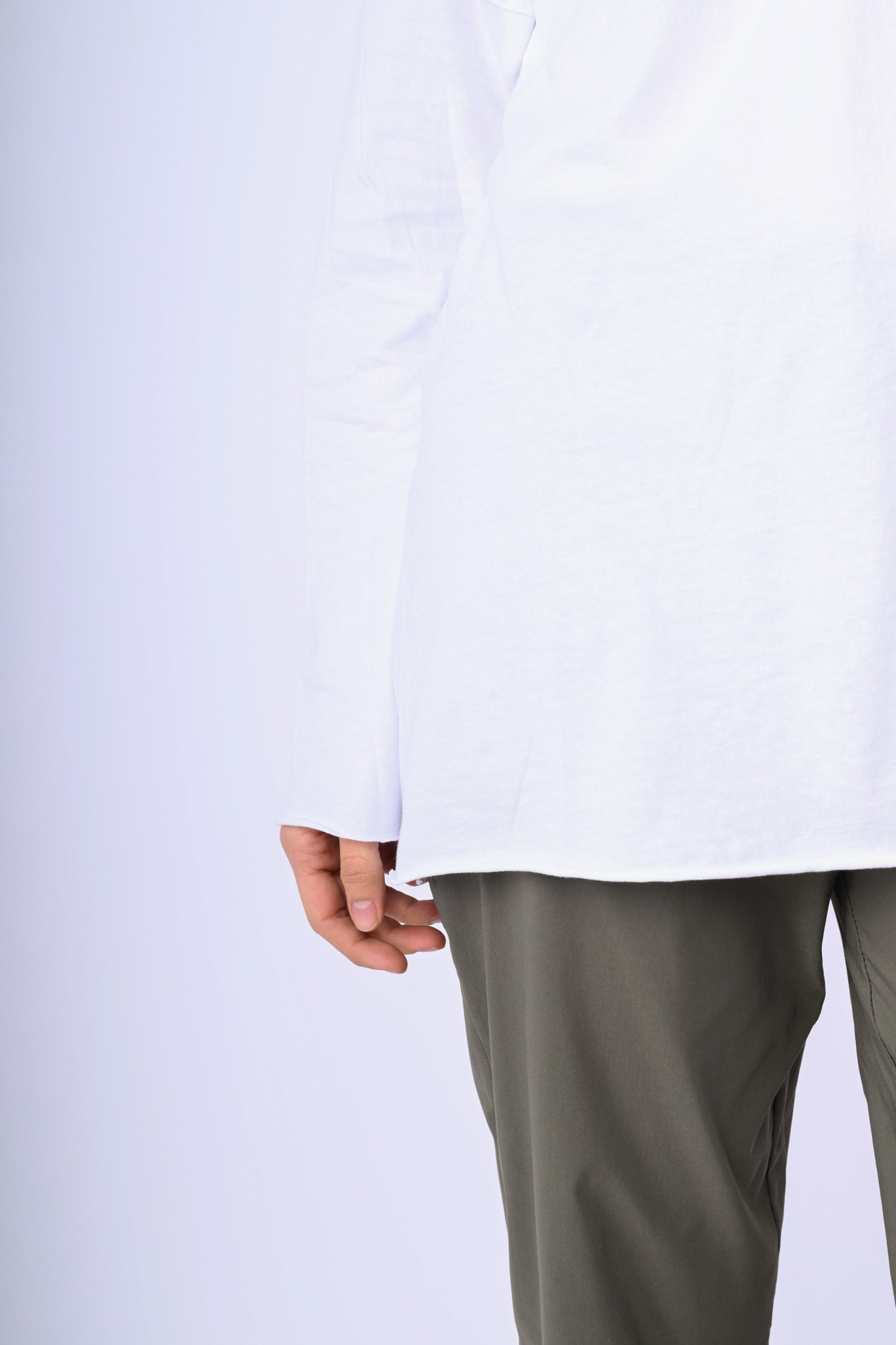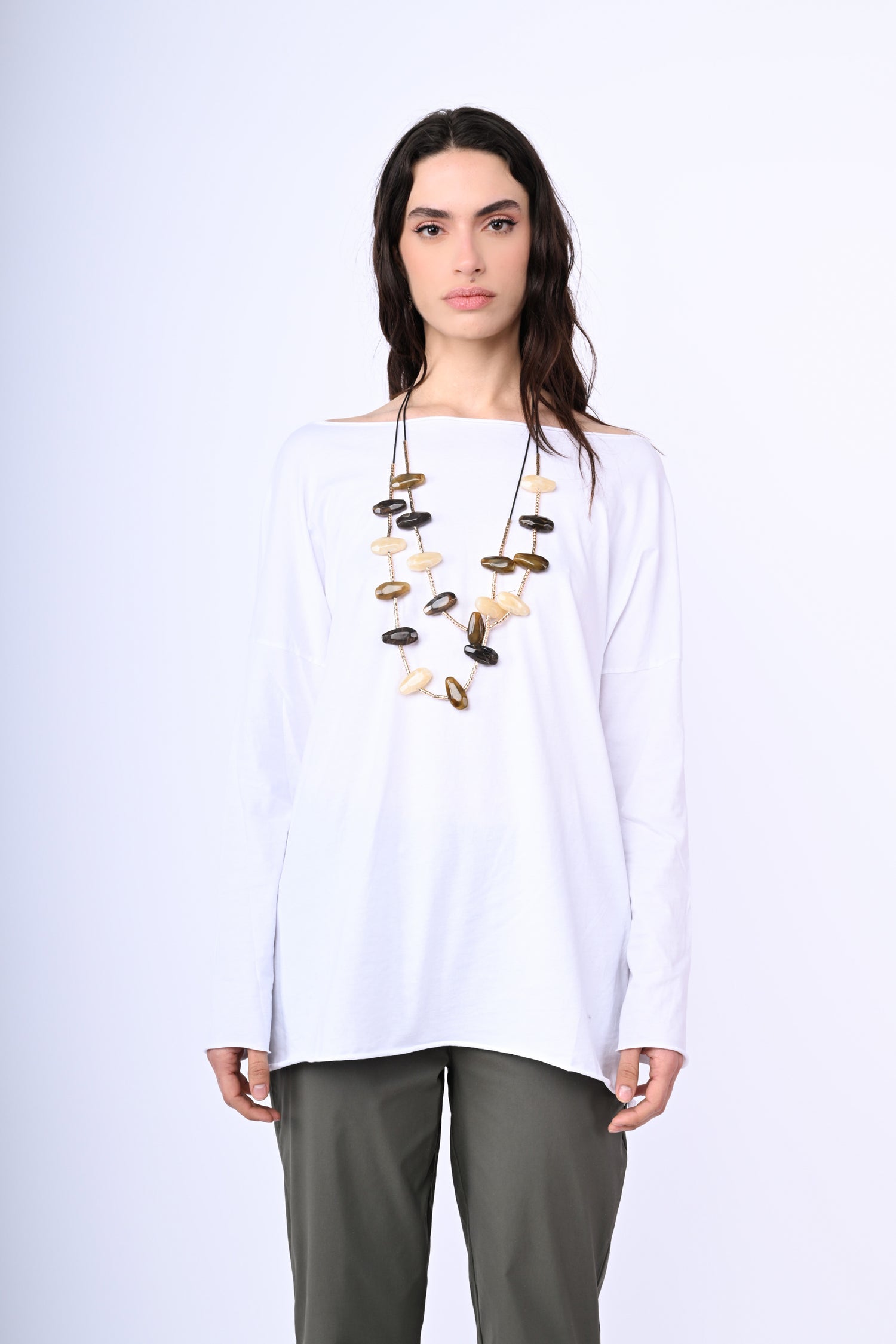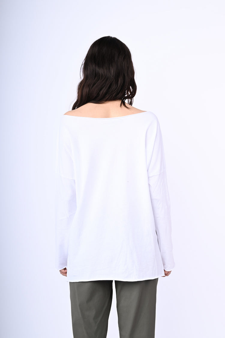 Top oversize a maniche lunghe in cotone bianco con scollo a barchetta e orli arrotolati a taglio vivo.