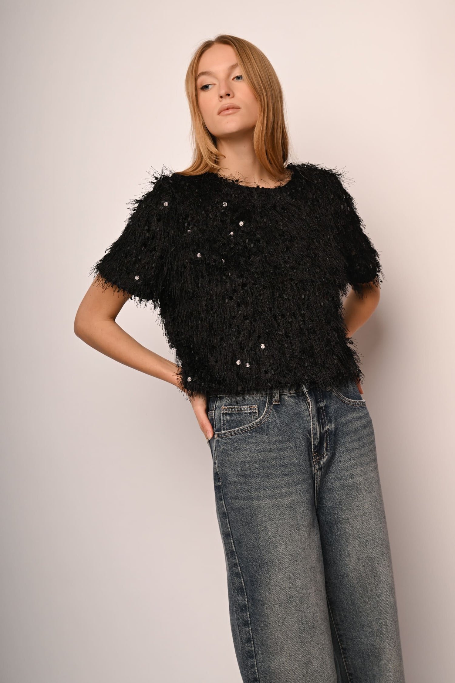 T-shirt in tessuto effetto pelo nero con scollo tondo e paillettes decorative all-over.