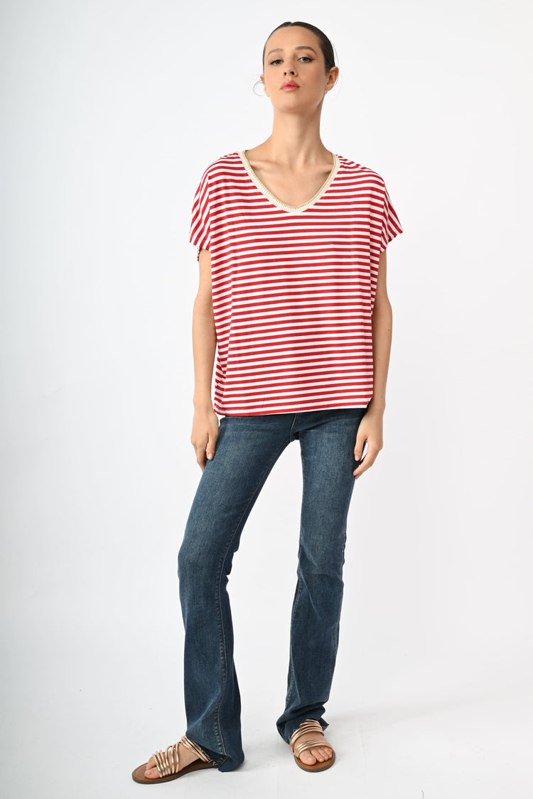 T-shirt in viscosa stretch a righe bianche e rosse con scollo a U rifinito in maglia a costine avorio e profilo in lurex oro, maniche ad aletta e silhouette morbida.
