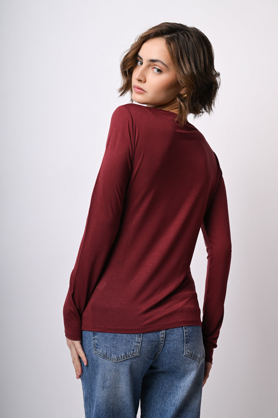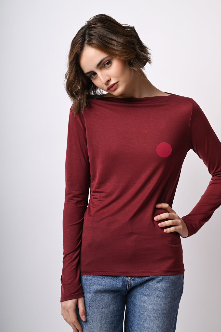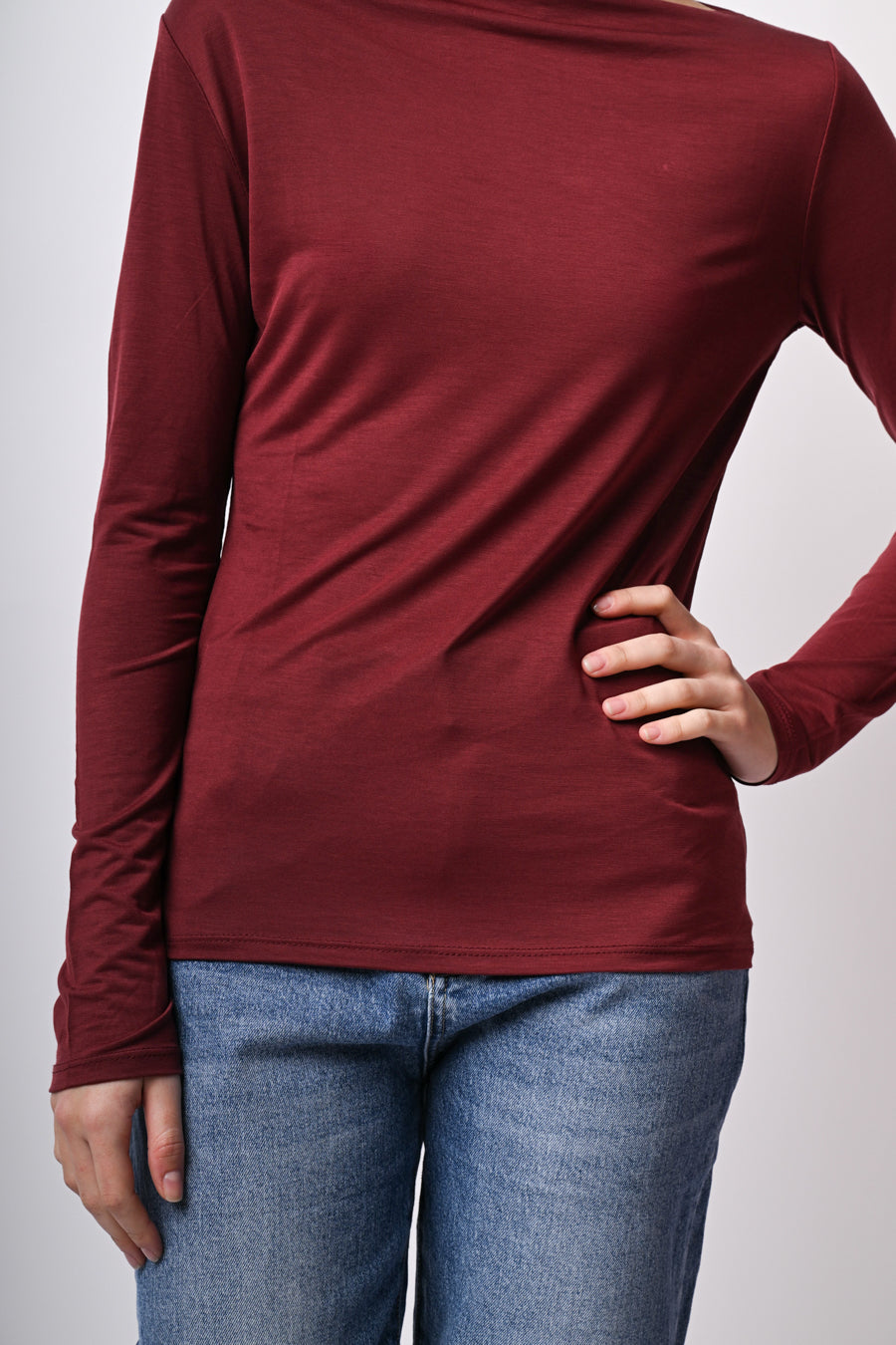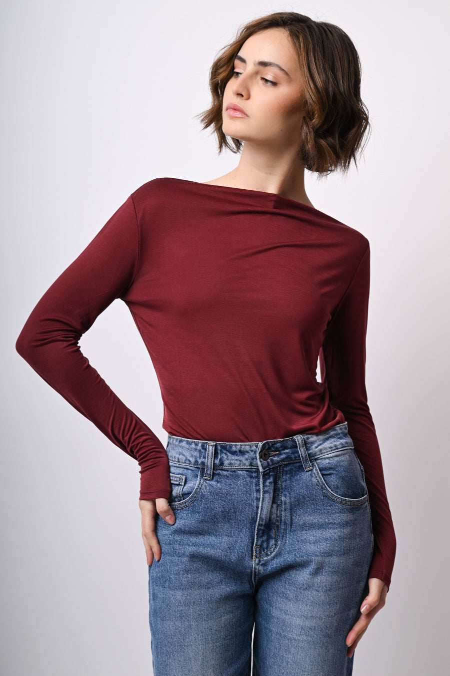 Top a maniche lunghe in lyocell bordeaux con scollo a barchetta e silhouette aderente.