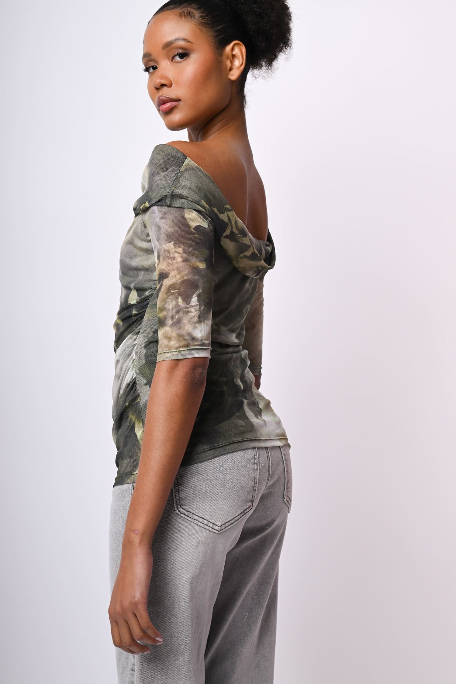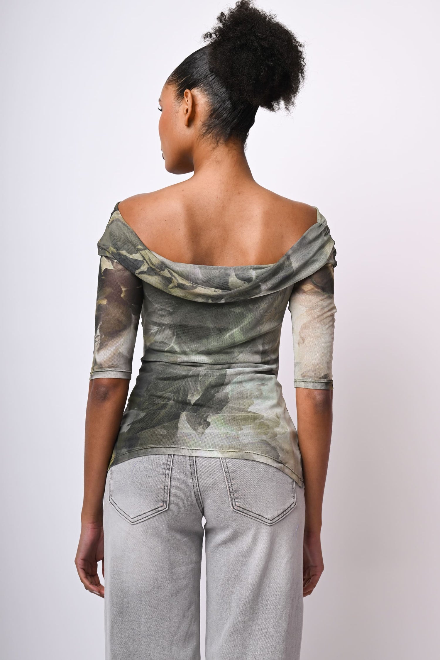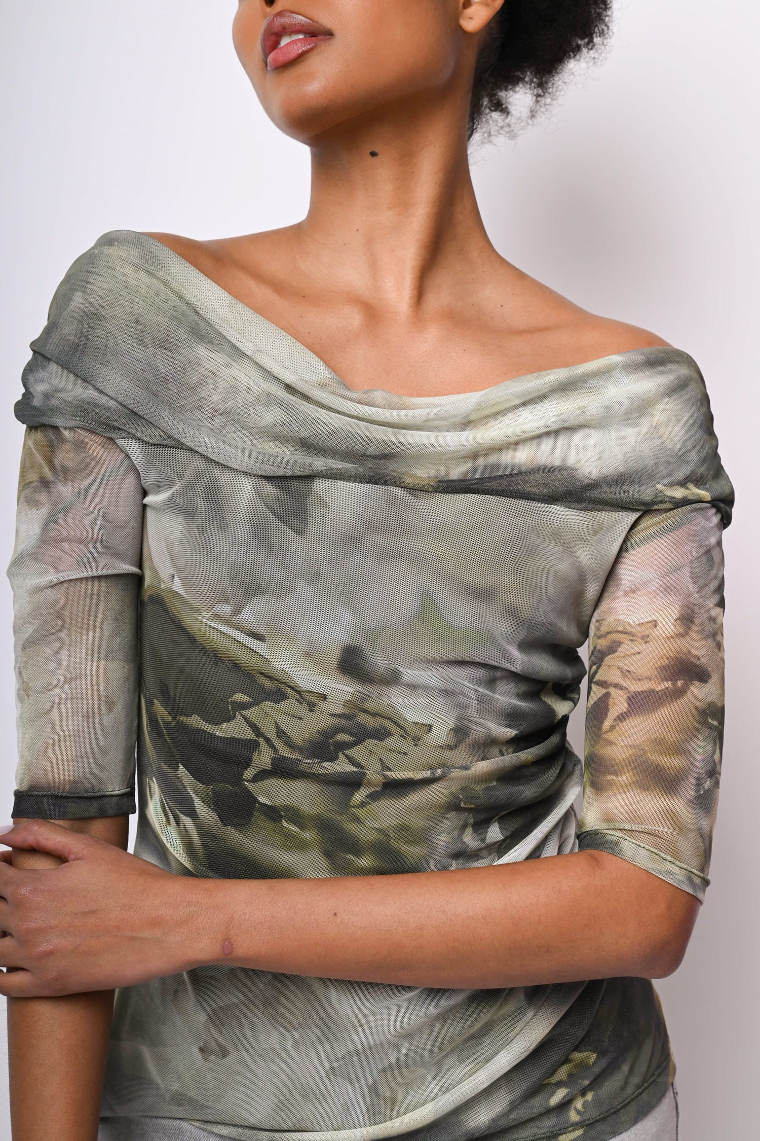 Top in tulle stretch a stampa astratta floreale nei toni del verde con spalle scoperte, scollo con risvolto, maniche tre quarti, arricciatura laterale e silhouette aderente.