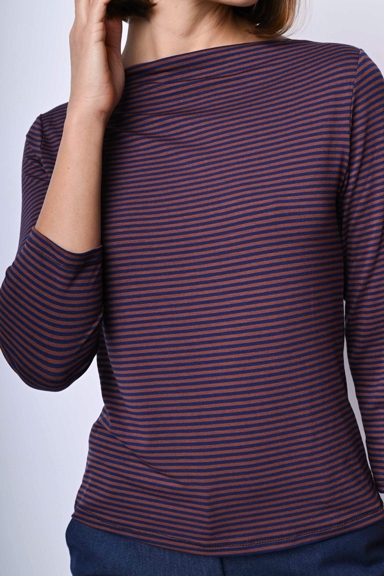 Top in jersey di viscosa stretch a righe sottili blu e marrone con scollo a barchetta e maniche tre quarti.