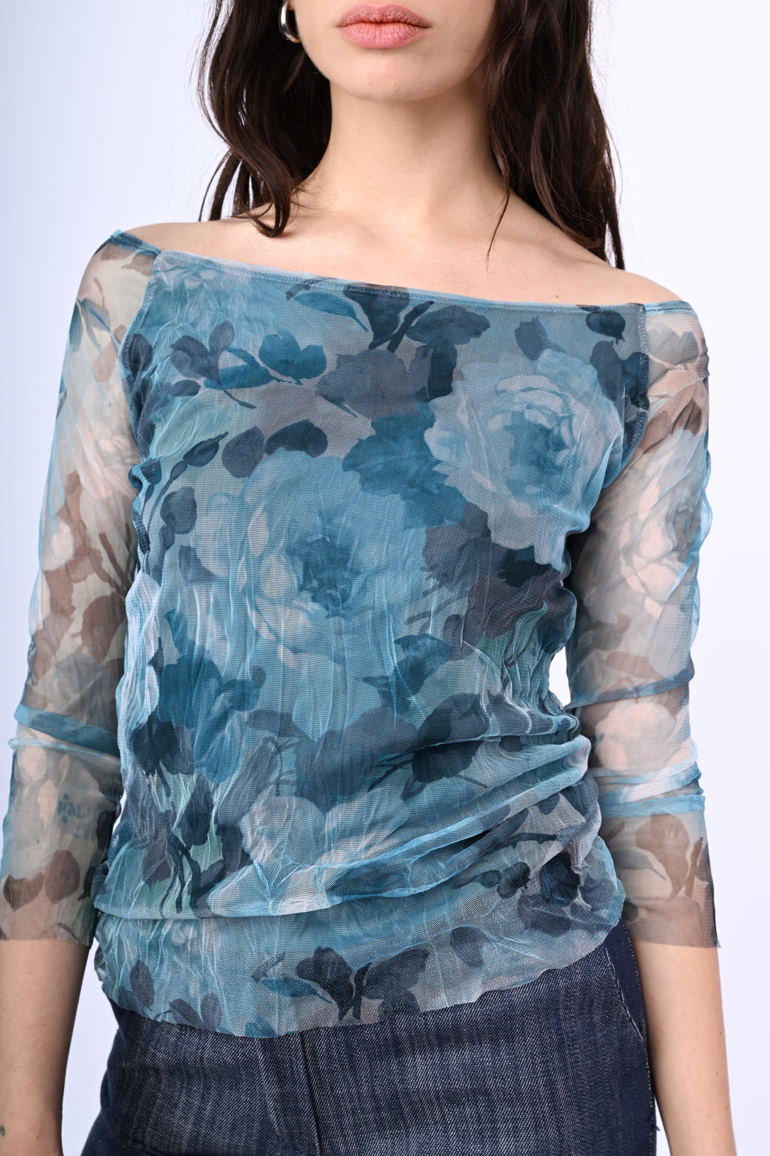 Top in tulle trasparente foderato a stampa floreale nei toni dell'azzurro con spalle scoperte, maniche crop e silhouette aderente.