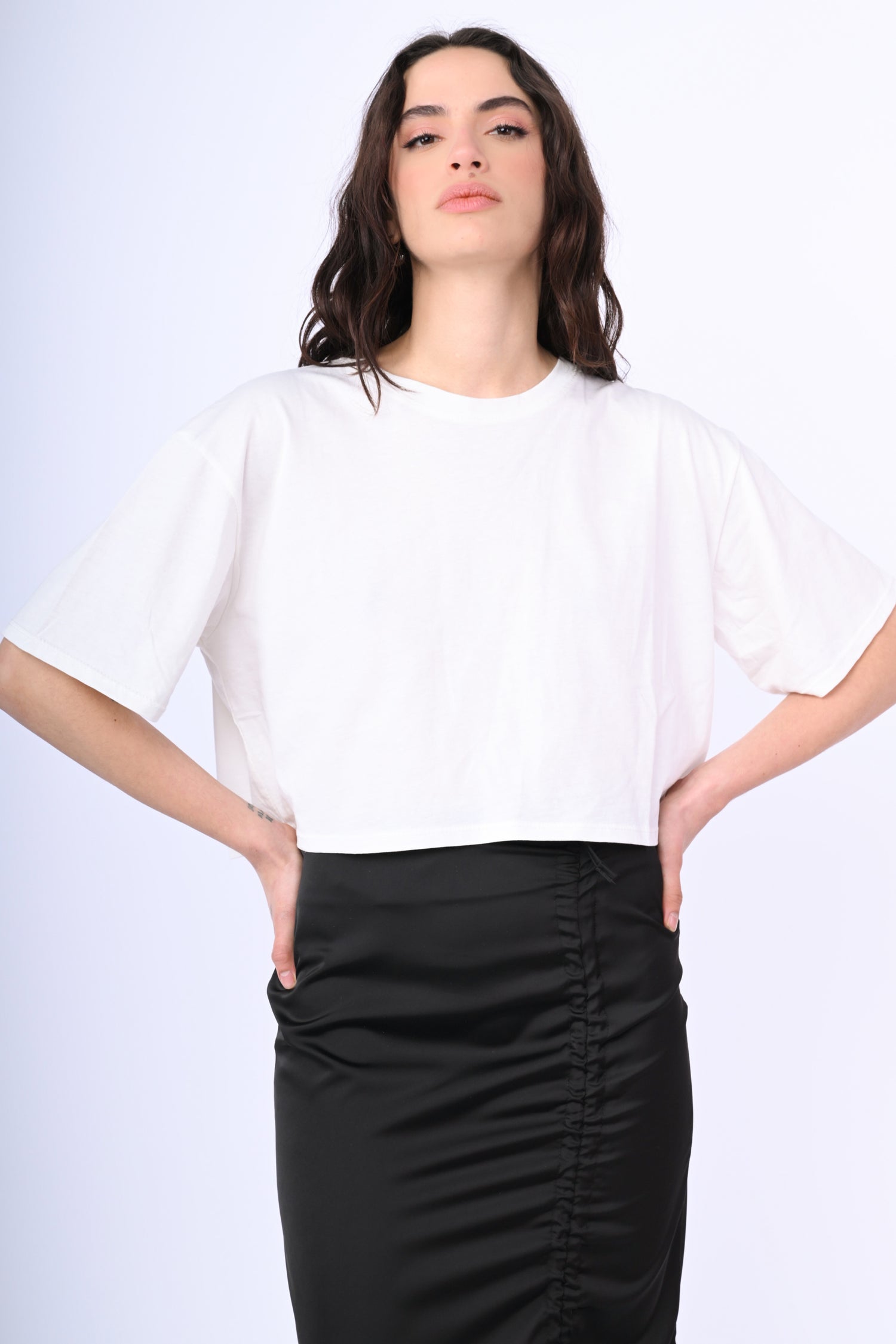 T-shirt crop in cotone stretch bianco con scollo tondo e spalle scese.