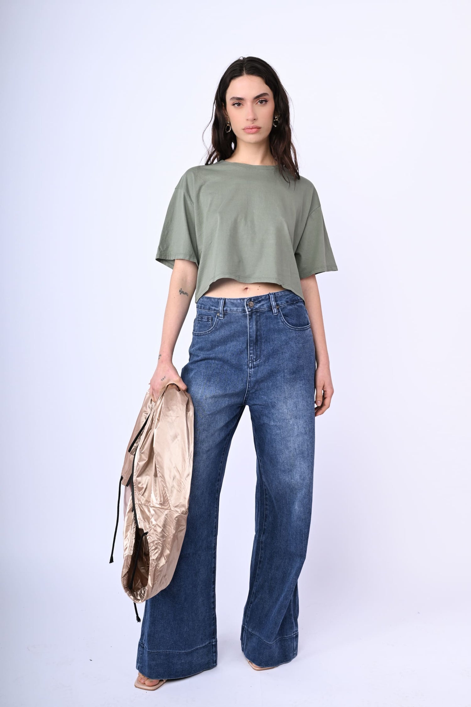 T-shirt crop in cotone stretch verde con scollo tondo e spalle scese.