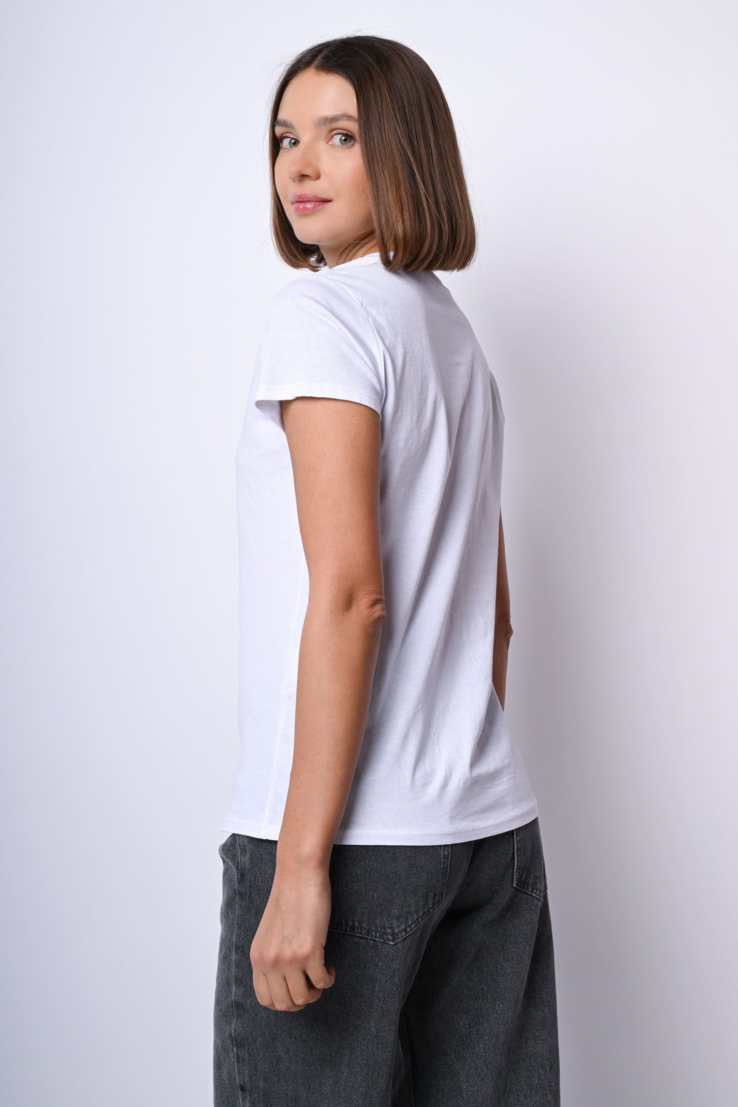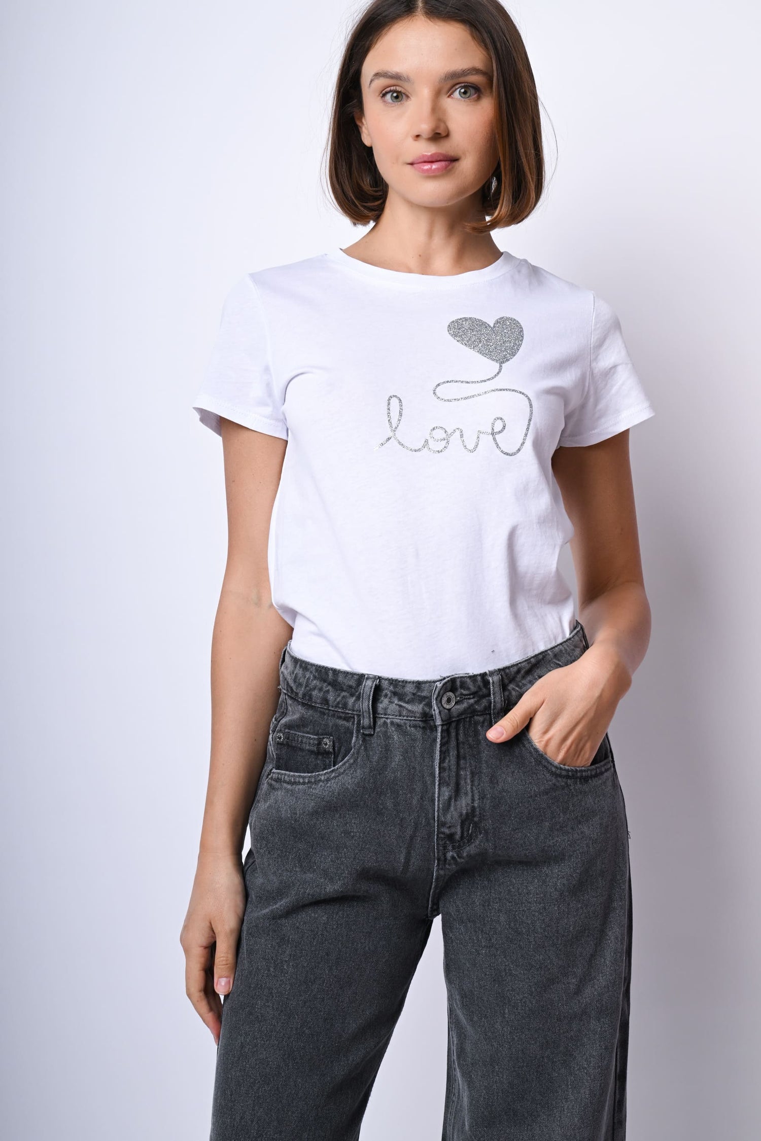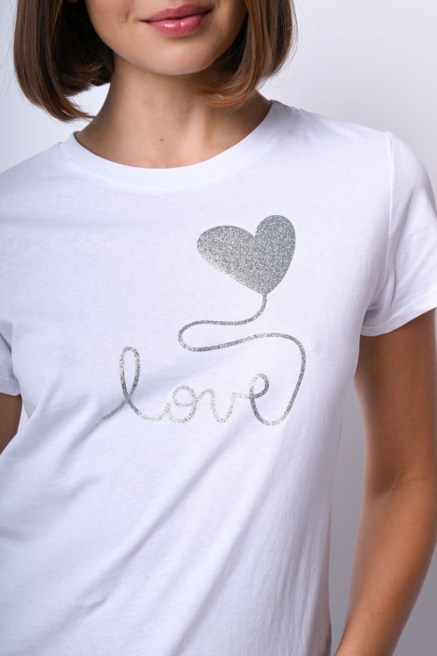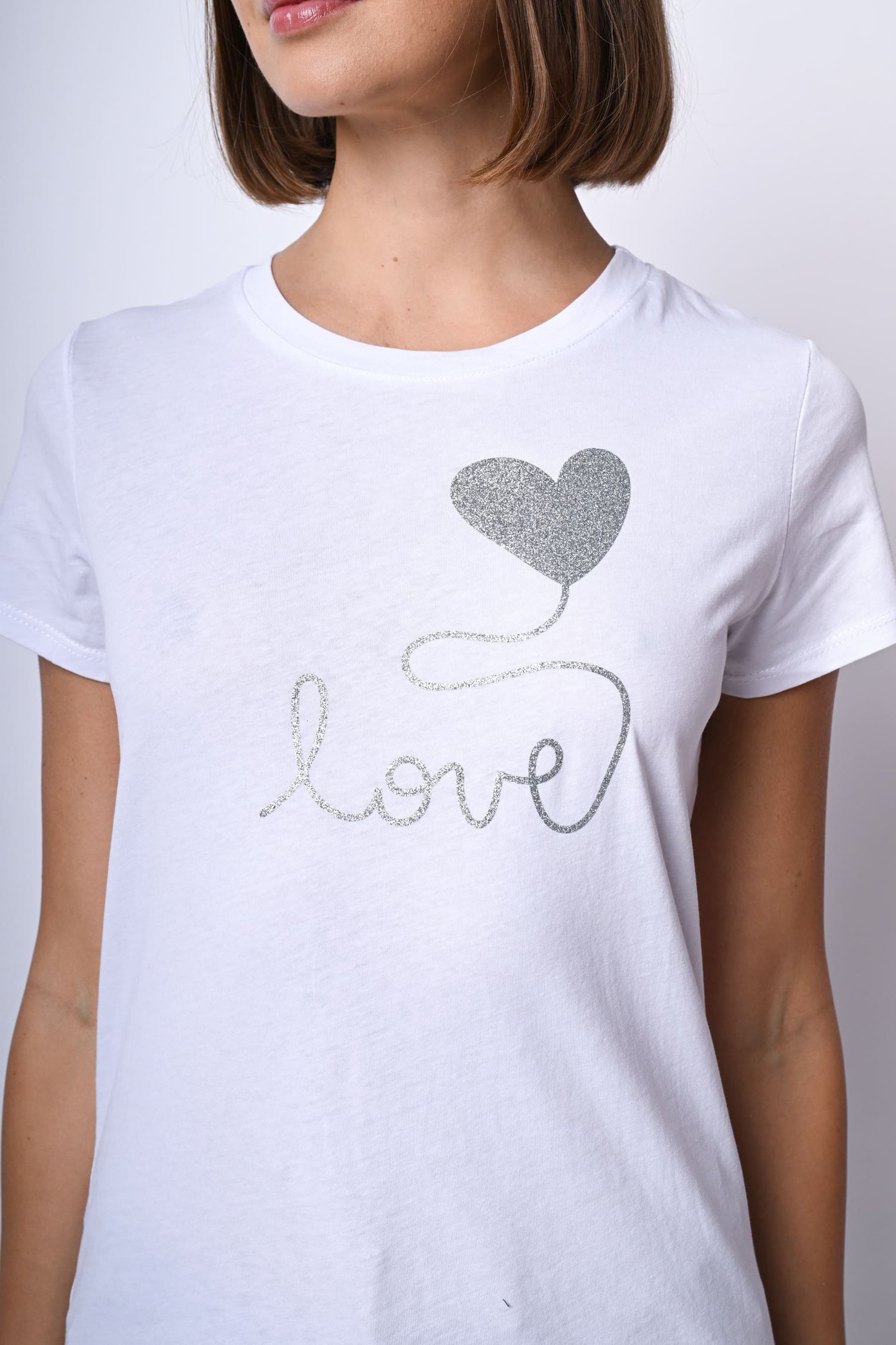 T-shirt in cotone bianco con scollo tondo e stampa Love glitter argento sul petto.