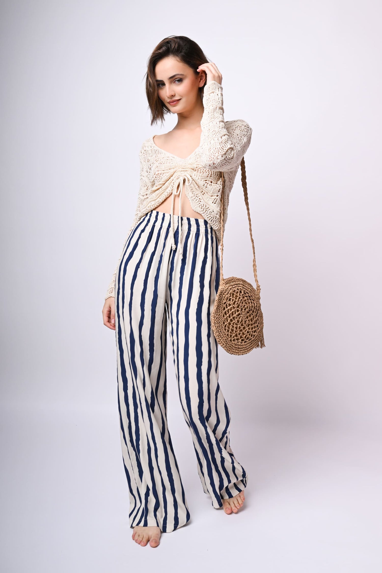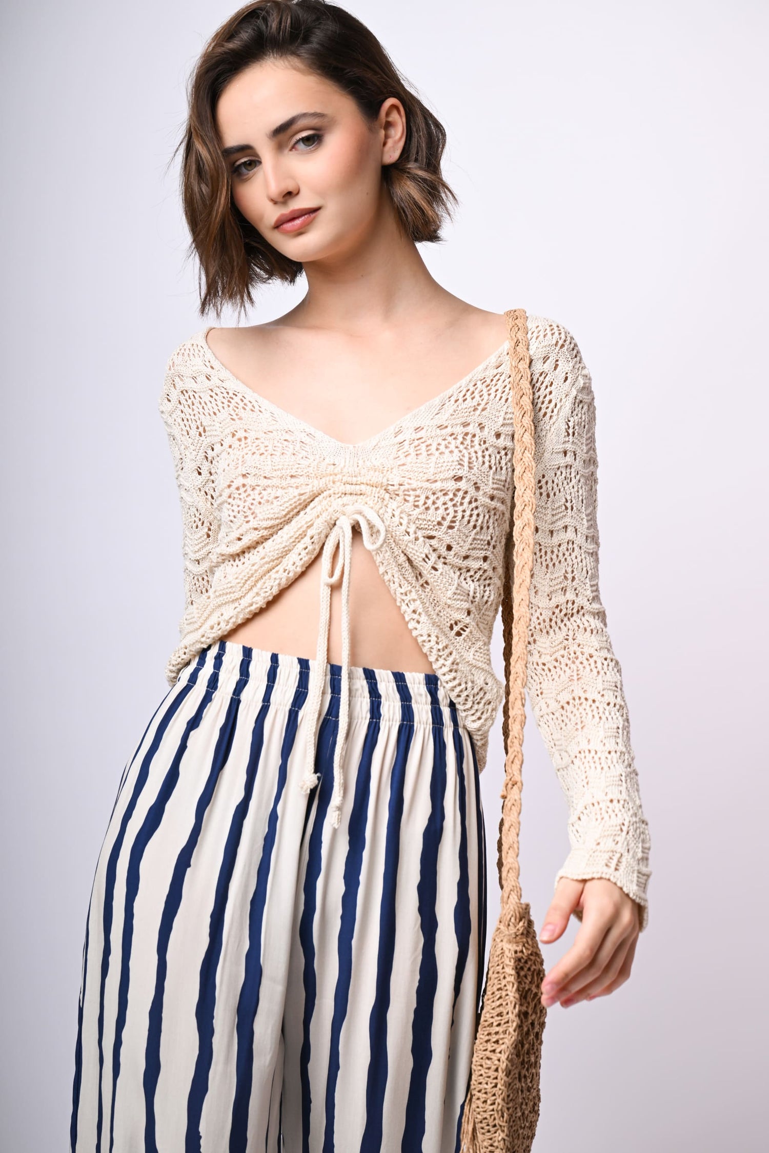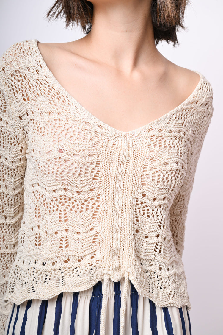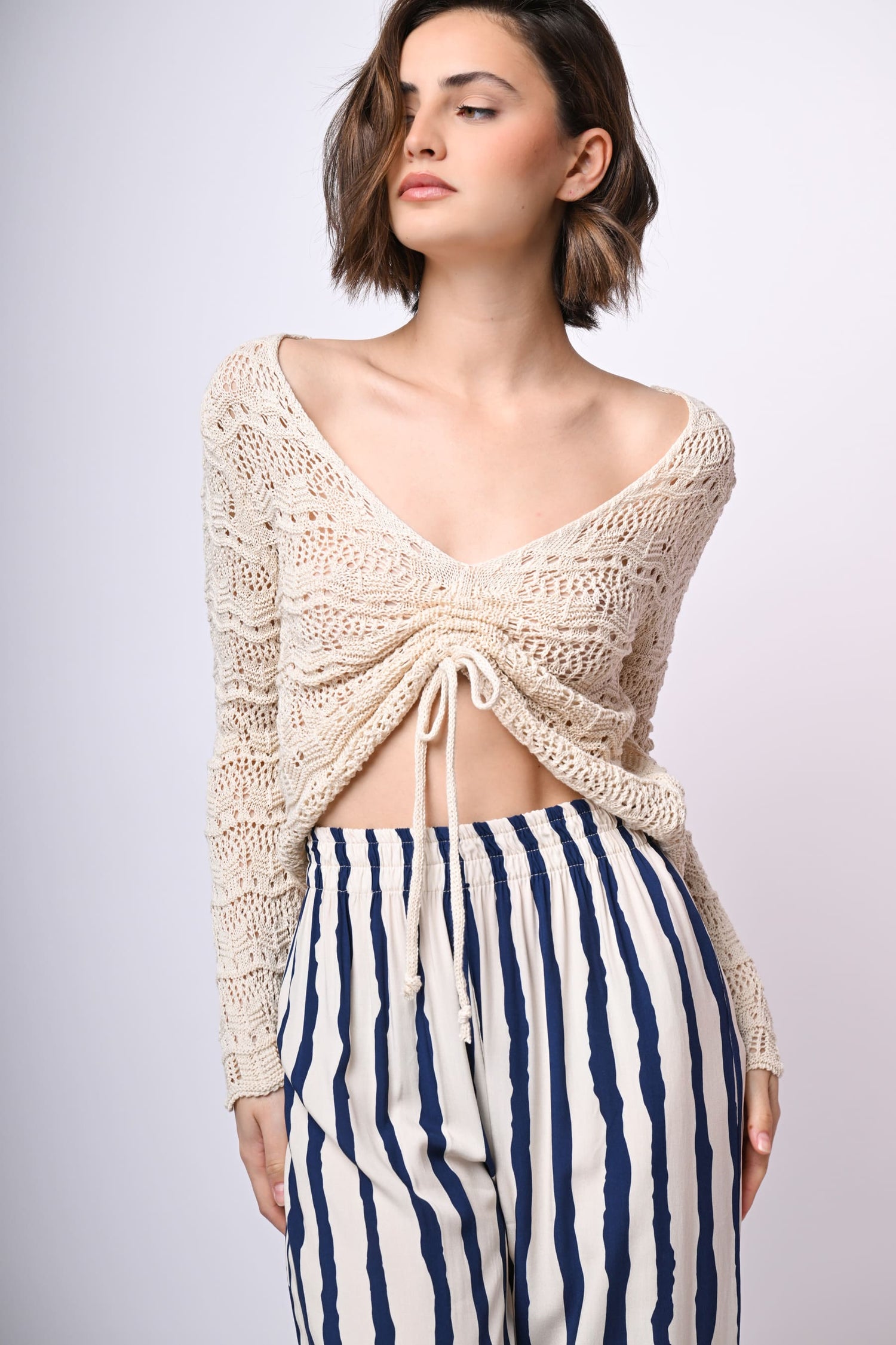 Top a maniche lunghe in maglia crochet misto cotone beige con ampio scollo a V e coulisse regolabile che crea un arricciatura sul davanti.