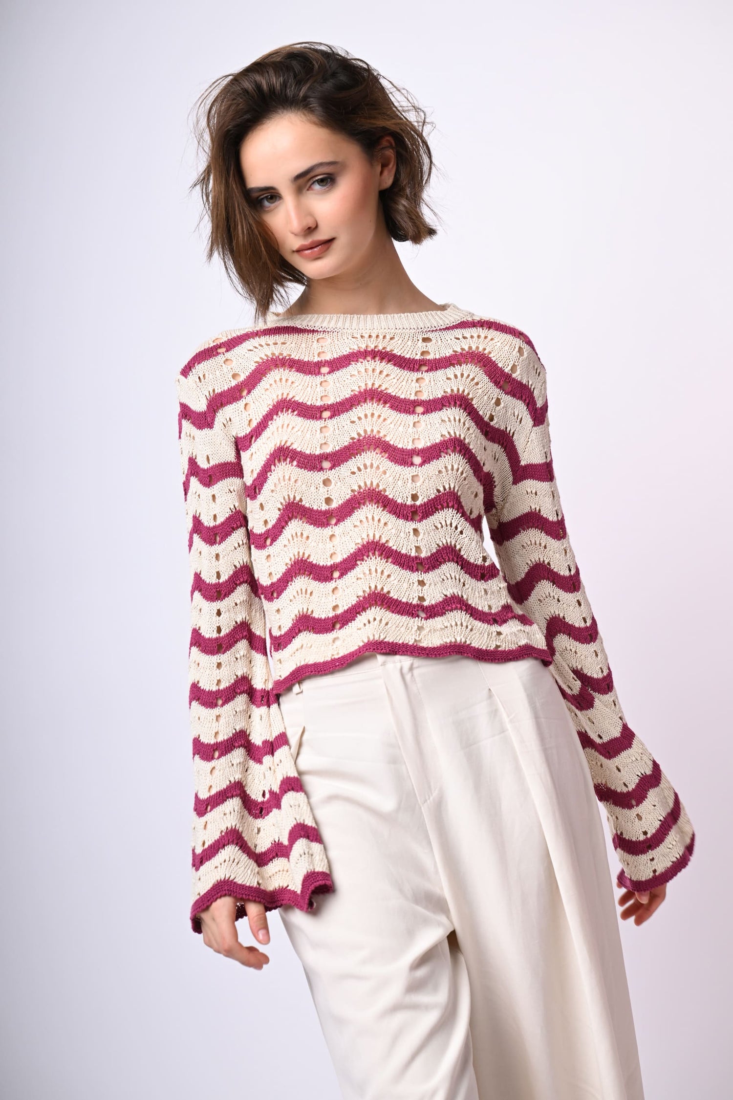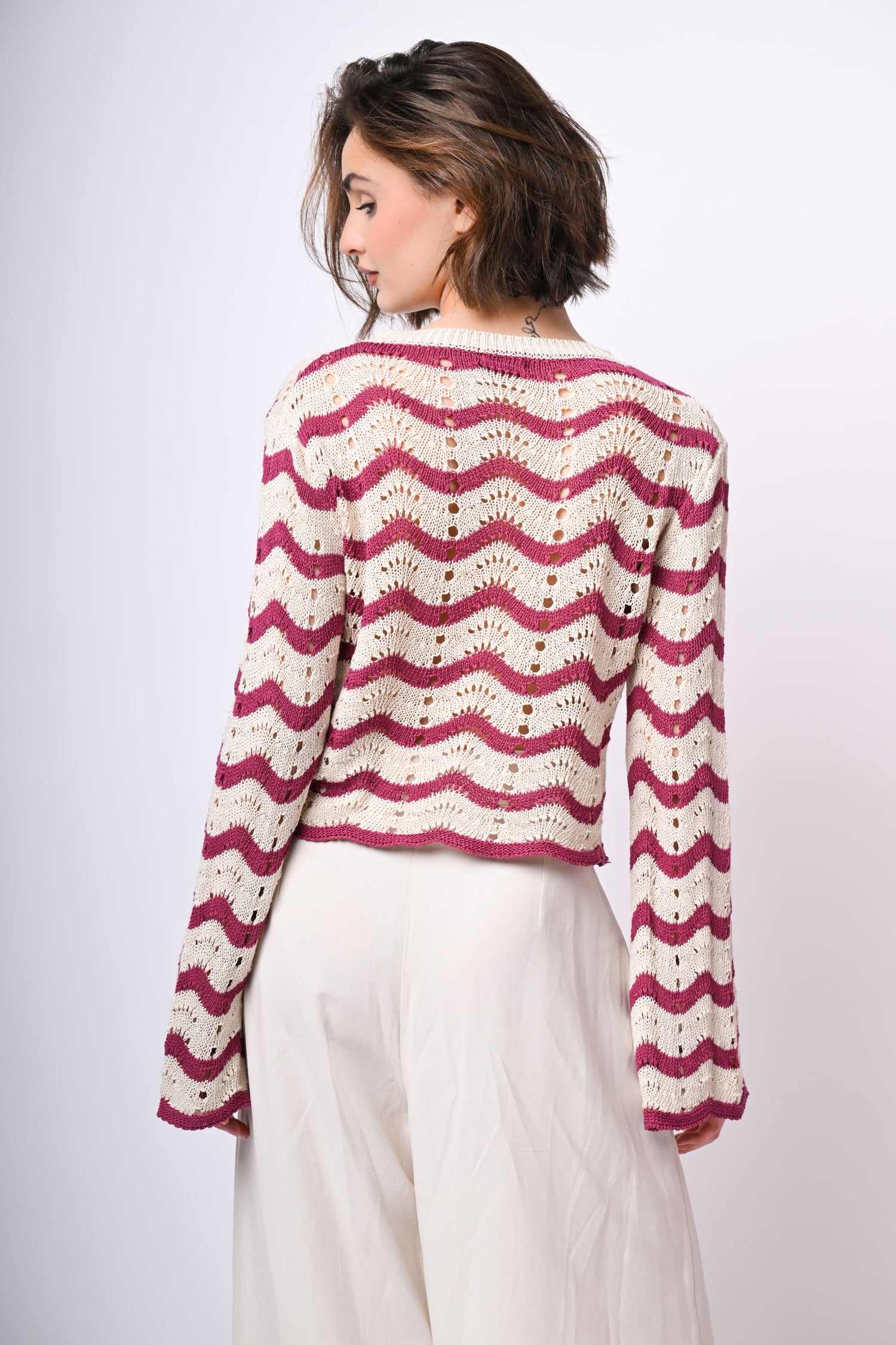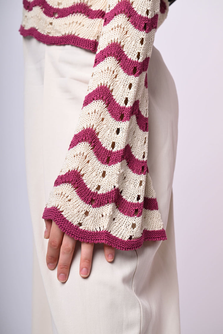 Pull in maglia crochet traforata misto cotone con righe ondulate fucsia su fondo bianco, scollo a barchetta rifinito a costine e maniche svasate.