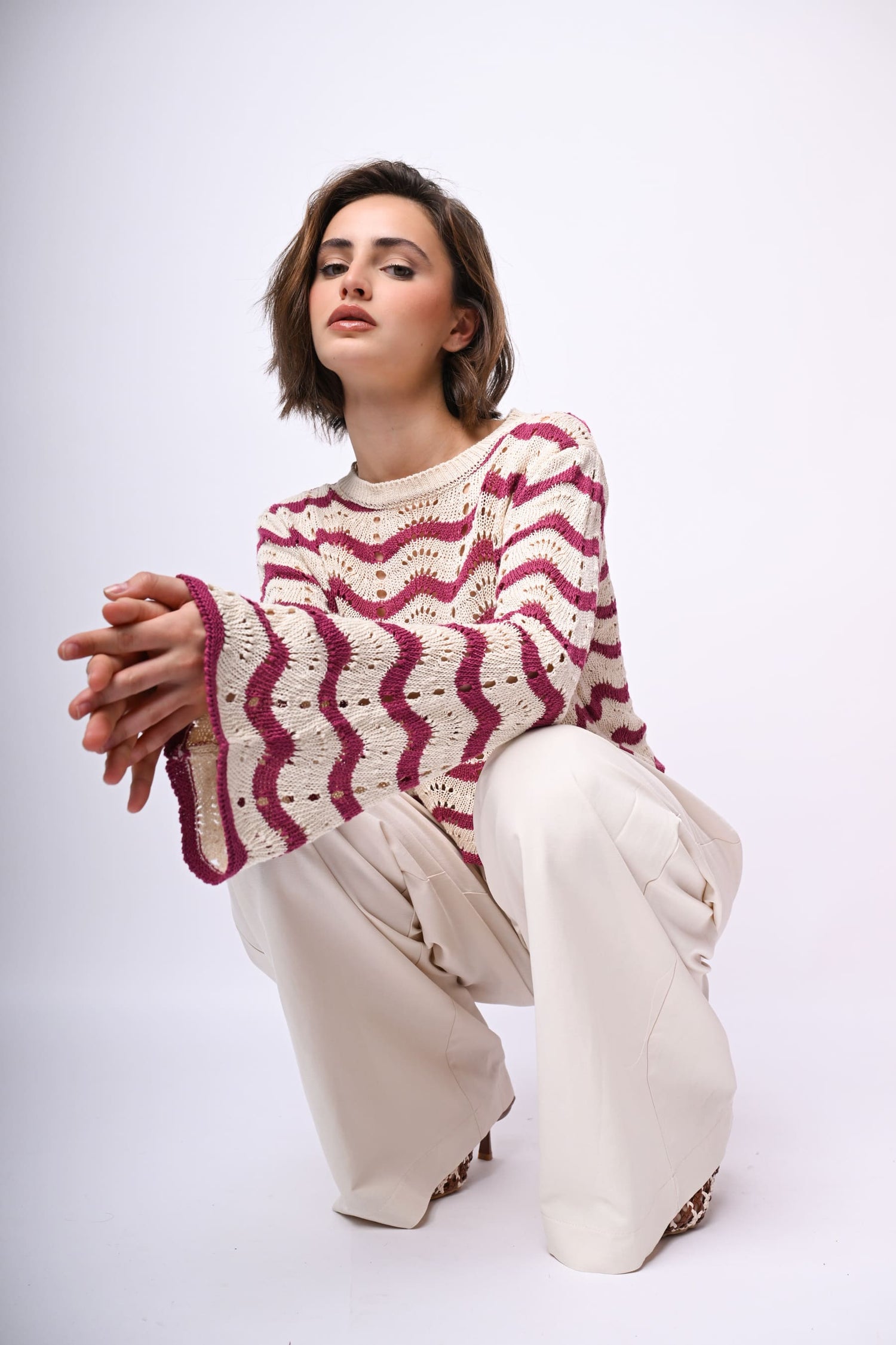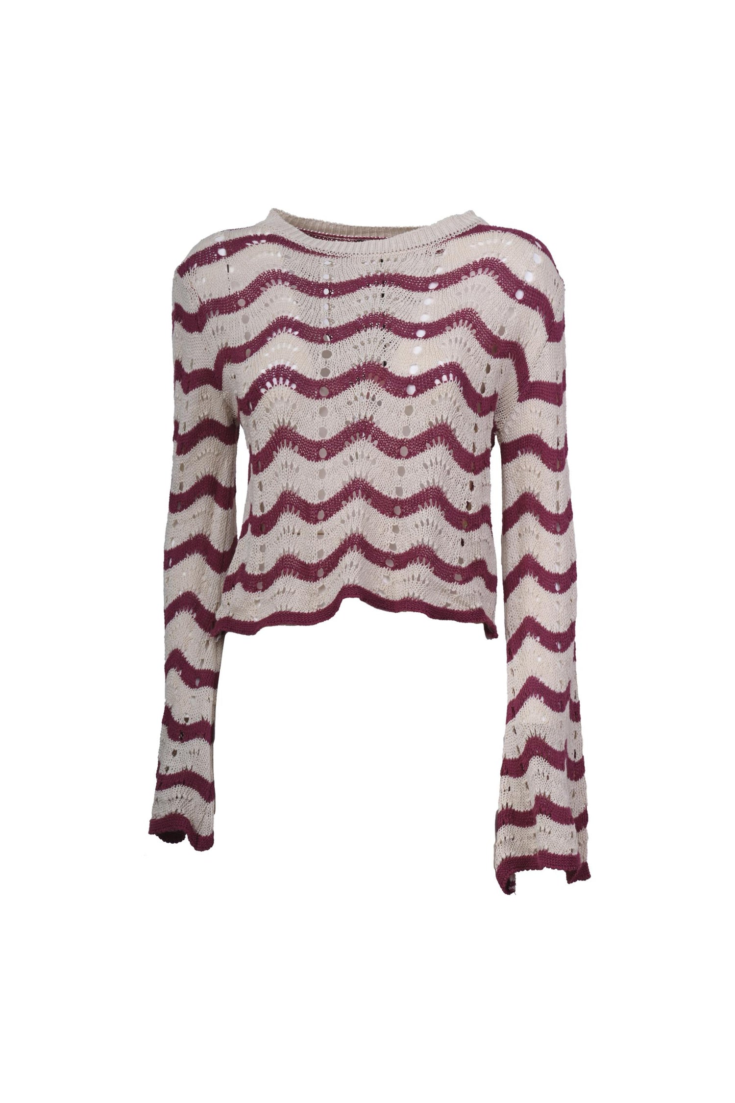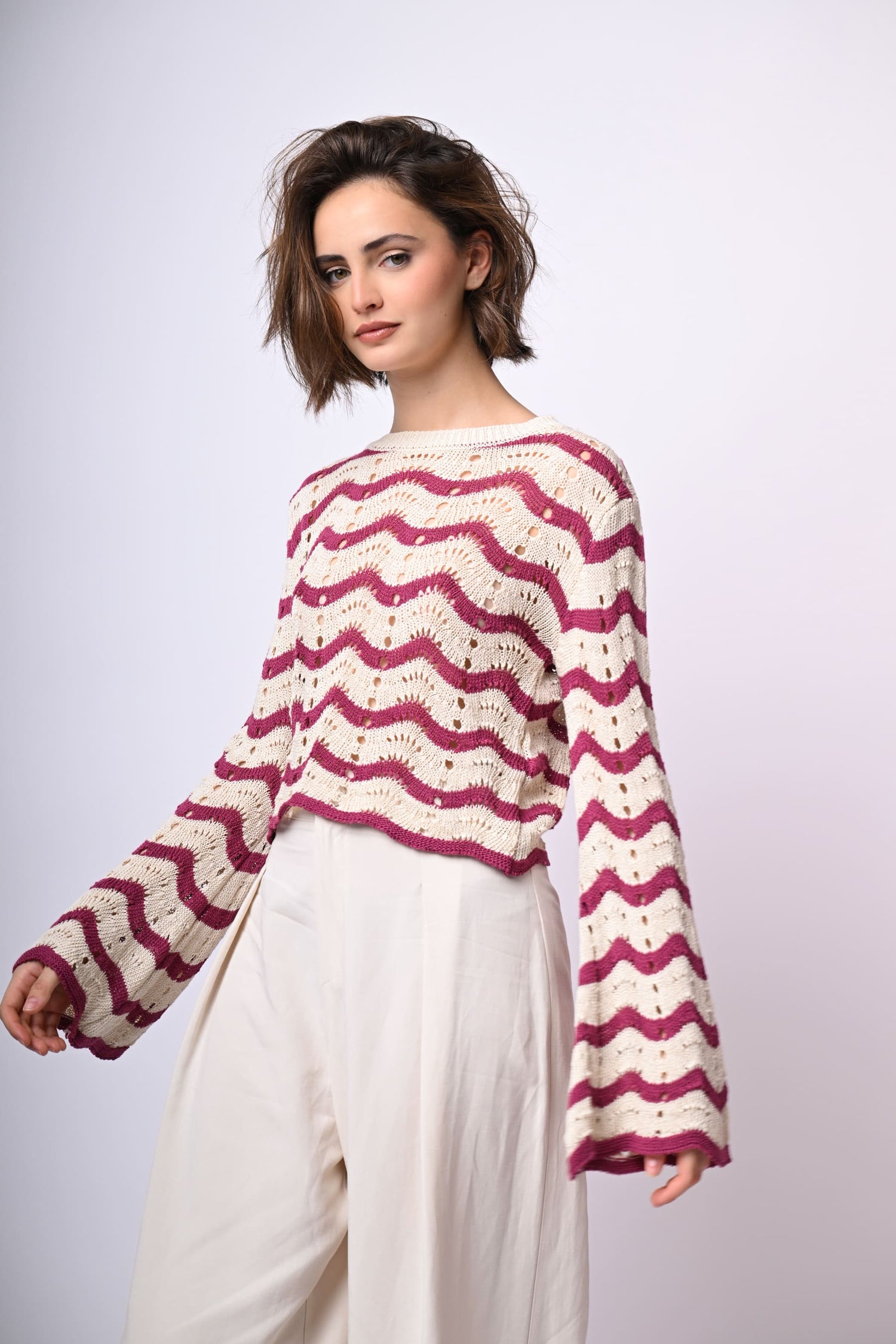 Pull in maglia crochet traforata misto cotone con righe ondulate fucsia su fondo bianco, scollo a barchetta rifinito a costine e maniche svasate.