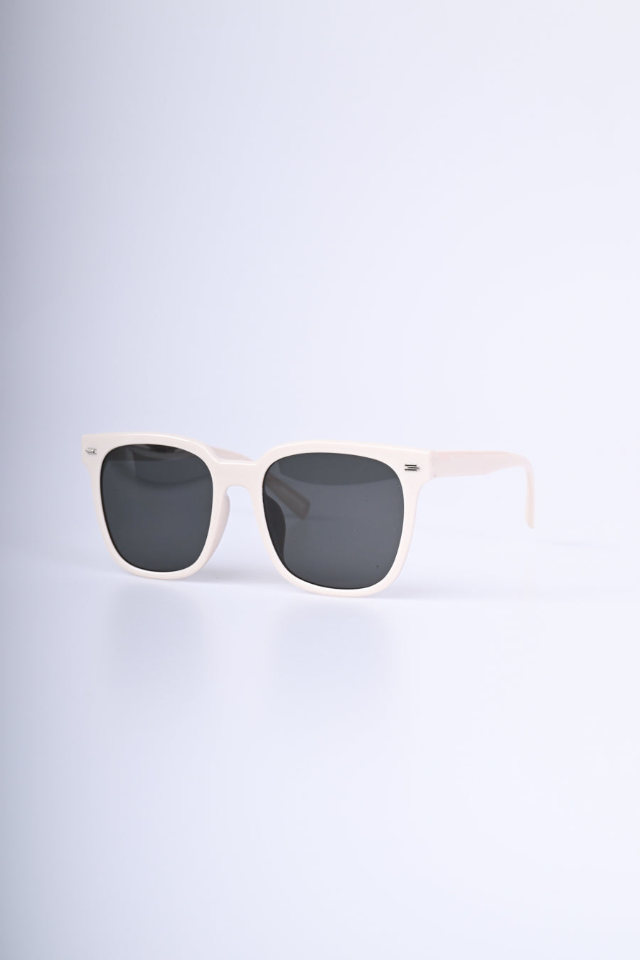 Occhiali da sole stile anni 50 con montatura spessa in plastica bianca e lenti scure.