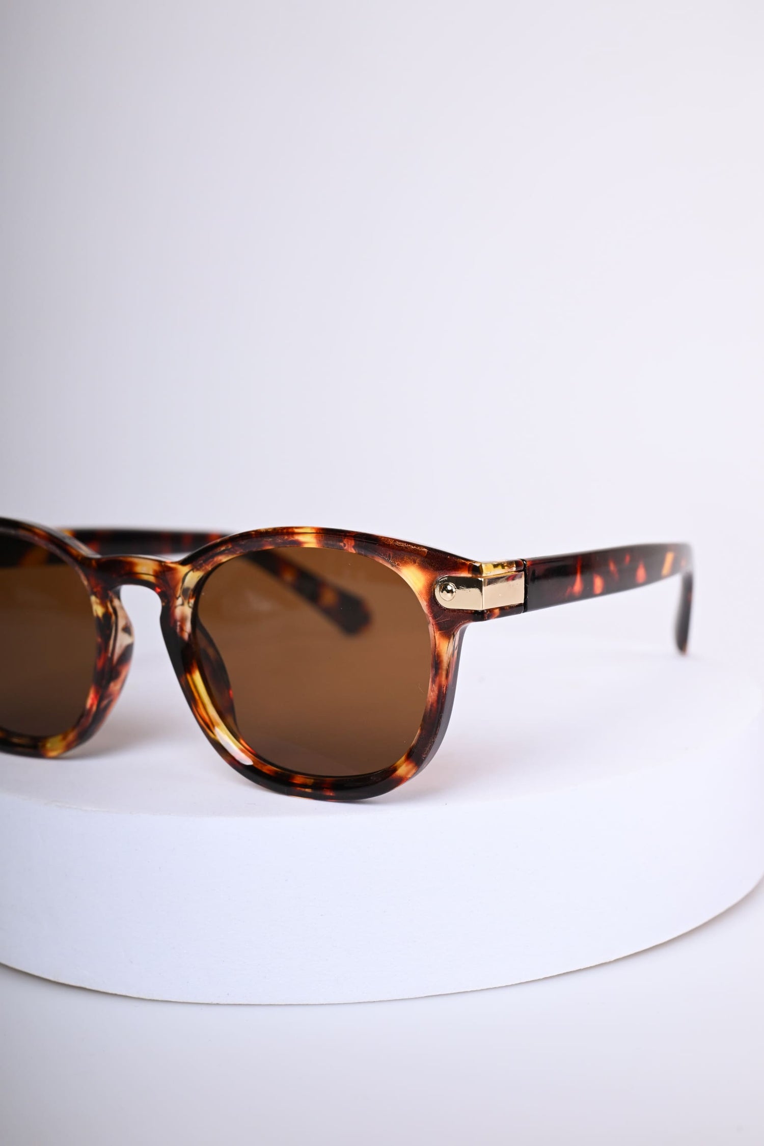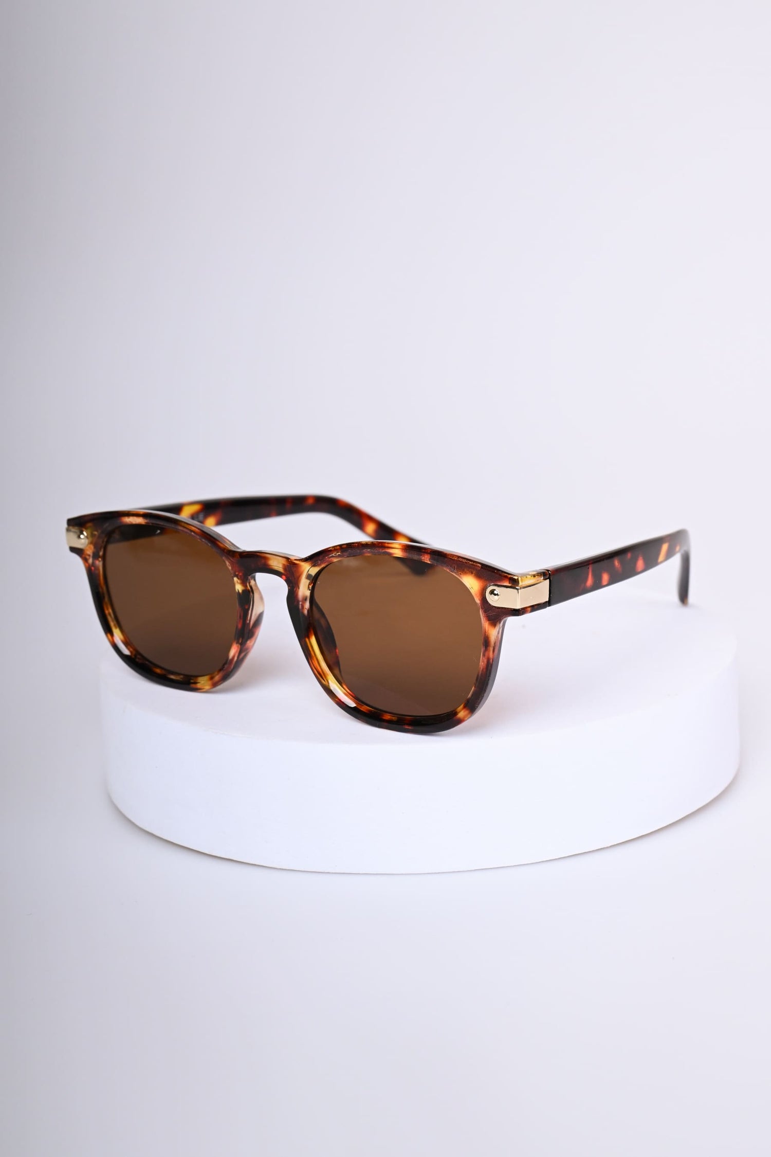 Occhiali da sole con montatura arrotondata in plastica effetto tartarugato nei toni del marrone, lenti scure e hardware in metallo dorato.