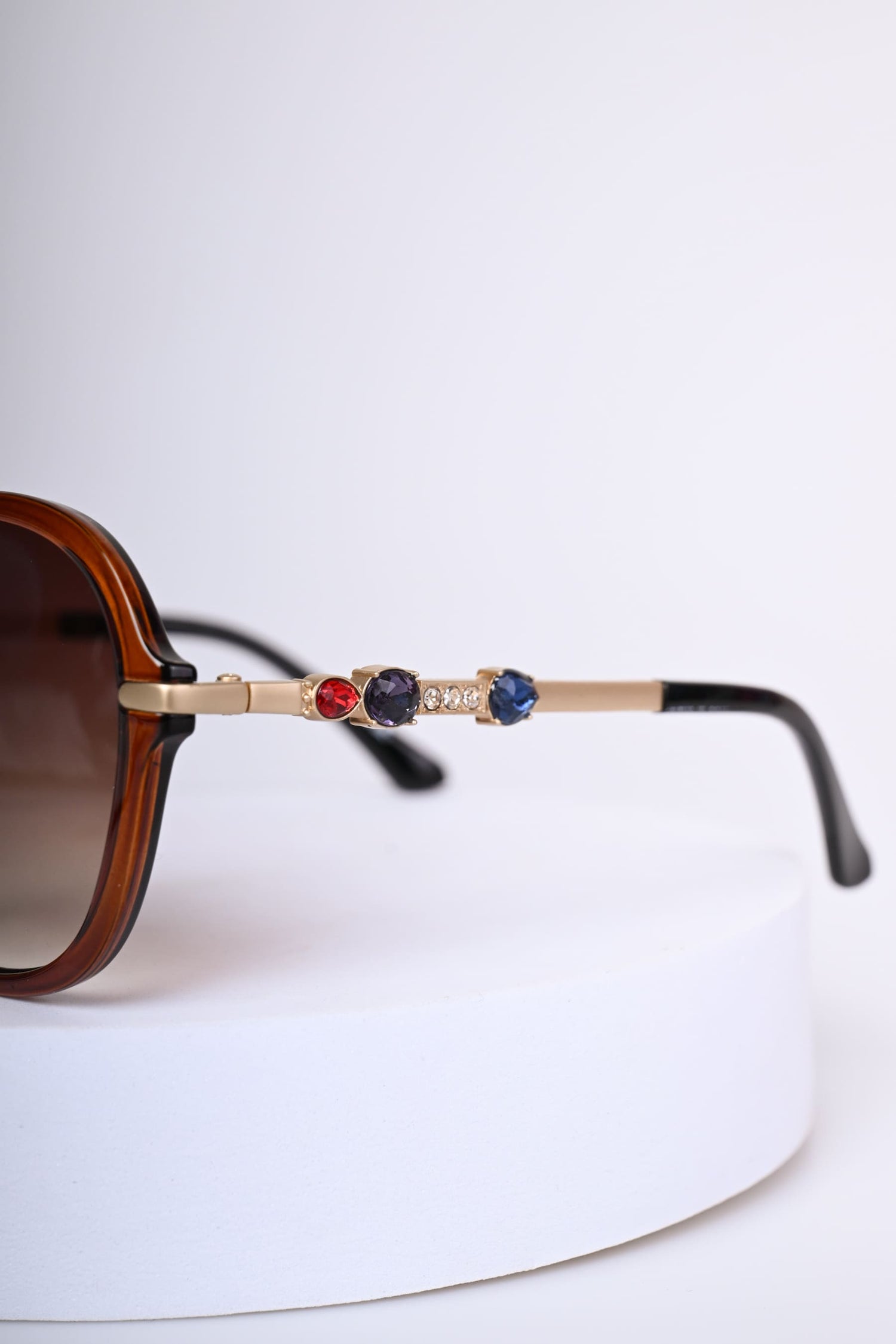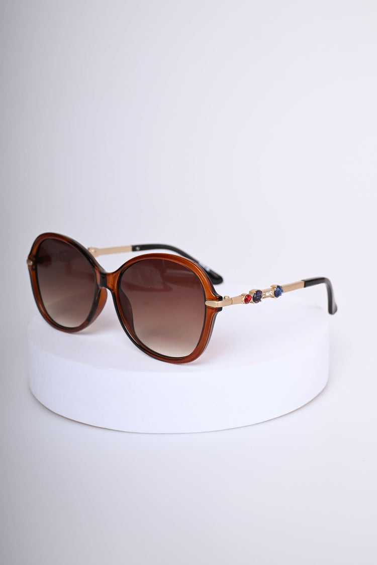Occhiali da sole arrotondati con montatura in plastica e metallo nei toni del marrone, oro e nero, strass decorativi multicolor lungo le aste e lenti scure sfumate.