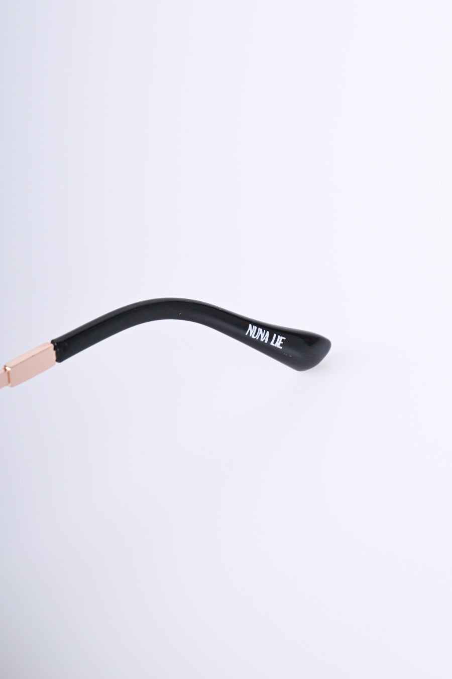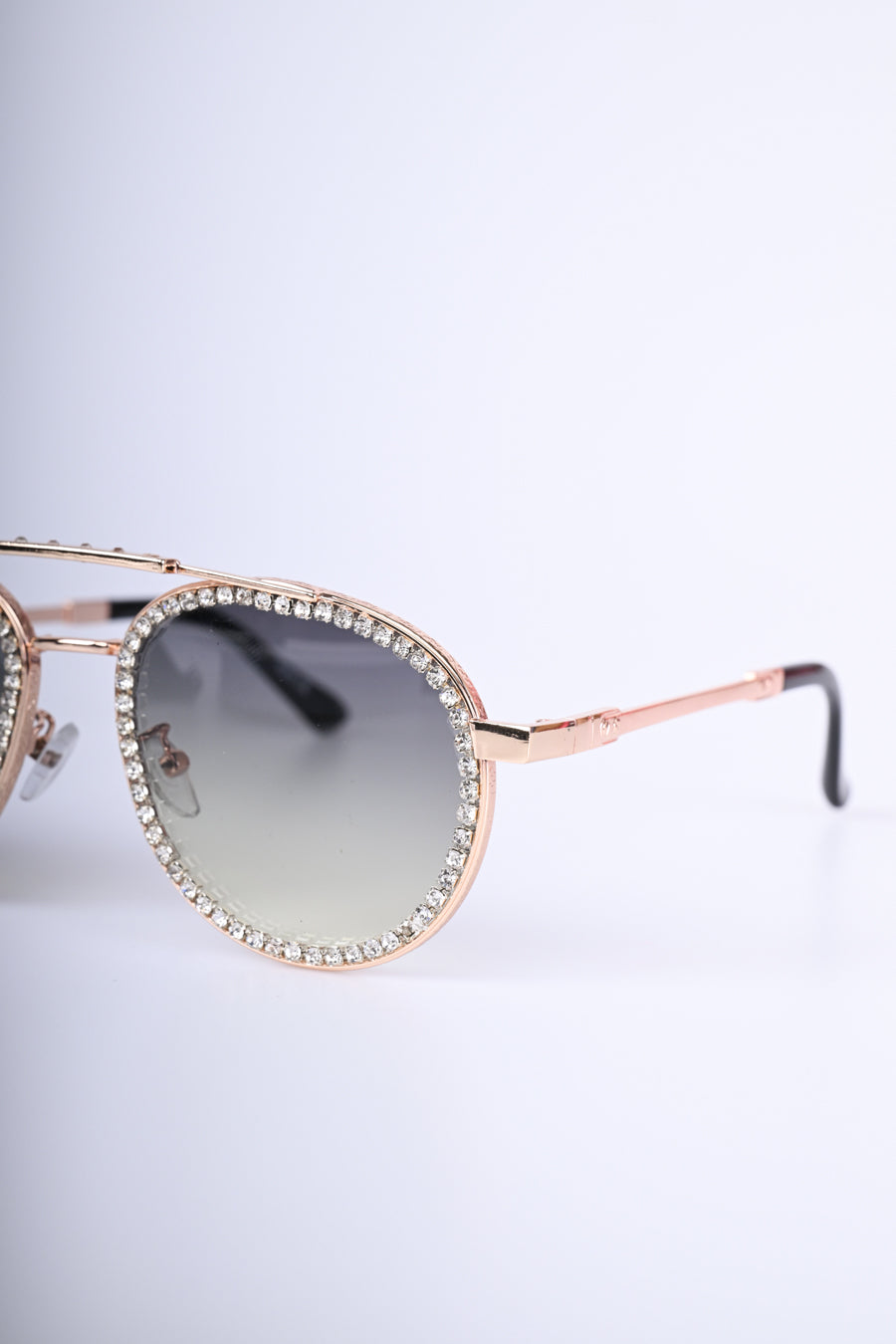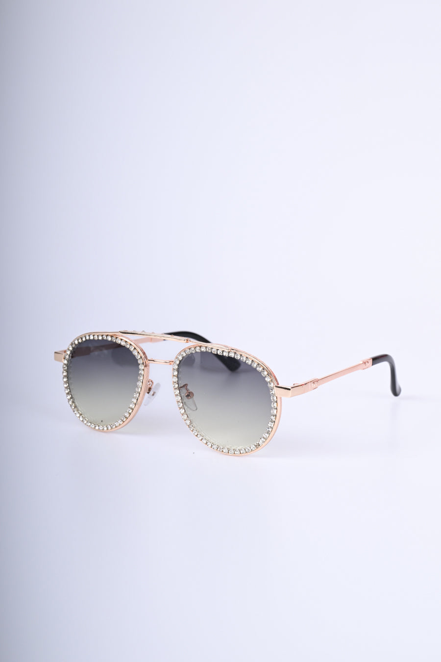 Occhiali da sole stile aviatore con montatura in metallo rosa, profilo delle lenti impreziosito da strass e logo lettering stampato allinterno dellasta.