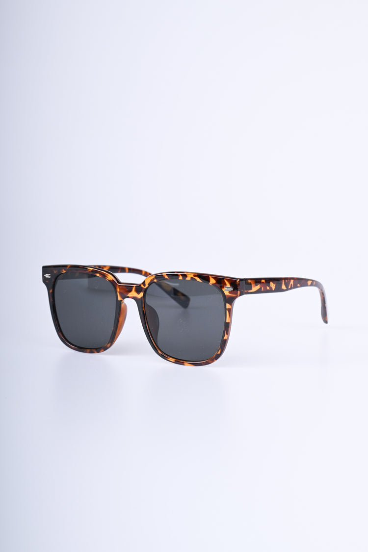 Occhiali da sole con montatura squadrata in plastica tartarugata nei toni del marrone e lenti scure.
