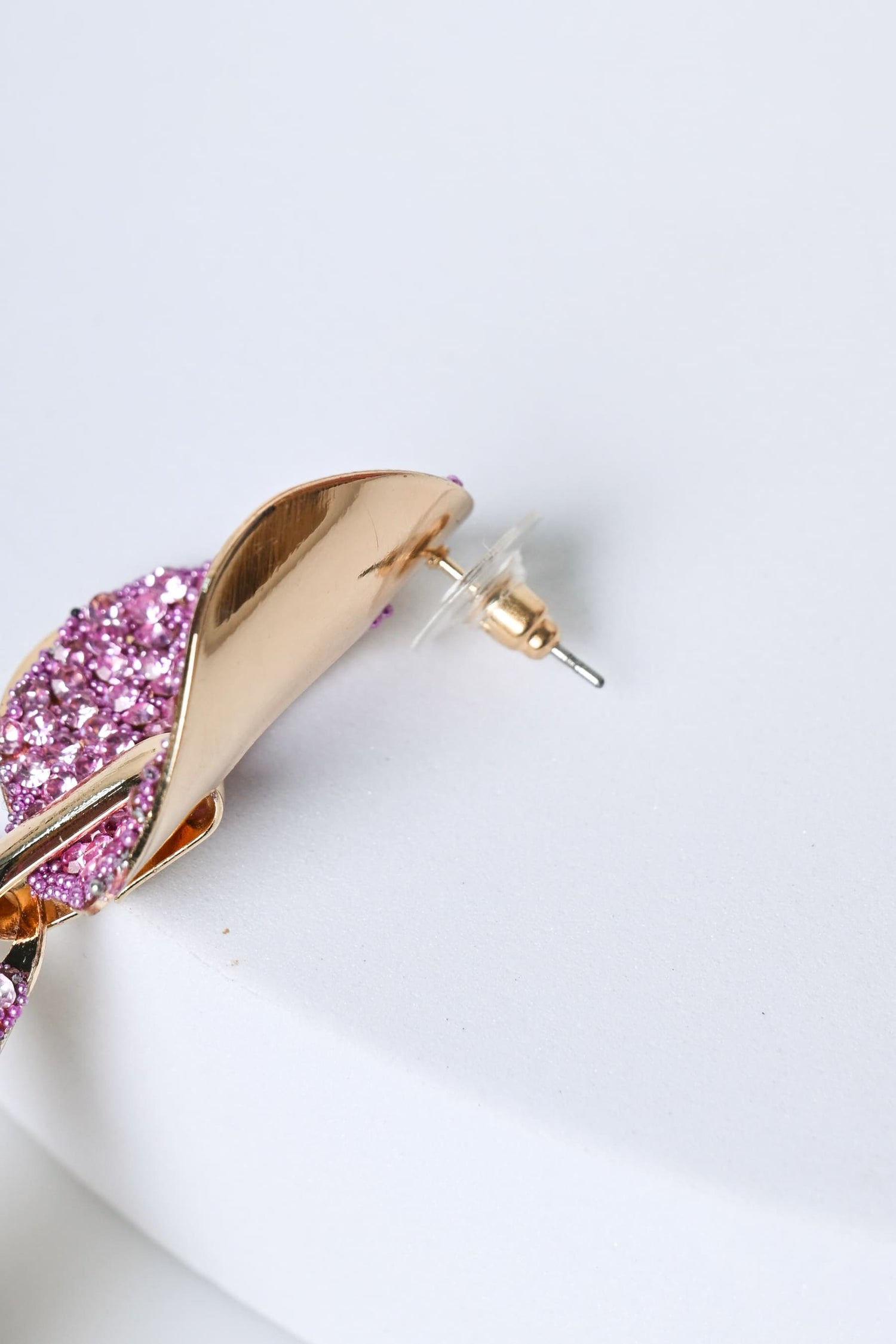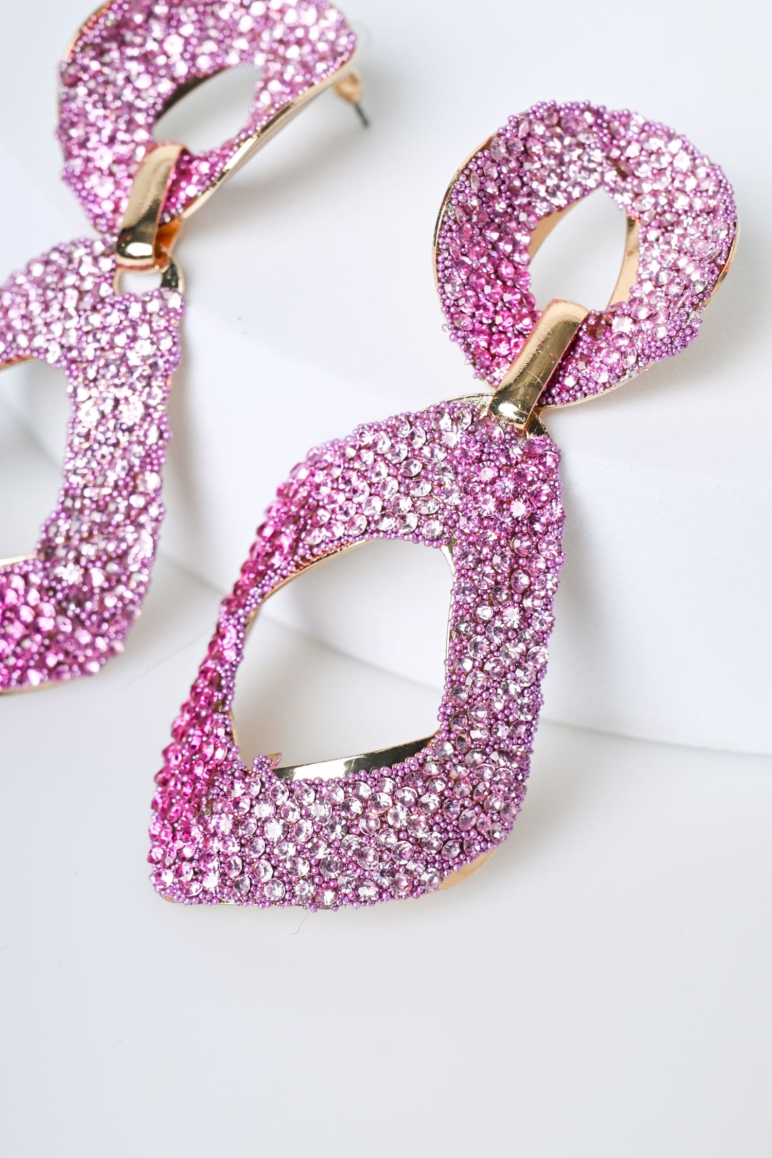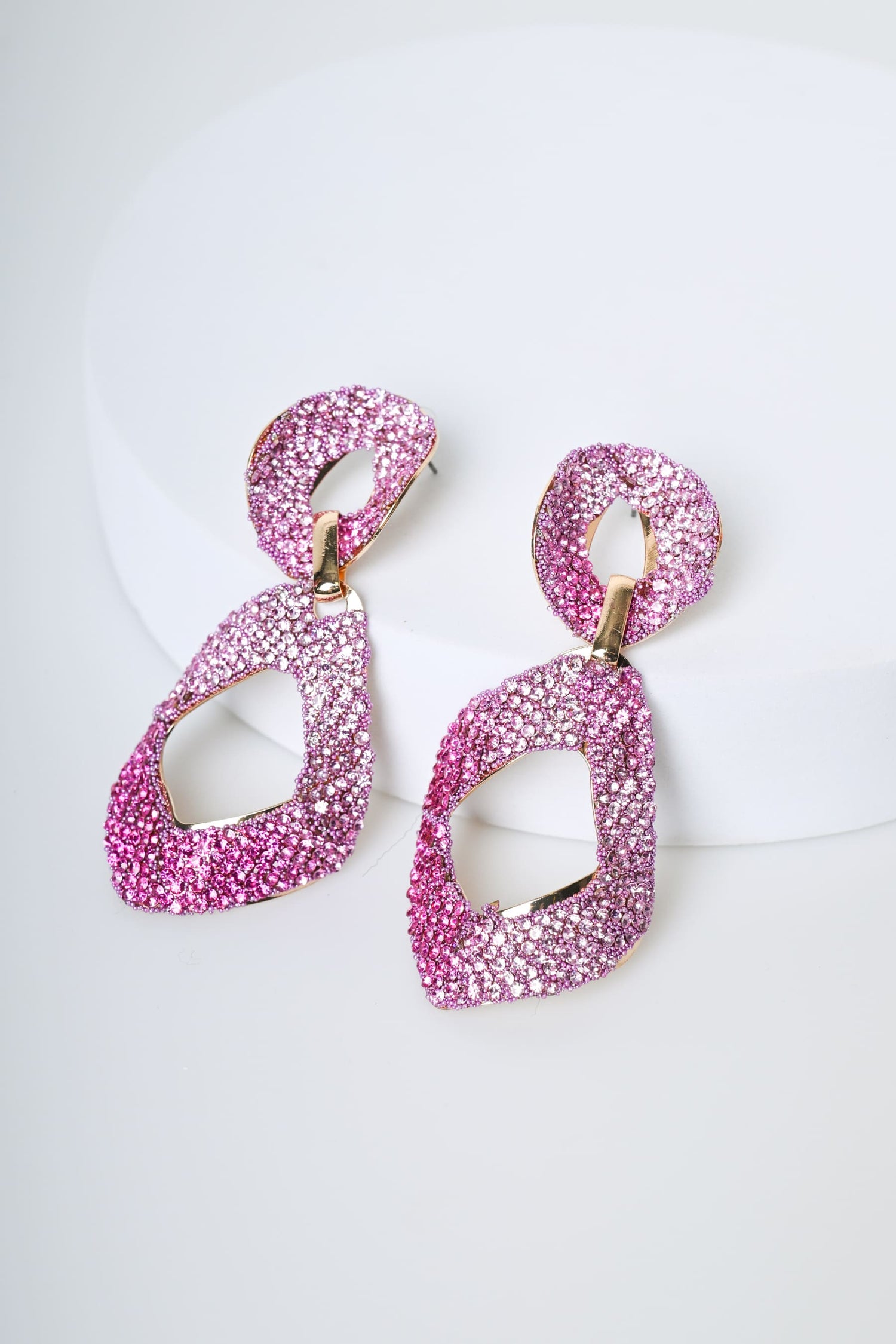 Orecchini geometrici in metallo dorato con strass decorativi nei toni del fucsia.