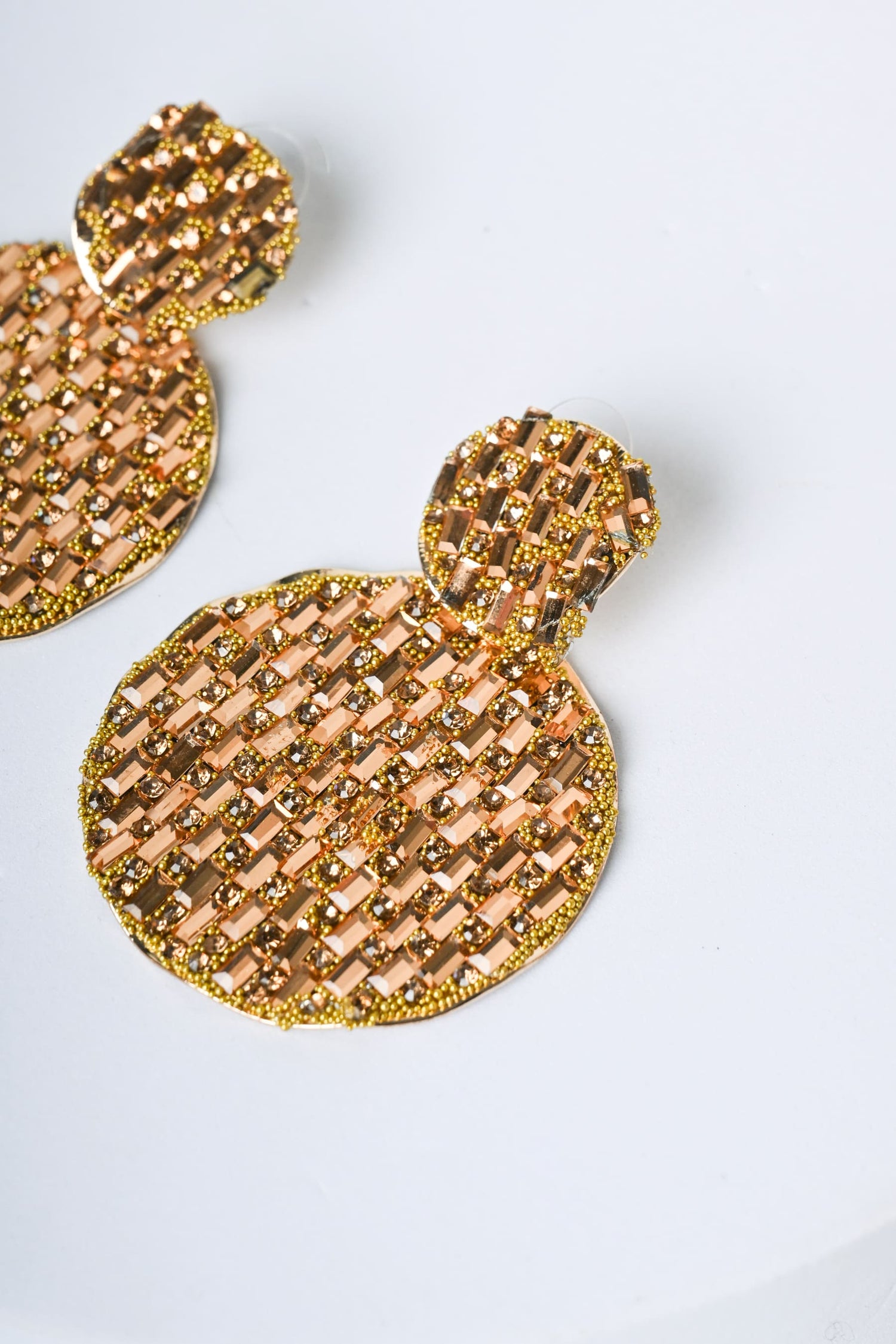 Orecchini in metallo dorato con doppi cerchi piatti impreziositi da cristalli e strass nei toni delloro e giallo.
