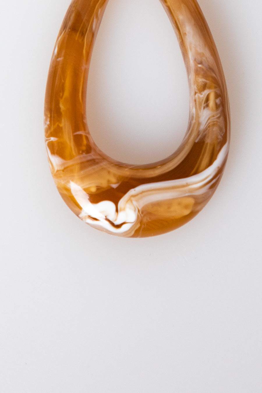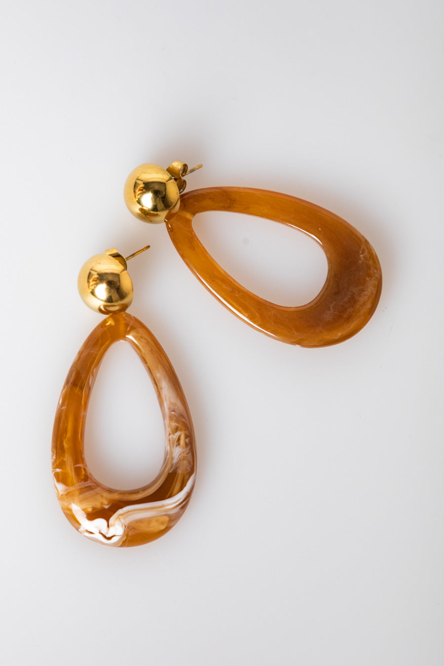 Orecchini in metallo dorato con pendenti oversize a goccia in plastica marmorizzata marrone chiaro e chiusura posteriore a farfalla.