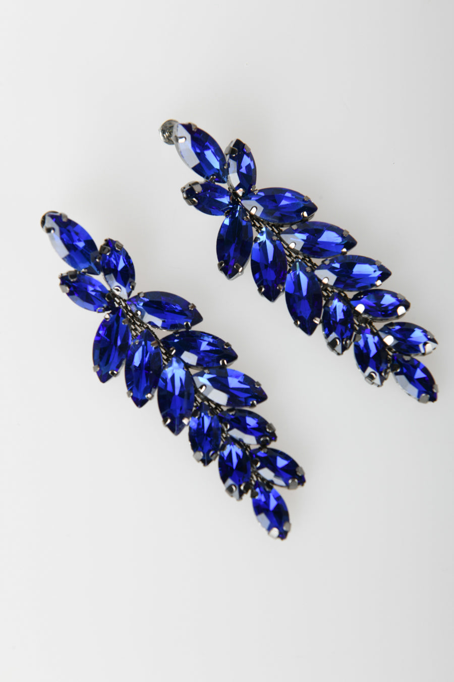 Orecchini lunghi in metallo argentato con cristalli decorativi blu.
