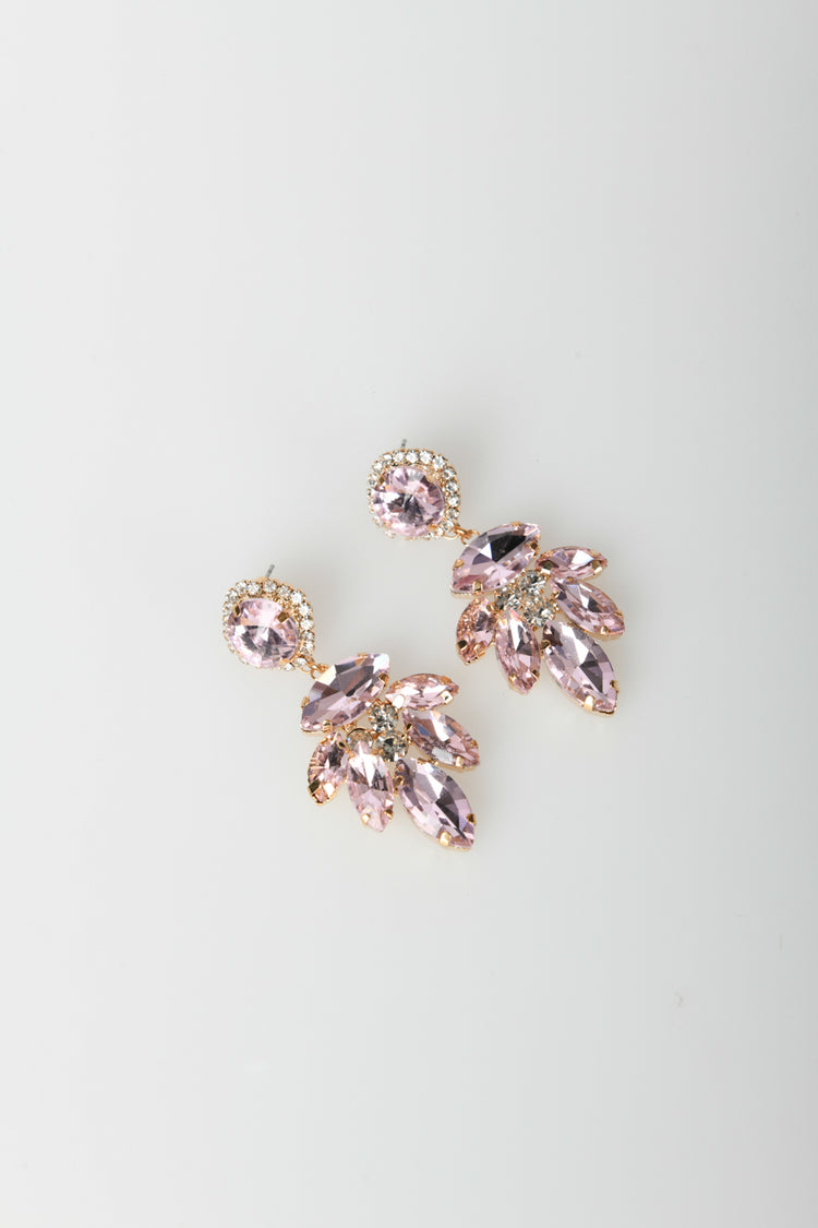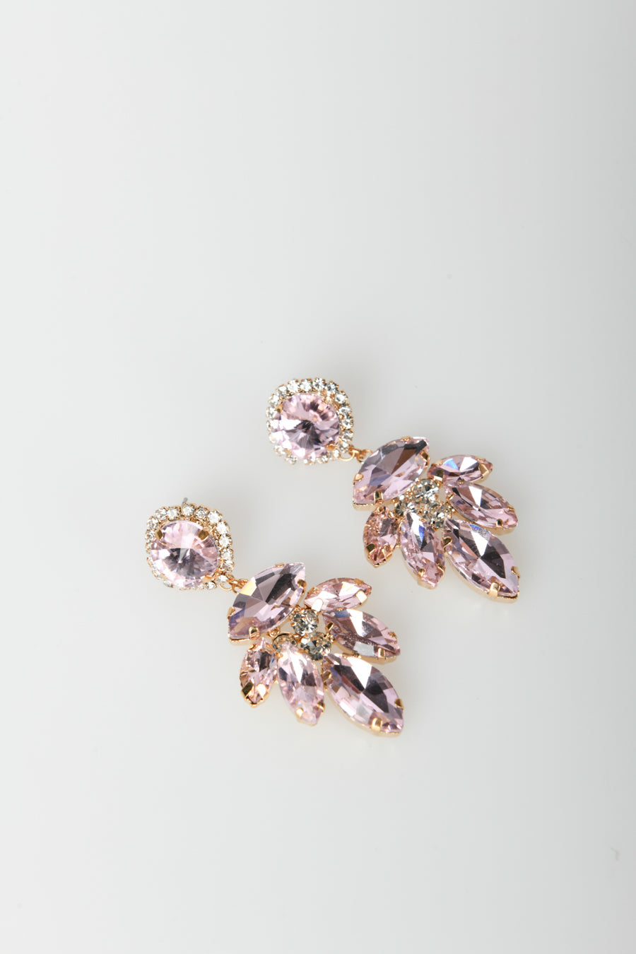 Orecchini in metallo dorato con pendente foliage in cristalli rosa.