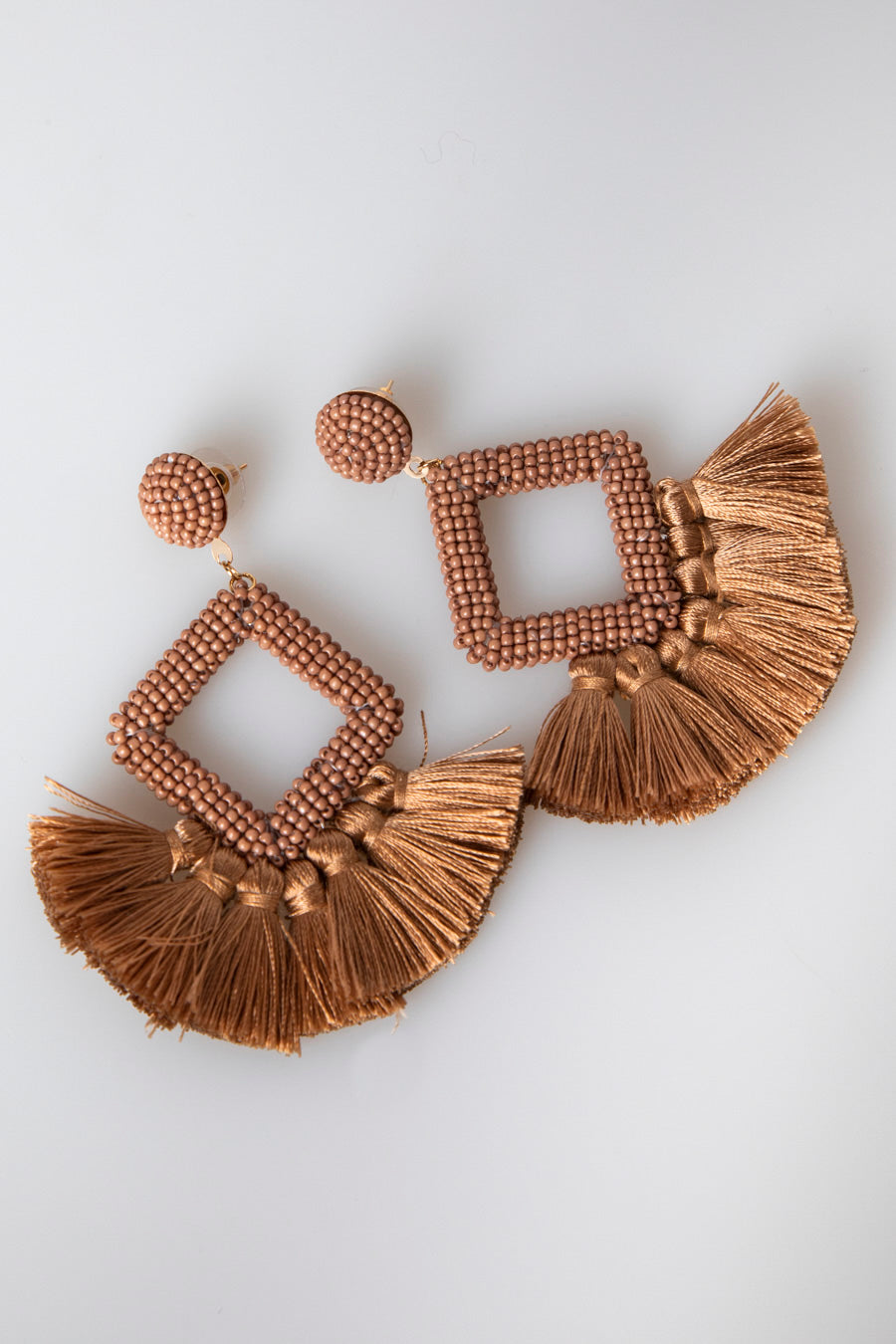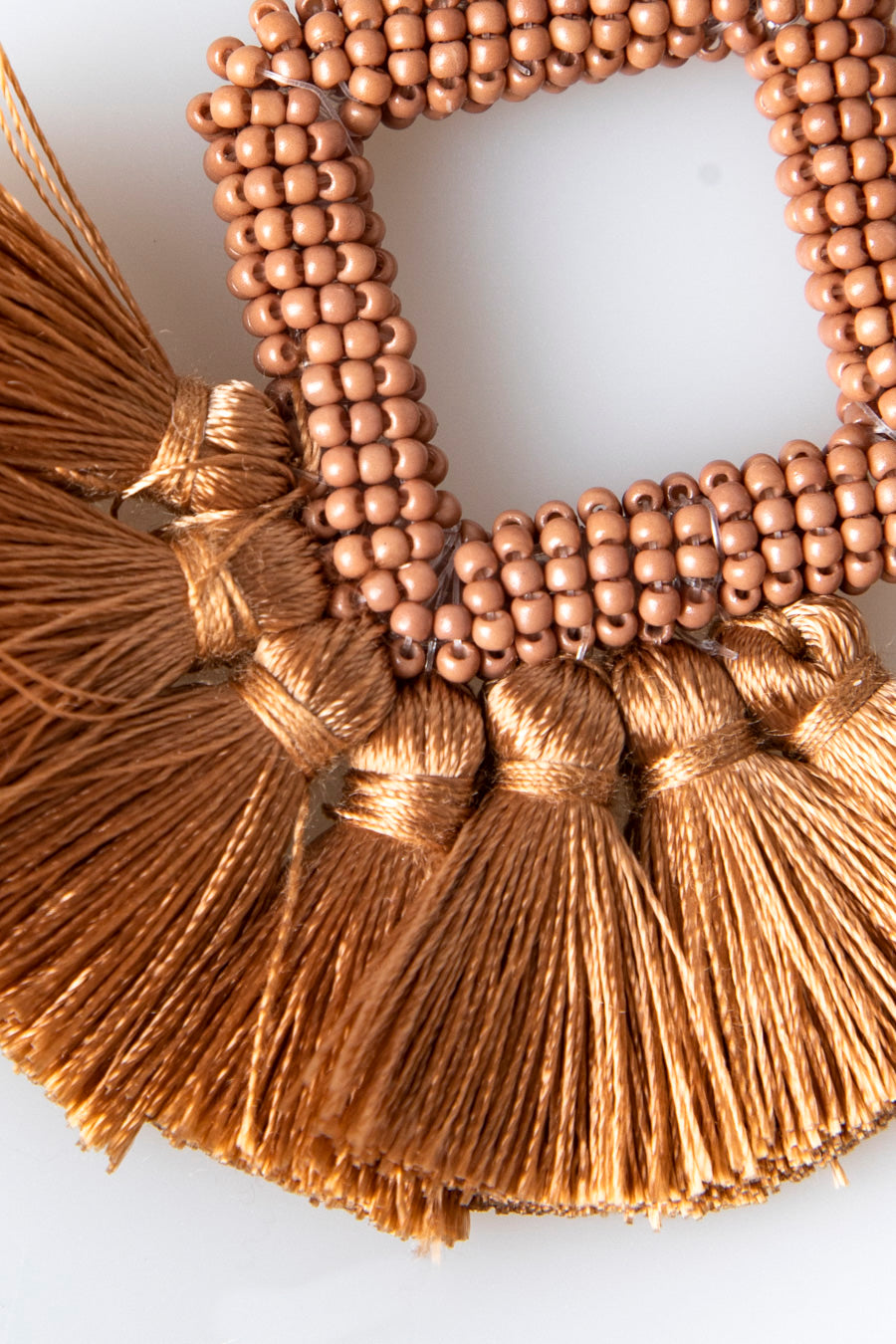Orecchini in metallo dorato con perline marrone chiaro e pendenti a rombo impreziosito da nappe sfrangiate.