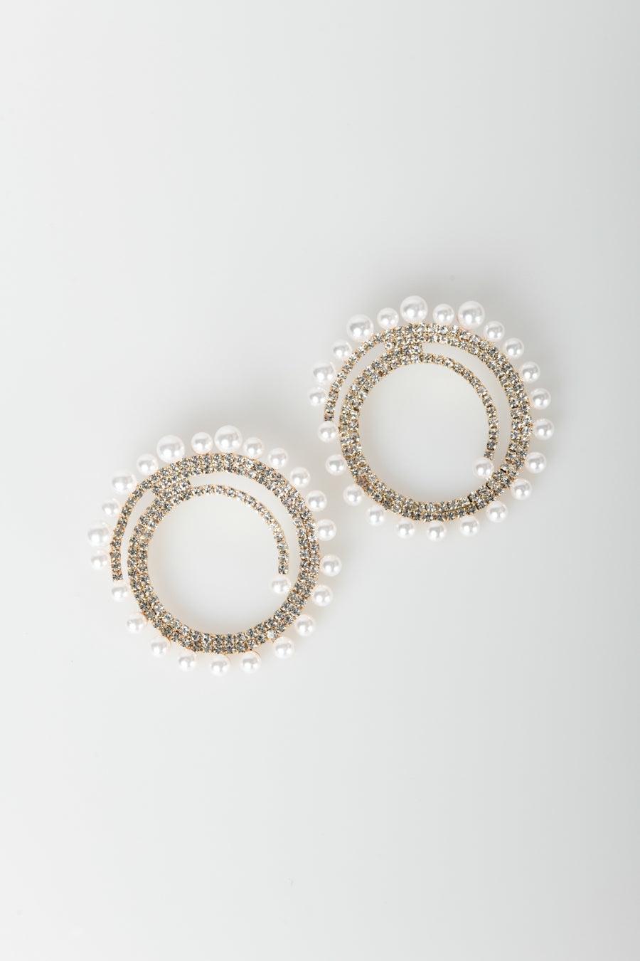 Orecchini a spirale in metallo dorato con cristalli e perle decorative bianche.