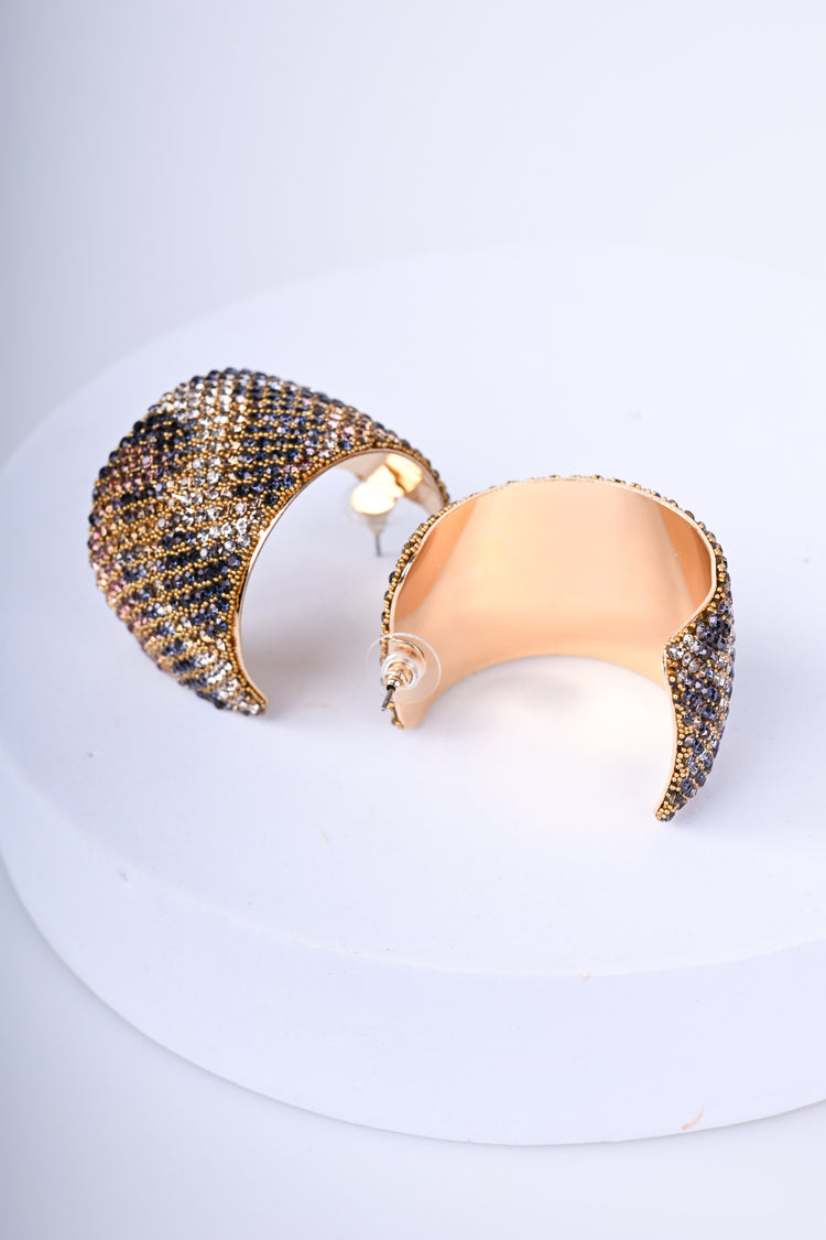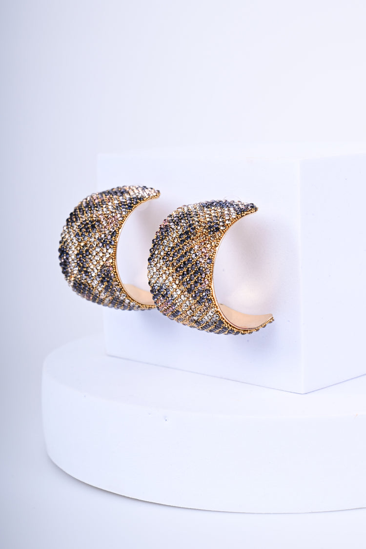 Orecchini a fascia arrotondata in metallo dorato impreziositi da strass a motivo animalier multicolor e con chiusura a farfalla.