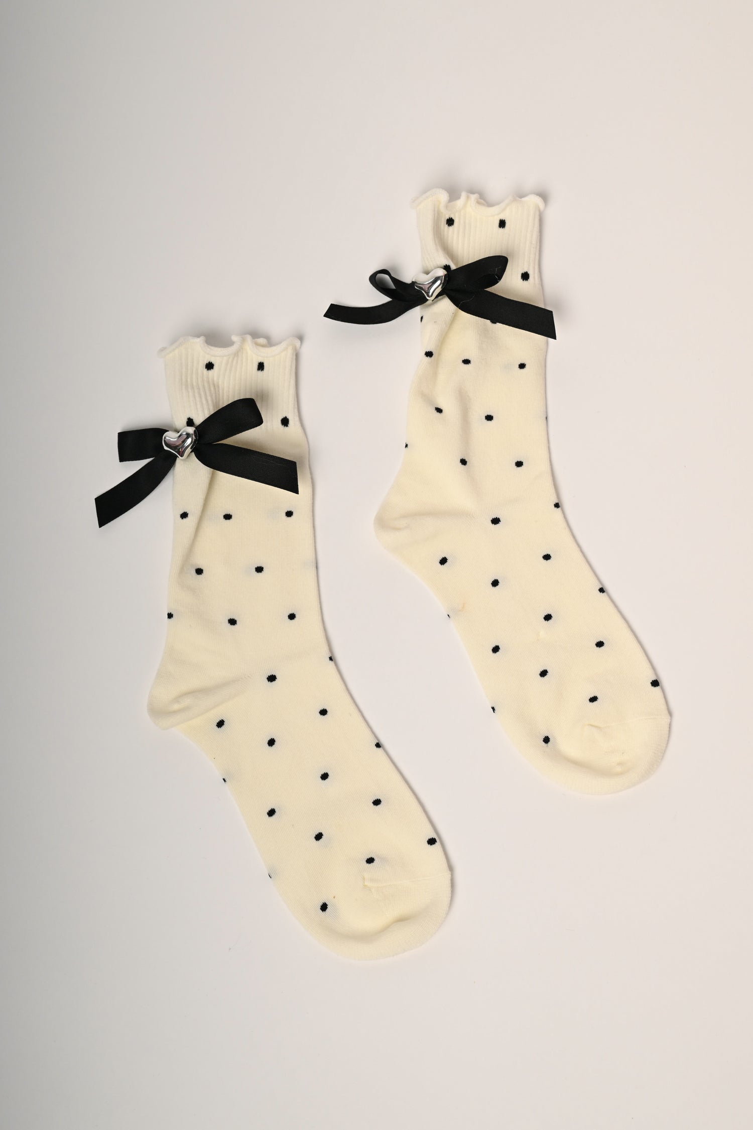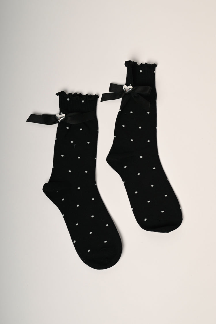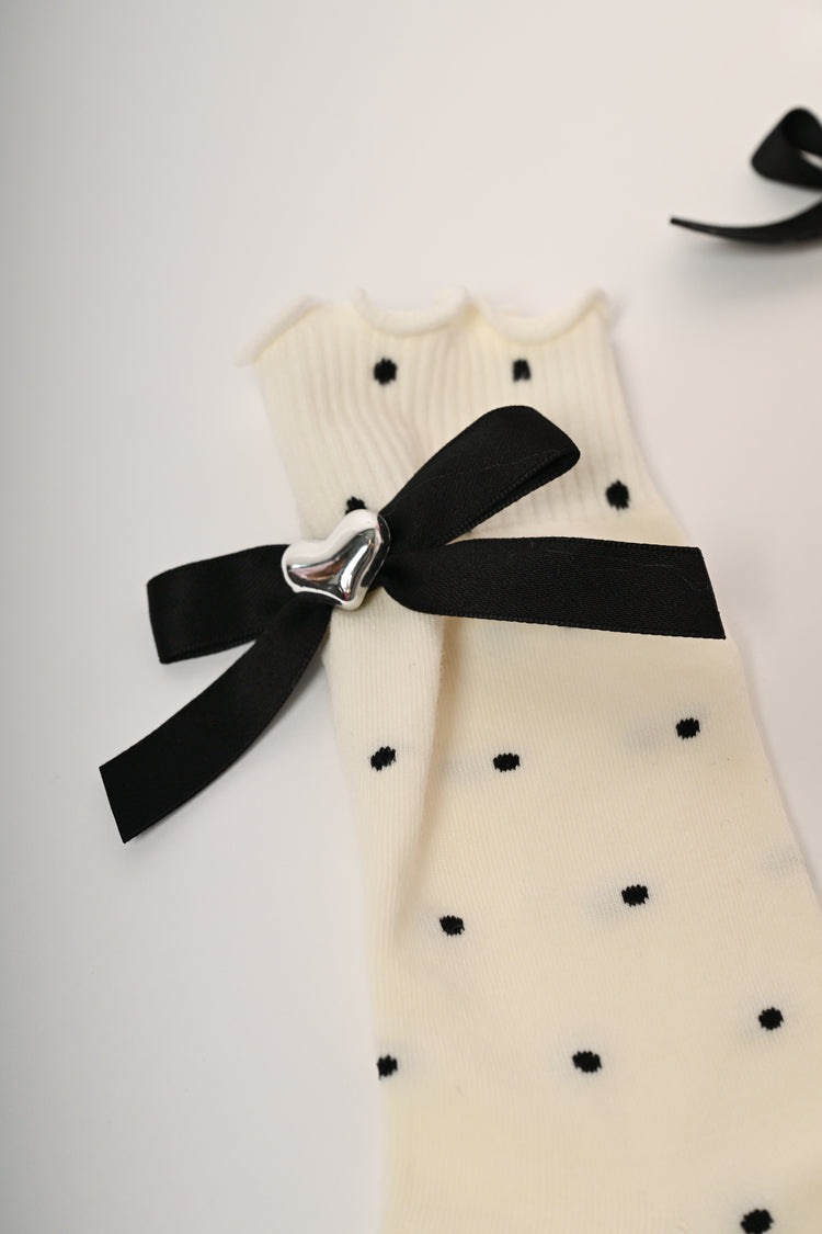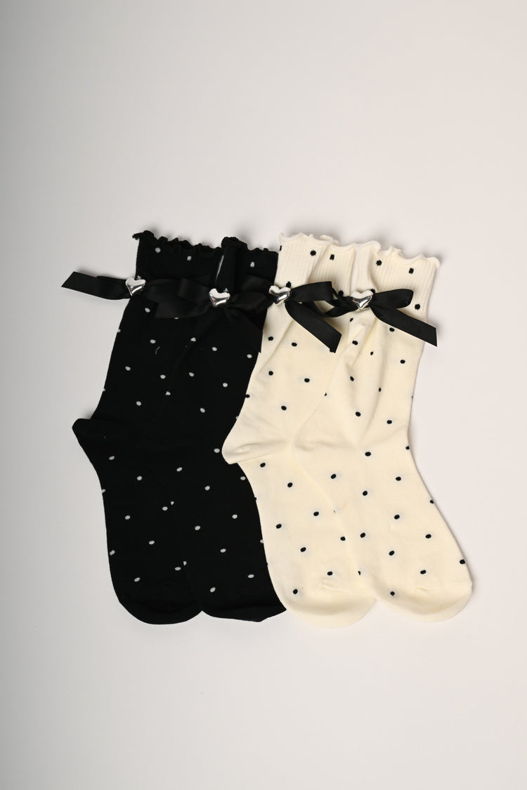 Set da due paia di calzini corti in maglia misto cotone stretch a pois, uno nero e uno avorio con fiocchetti decorativi neri impreziositi da un cuore in metallo argentato e orli ondulati.