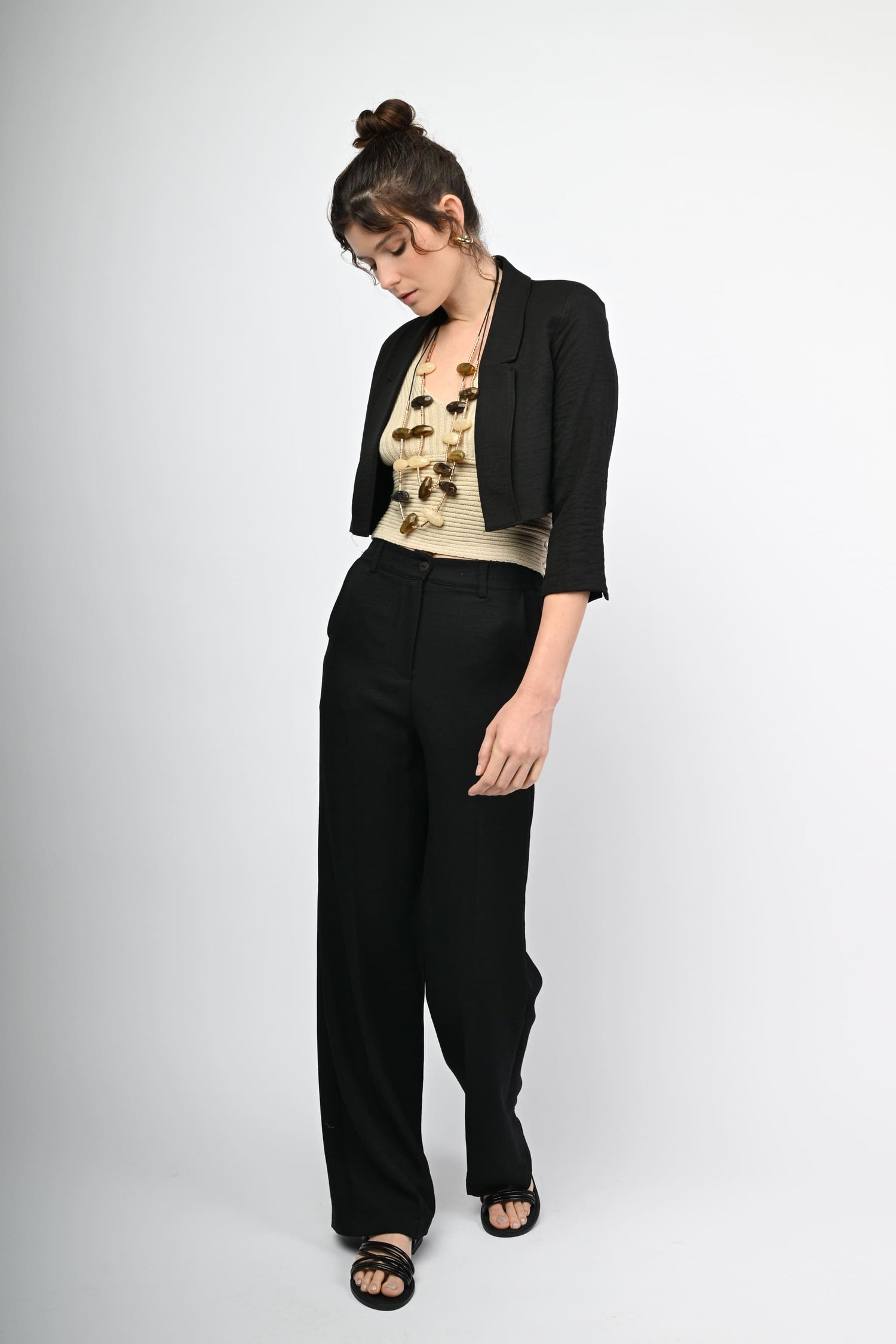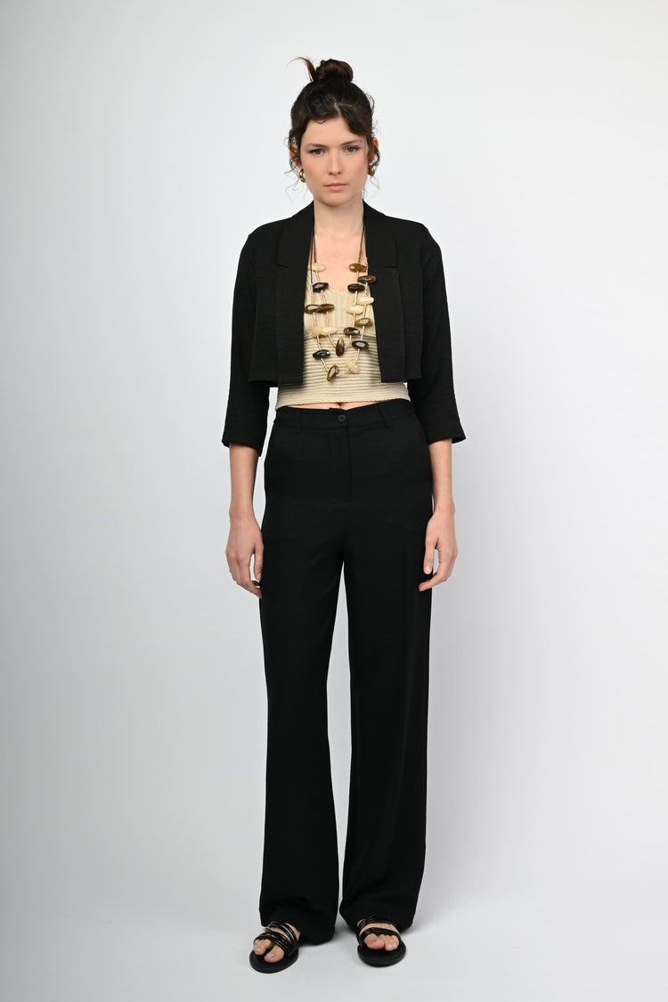 Pantaloni palazzo in tessuto nero con vita elasticizzata sul retro, passanti per cintura, chiusura con bottone e zip, tasche laterali e piega stirata.
