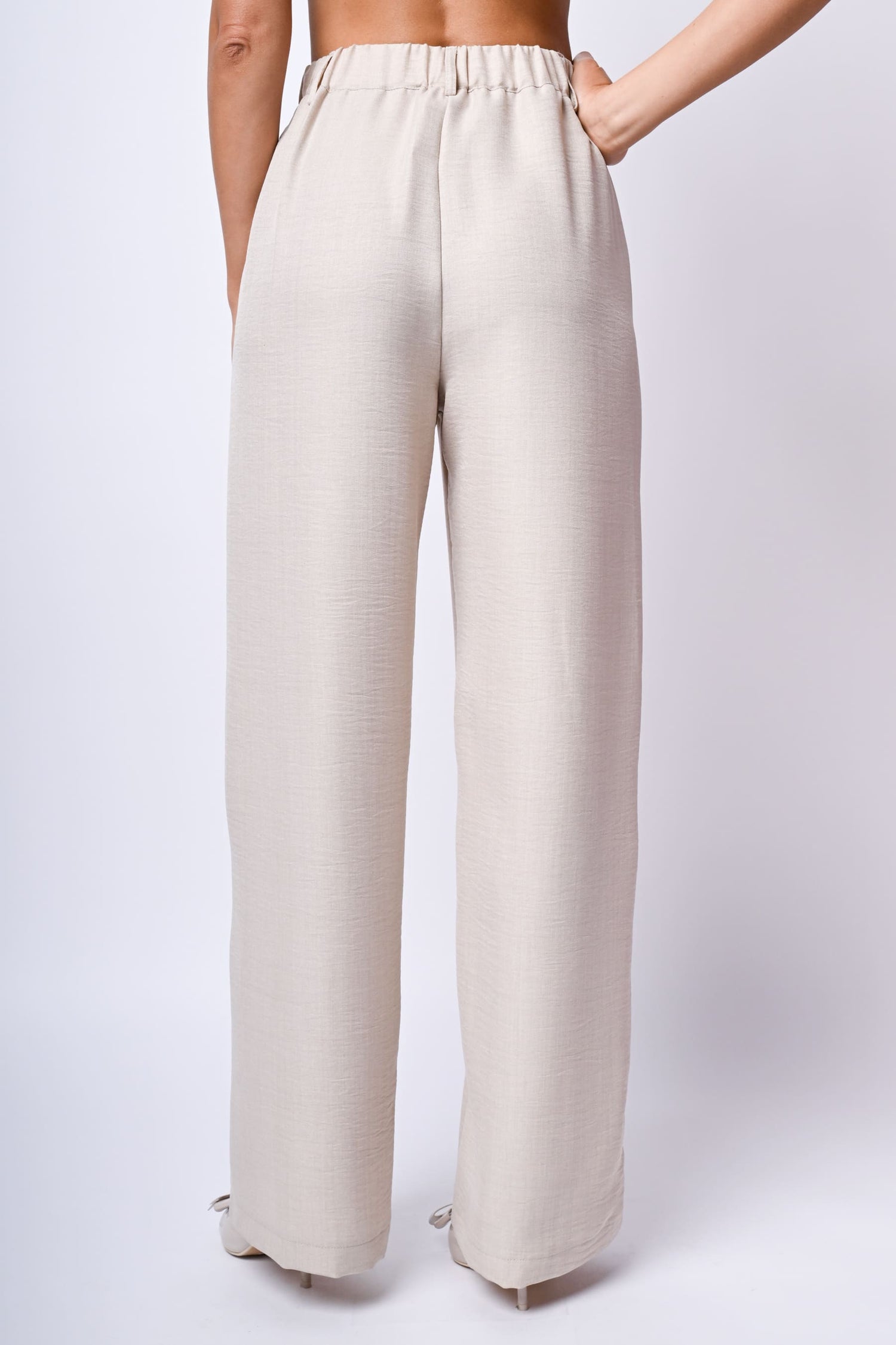 Pantaloni palazzo in tessuto fiammato avorio con vita alta elasticizzata sul retro, passanti per cintura, chiusura con bottone e zip, tasche laterali e piega stirata.