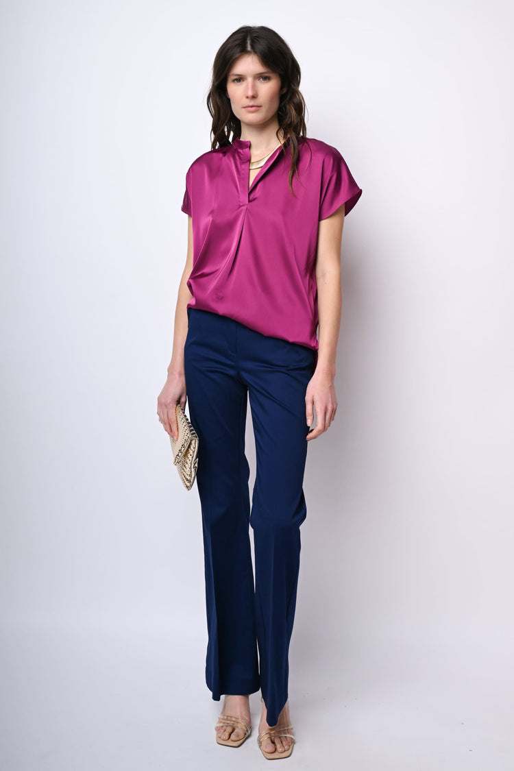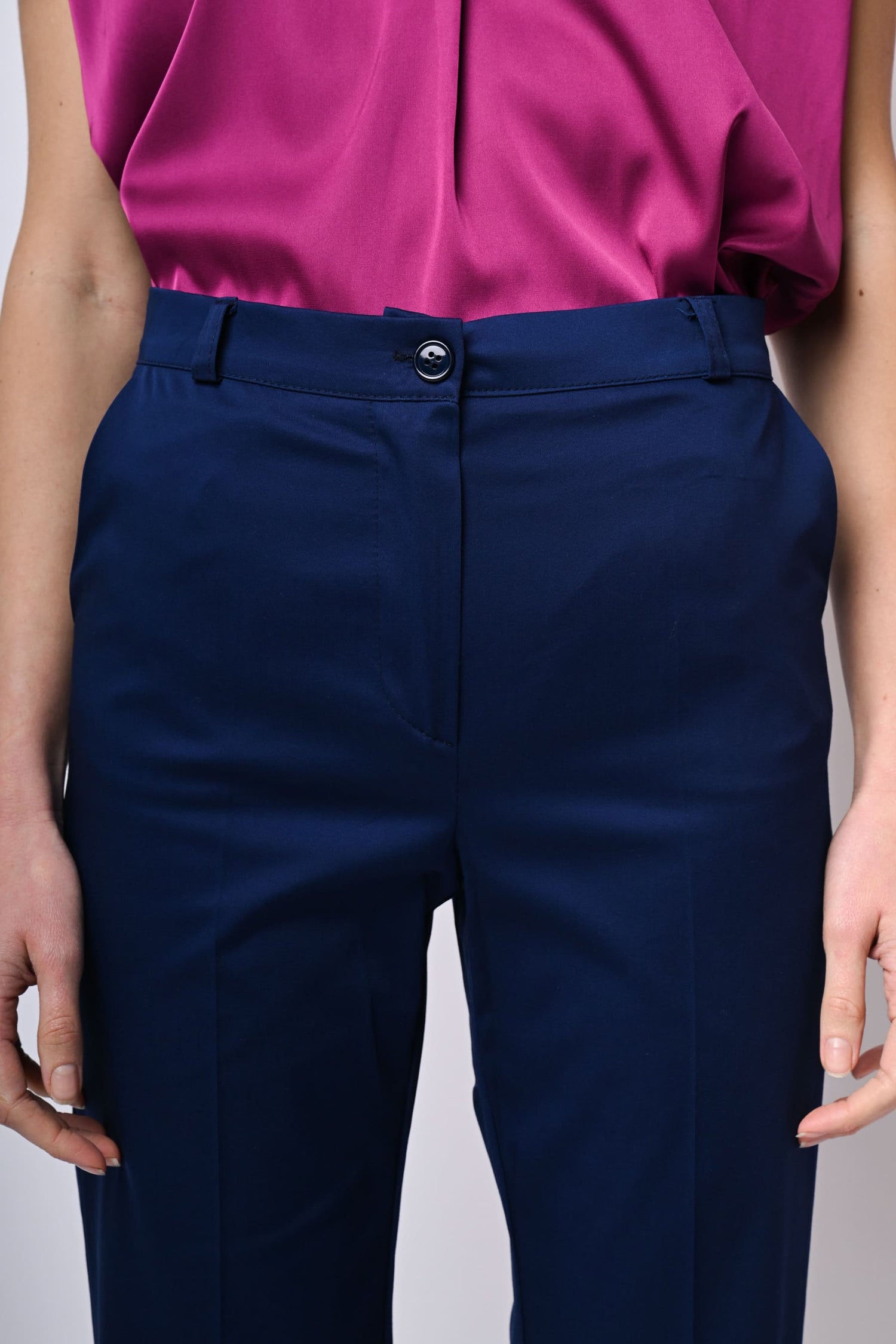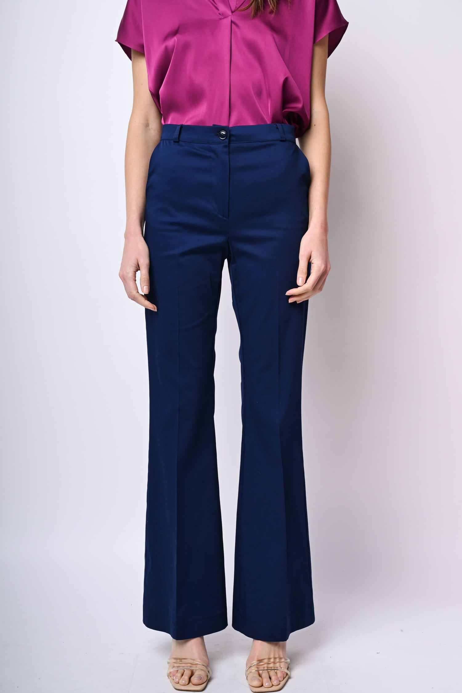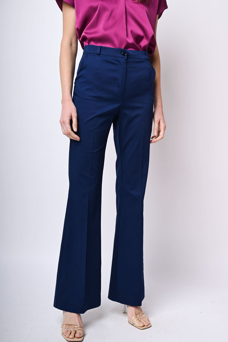 Pantaloni in cotone stretch blu con passanti per cintura, chiusura con bottone e zip, tasche laterali e gamba svasata con piega stirata.