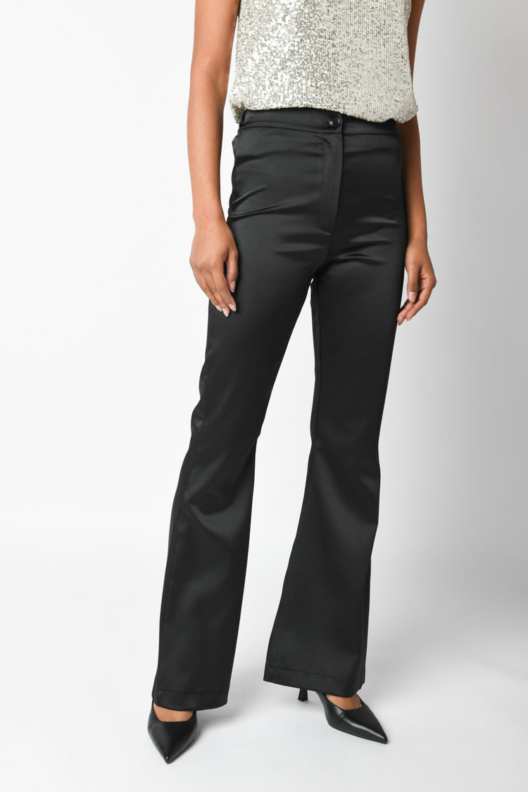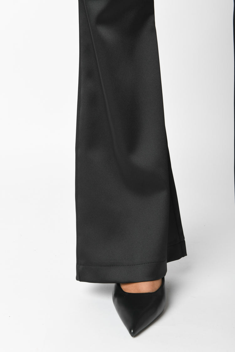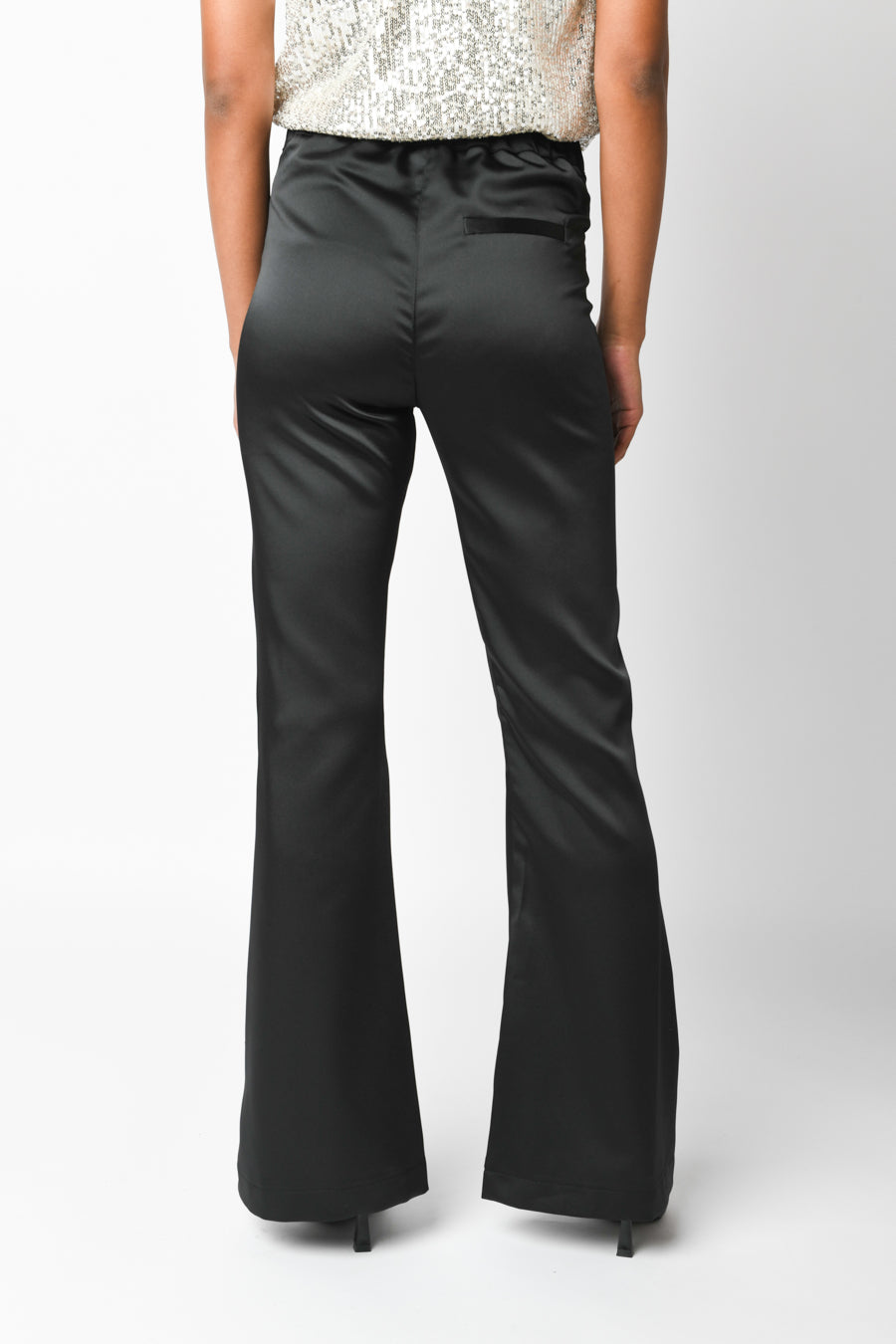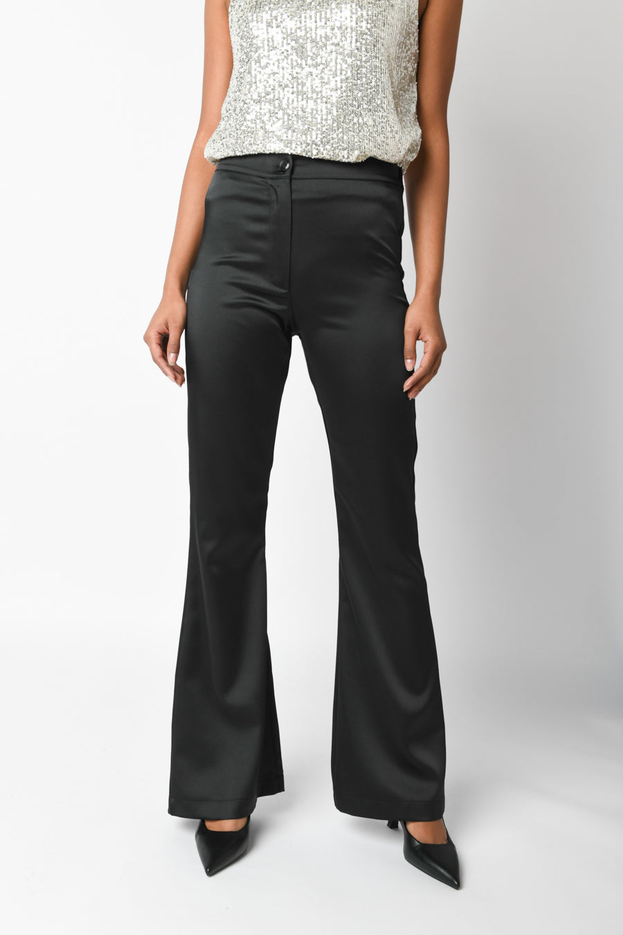 Pantaloni in raso stretch nero con vita alta elasticizzata sul retro, chiusura con bottone e zip e gamba svasata.