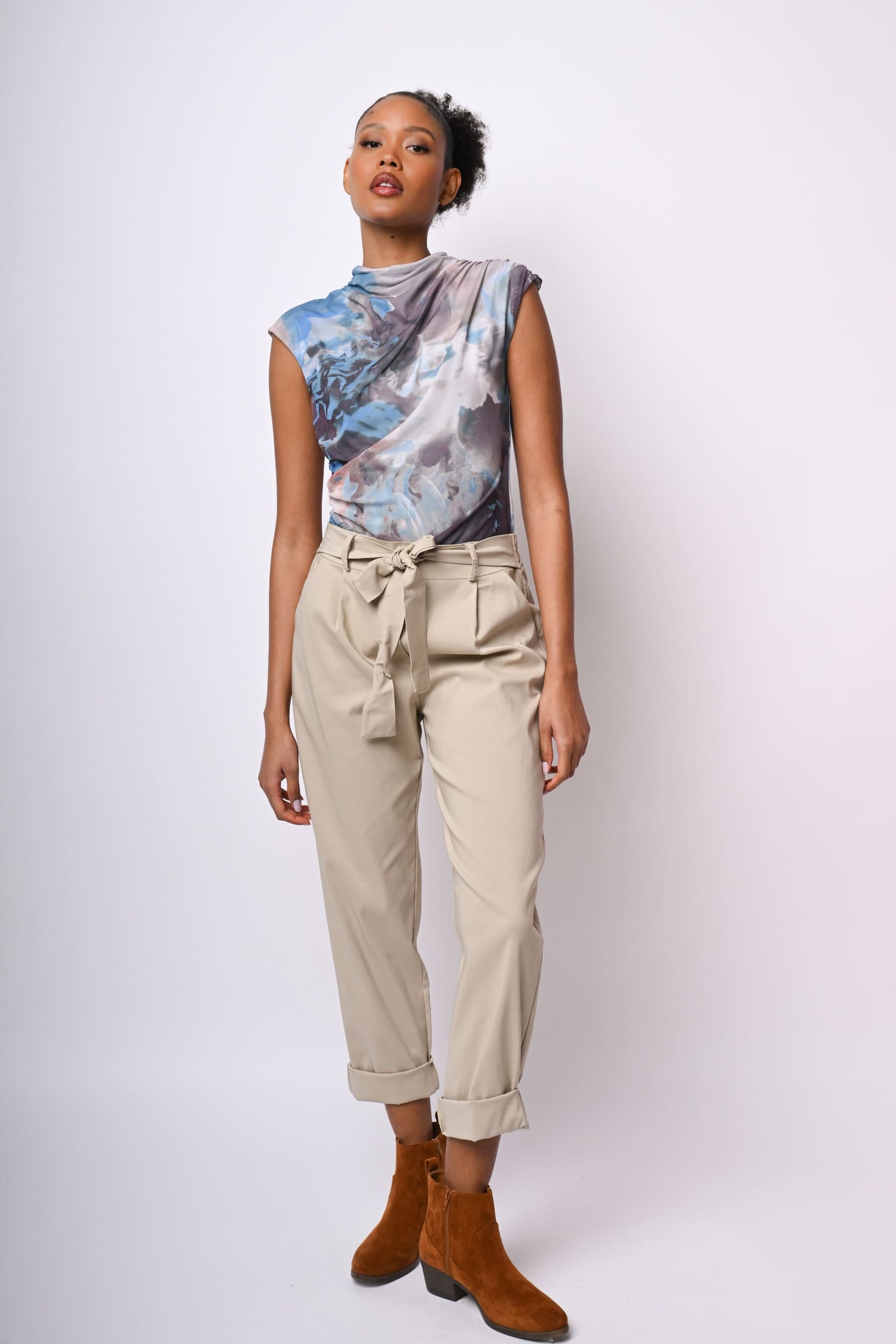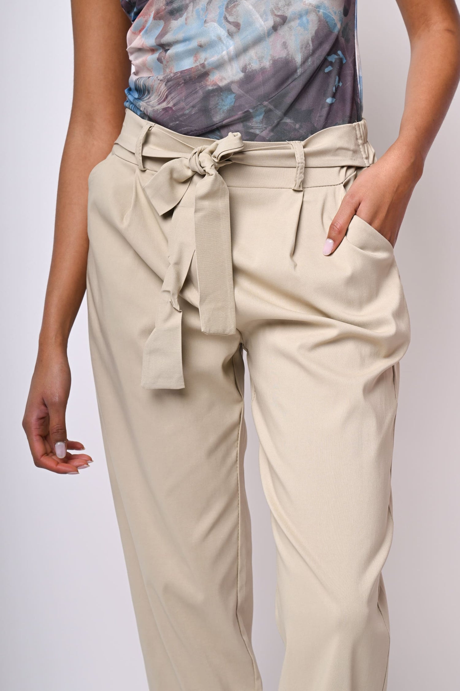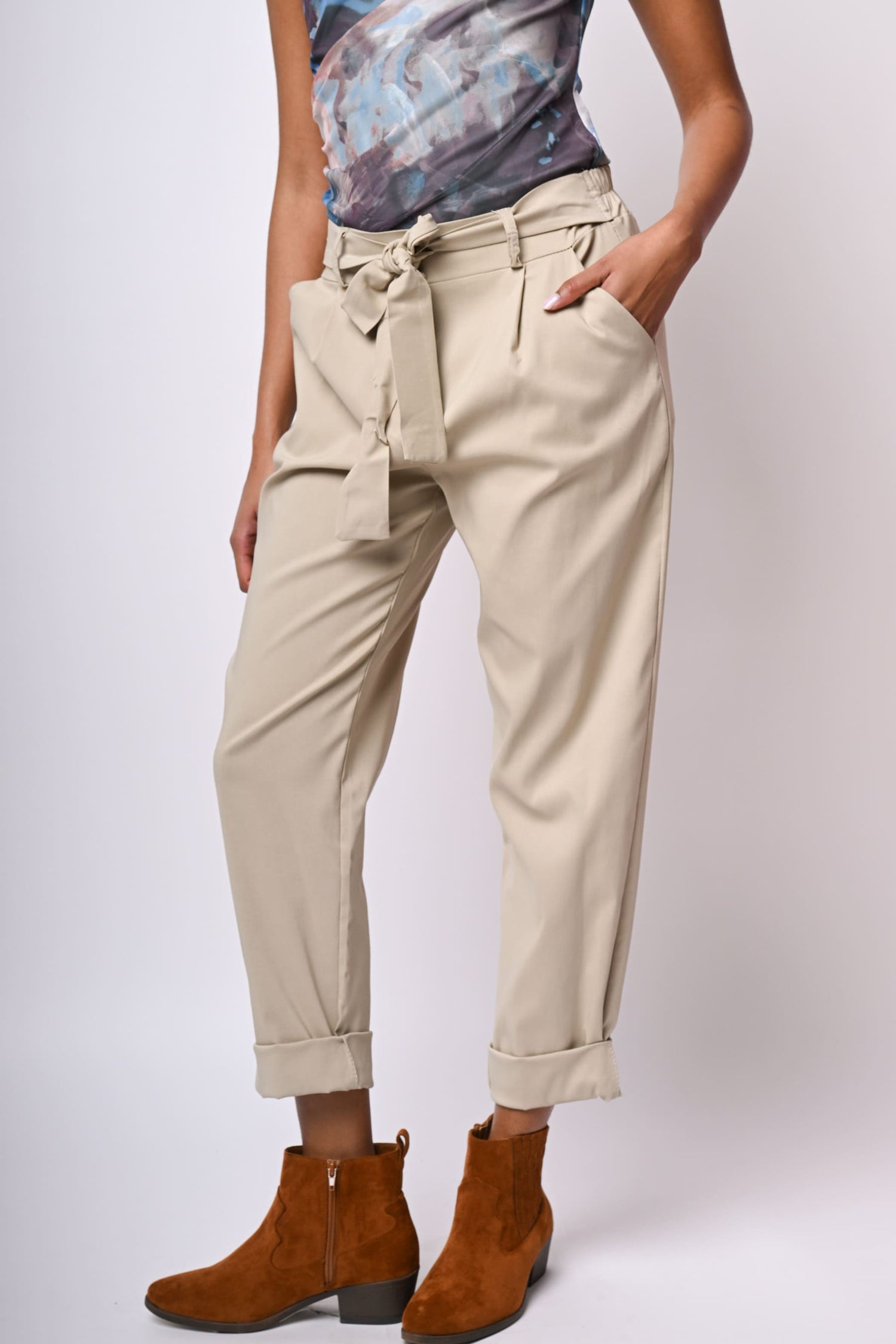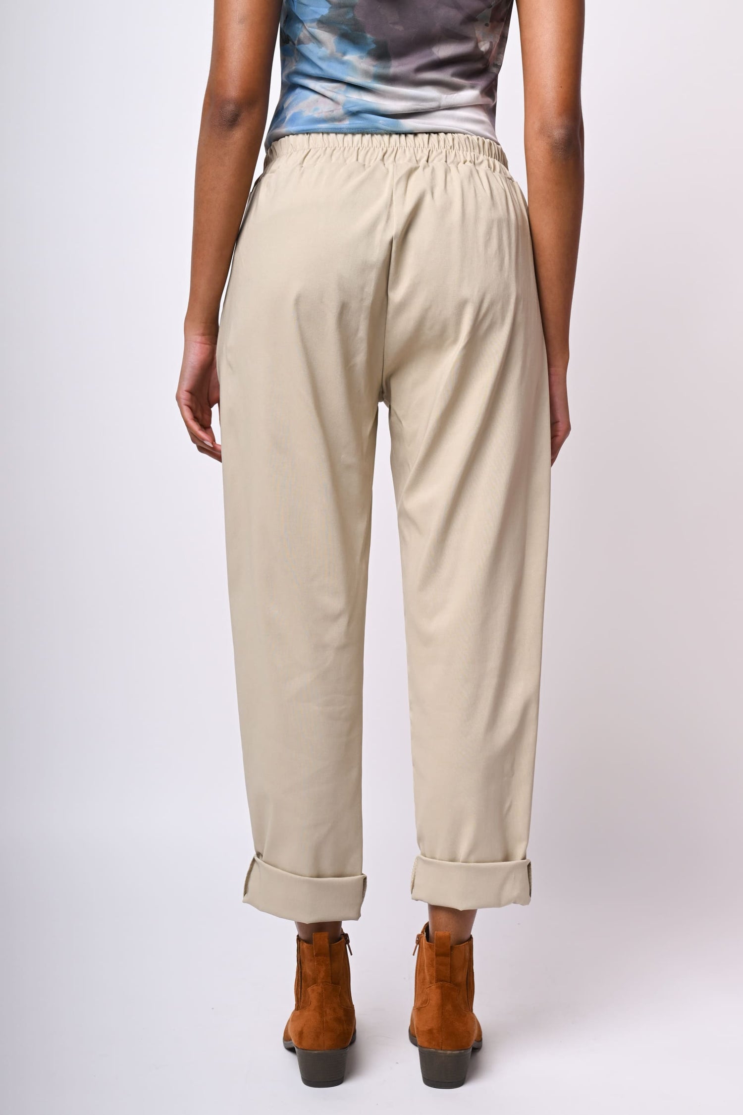Pantaloni misto viscosa stretch beige con vita elasticizzata, cintura coordinata da annodare, tasche laterali, pinces frontali e gamba leggermente morbida con risvolto allorlo.